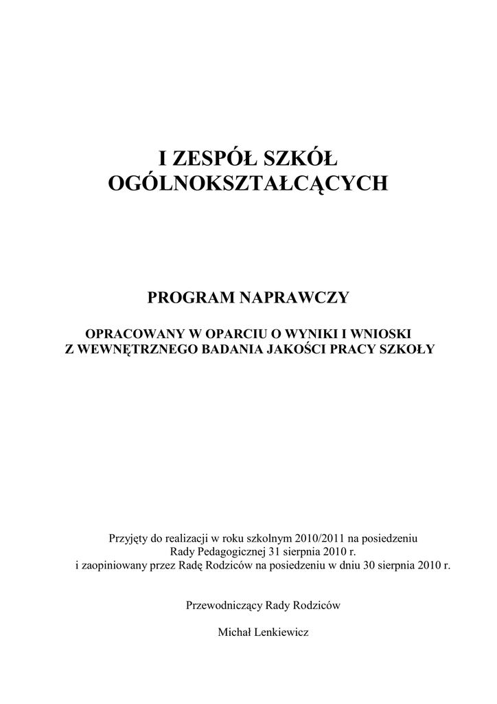 I ZESPÓŁ SZKÓŁ OGÓLNOKSZTAŁCĄCYCH PROGRAM NAPRAWCZY OPRACOWANY W OPARCIU O WYNIKI I WNIOSKI Z WEWNĘTRZNEGO BADANIA JAKOŚCI PRACY SZKOŁY Przyjęty do realizacji w roku szkolnym 2010/2011 na posiedzeniu Rady Pedagogicznej 31 sierpnia 2010 r. i zaopiniowany przez Radę Rodziców na posiedzeniu w dniu 30 sierpnia 2010 r. Przewodniczący Rady Rodziców Michał Lenkiewicz Zgodnie z planem pracy zespół do badania wybranych obszarów pracy szkoły przeprowadził w roku szkolnym 2009/2010 testy diagnostyczne w klasach pierwszych i drugich z wybranych przedmiotów oraz próbne egzaminy maturalne. • • 1.W I semestrze roku szkolnego 2009/2010 zostały przygotowane i przeprowadzone testy diagnostyczne, badające stan wiedzy uczniów klas pierwszych z : języka polskiego we wszystkich klasach pierwszych – 18.09. 2009, języka obcego (kontynuacja nauki w liceum) we wszystkich klasach pierwszych – 11.09.2009, • matematyki we wszystkich klasach pierwszych – 08.09.2009, • historii w klasie I b – 23.09.2009, • chemii w klasie I c – 17.09.2009, • biologii w klasie I c – 12.09.2009, • fizyki w klasie I a – 04.09.2009. 2.W II semestrze roku szkolnego 2009/2010 zostały przygotowane i przeprowadzone testy diagnostyczne, badające stan i przyrost wiedzy uczniów klas drugich z : • języka polskiego we wszystkich klasach drugich – 01.03.2010, • języka obcego (kontynuacja nauki w liceum) we wszystkich klasach drugich – 09.03.2010, • matematyki we wszytkich klasach – 24.03.2010, • historii w klasach II b – 11.06.2010, • chemii w klasach II c – 17.03.2010, • biologii w klasach II c – 26.03.2010, • fizyki w klasie II a – 04.03.2010. Odpowiedzialność za przygotowanie, przeprowadzenie oraz opracowanie wyników testów diagnostycznych spoczywała na zespołach przedmiotowych. Analizy wyników w zakresie kształcenia wraz z wnioskami zostały zawarte w oddzielnych raportach sporządzonych przez przewodniczących poszczególnych zespołów przedmiotowych. 3.W listopadzie 2009 roku zostały przeprowadzone próbne egzaminy maturalne z języka polskiego, języka obcego – języka angielskiego, języka niemieckiego, języka rosyjskiego oraz z wybranego przedmiotu. Na podstawie wyników próbnych egzaminów maturalnych należy w klasach trzecich wyrabiać nawyki wykonywania zadań zamkniętych i otwartych pod kątem pisemnego egzaminu maturalnego z danego przedmiotu oraz zwrócić szczególną uwagę na umiejętność czytania ze zrozumieniem poleceń zawartych w arkuszach egzaminacyjnych. Zgodnie z planem pracy zespół do badania wybranych obszarów pracy szkoły badał stan bezpieczeństwa w szkole. Badania te byłe przeprowadzane przez trzy lata i w roku 2009/2010 zostało dokonane podsumowanie trzyletnich wyników. WNIOSKI DO PRACY W ROKU SZKOLNYM 2010/2011 OPRACOWANE W OPARCIU O WYNIKI TESTÓW DIAGNOSTYCZNYCH PRZEPROWADZONYCH W KLASACH PIERWSZYCH W I SEMESTRZE ROKU SZKOLNEGO 2009/2010 JĘZYK POLSKI Celem diagnozy z języka polskiego, która odbyła się 18 września 2009 roku, było; • Badanie umiejętności czytania ze zrozumieniem, • Badanie umiejętności argumentowania i wyciągania wniosków na podstawie przeczytanego tekstu, • Badanie umiejętności tworzenia krótkich wypowiedzi pisemnych, • Badanie wiadomości z zakresu teorii literatury oraz gramatyki języka polskiego, Uczniowie najmniej problemów mieli z zadaniami zamkniętymi natomiast trudności stwarzały zadania, w których należało; • wskazac środki poetyckie i określic ich funkcje, • precyzyjnie formułowac wnioski i odpowiadac na pytania, • stosowac równoważniki zdań, słownictwo perswazyjne w krótkich formach wypowiedzi, Na lekcjach języka polskiego należy w szczególności: • doskonalić umiejętność czytania ze zrozumieniem, • poświęcić więcej uwagi na wykorzystywanie i zastosowanie zdobytych wiadomości – formułowanie wniosków, stawianie tez, • systematyzować wiedzę, powtarzać najważniejsze pojęcia, środki stylistyczne, • zwiększyć ćwiczenia dotyczące składni zdań pojedynczych i wielokrotnie złożonych, • ćwiczyć umiejętność formułowania dłuższych form wypowiedzi. JĘZYKI OBCE Diagnoza z języków obcych odbyła się 11.09.2009 r. Testy zostały opracowane przez nauczycieli: M.Karolonek i D.Rzepkę – język niemiecki, J.Wojciechowską – język angielski. Uczniowie mieli do rozwiązania test, który sprawdzał kilka sprawności językowych: rozumienie tekstu ze słuchu, rozumienie tekstu czytanego, znajomość gramatyki oraz napisanie dłuższej formy wypowiedzi – listu. Język niemiecki Najłatwiejsze zadanie – rozumienie tekstu czytanego. Największą trudność sprawia uczniom rozumienie tekstu słuchanego oraz gramatyka a także tworzenie wypowiedzi pisemnych. Nauczyciele uczący w klasach I-wszych założyli we wnioskach ćwiczenie sprawności językowych sprawiających uczniom najwięcej problemów. Szczegółowe wyniki: Ia – średnia klasy 49%, najlepszy wynik – 64%, najsłabszy – 34% Ib – 50%, 85%, 30% Ic – 46%, 57%, 33% Id – 38%, 55%, 24% Ie – 38%, 54%, 21% If – 45,6%, 62%, 21% Język angielski Zadanie polegające na rozumieniu tekstu czytanego było ćwiczeniem najłatwiejszym. Bardzo słabo wypadły zadania sprawdzające znajomość gramatyki, przeciętnie – na poziomie 30% - rozumienie tekstu słuchanego. Uczniowie nie znają formy listu – podstawowej formy wypowiedzi pisemnej, posługują się ubogim słownictwem. Nauczyciele języka angielskiego zwracają uwagę na zwiększenie ćwiczeń sprawności sprawiających uczniom największe problemy. Szczegółowe wyniki: Ia – średnia klasy 86,33%, najlepszy wynik – 94%, najsłabszy – 34% Ib – 33%, 67%, 12% Ic – 36%, 66%, 12% Id – 21,5%, 72%, 18% Ie – 23%, 36%, 14% If – 54,21%, 85%, 22% HISTORIA Diagnoza wiedzy i umiejętności z historii w klasie Ib odbyła się 28 września 2009 roku. Wzięło w niej udział 25