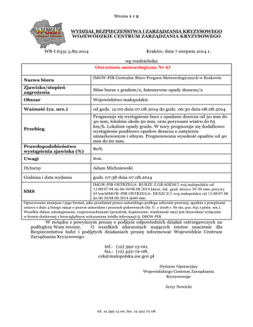 Strona 1 z 2 WYDZIAŁ BEZPIECZEŃSTWA I ZARZĄDZANIA KRYZYSOWEGO WOJEWÓDZKIE CENTRUM ZARZĄDZANIA KRYZYSOWEGO WB-I.6331.3.89.2014 Kraków, dnia 7 sierpnia 2014 r. wg rozdzielnika Ostrzeżenie meteorologiczne Nr 63 Nazwa biura IMGW-PIB Centralne Biuro Prognoz Meteorologicznych w Krakowie Zjawisko/stopień zagrożenia Silne burze z gradem/2, Intensywne opady deszczu/2 Obszar Województwo małopolskie Ważność (cz. urz.) od godz. 12:00 dnia 07.08.2014 do godz. 06:30 dnia 08.08.2014 Przebieg Prognozuje się wystąpienie burz z opadami deszczu od 30 mm do 40 mm, lokalnie około 50 mm, oraz porywami wiatru do 65 km/h. Lokalnie opady gradu. W nocy prognozuje się dodatkowo wystąpienie punktowo opadow deszczu o natężeniu umiarkowanym i silnym. Prognozowana wysokość opadów od 40 mm do 60 mm. Prawdopodobieństwo wystąpienia zjawiska (%) 80% Uwagi Brak. Dyżurny Adam Michniewski Godzina i data wydania godz. 07:38 dnia 07.08.2014 SMS IMGW-PIB OSTRZEGA: BURZE Z GRADEM/2 woj.malopolskie od 12:00/07.08 do 06:30/08.08.2014 burze, lok. grad, deszcz 30-50 mm, porywy 65 km/hIMGW-PIB OSTRZEGA: DESZCZ/2 woj.malopolskie od 12:00/07.08 do 06:30/08.08.2014 do60 mm Opracowanie niniejsze i jego format, jako przedmiot prawa autorskiego podlega ochronie prawnej, zgodnie z przepisami ustawy z dnia 4 lutego 1994r o prawie autorskim i prawach pokrewnych (dz. U. z 2006 r. Nr 90, poz. 631 z późn. zm.). Wszelkie dalsze udostępnianie, rozpowszechnianie (przedruk, kopiowanie, wiadomość sms) jest dozwolone wyłącznie w formie dosłownej z bezwzględnym wskazaniem źródła informacji tj. IMGW-PIB. W związku z powyższym proszę o podjęcie odpowiednich działań ostrzegawczych na podległym Wam terenie. O wszelkich zdarzeniach mających istotne znaczenie dla Bezpieczeństwa ludzi i podjętych działaniach proszę informować Wojewódzkie Centrum Zarządzania Kryzysowego. tel.: (12) 392-13-00, fax.: (12) 422-72-08, [email protected] Dyżurny Operacyjny Wojewódzkiego Centrum Zarządzania Kryzysowego Jerzy Nowicki tel. 12 392 13 00, fax. 12 422 72 08 Strona 2 z 2 Otrzymują: 1. Powiatowe (Miejskie) CZK 2. a/a Do wiadomości: 1. KW PSP 2. KW Policji 3. RZGW 4. MZMiUW 5. WSzW w Krakowie 6. KO SG Nowy Sącz 7. Dyspozytor PKP 8. Zakłady Energetyczne 9. GDDKiA 10. ZDW 11. WSSE Kraków 12. WINB Kraków 13. Urząd Żeglugi Śródlądowej w Krakowie 14. a/a tel. 12 392 13 00, fax. 12 422 72 08