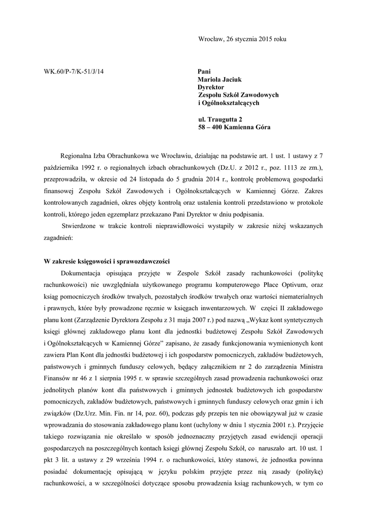 Wrocław, 26 stycznia 2015 roku WK.60/P-7/K-51/J/14 Pani Mariola Jaciuk Dyrektor Zespołu Szkół Zawodowych i Ogólnokształcących ul. Traugutta 2 58 – 400 Kamienna Góra Regionalna Izba Obrachunkowa we Wrocławiu, działając na podstawie art. 1 ust. 1 ustawy z 7 października 1992 r. o regionalnych izbach obrachunkowych (Dz.U. z 2012 r., poz. 1113 ze zm.), przeprowadziła, w okresie od 24 listopada do 5 grudnia 2014 r., kontrolę problemową gospodarki finansowej Zespołu Szkół Zawodowych i Ogólnokształcących w Kamiennej Górze. Zakres kontrolowanych zagadnień, okres objęty kontrolą oraz ustalenia kontroli przedstawiono w protokole kontroli, którego jeden egzemplarz przekazano Pani Dyrektor w dniu podpisania. Stwierdzone w trakcie kontroli nieprawidłowości wystąpiły w zakresie niżej wskazanych zagadnień: W zakresie księgowości i sprawozdawczości Dokumentacja opisująca przyjęte w Zespole Szkół zasady rachunkowości (politykę rachunkowości) nie uwzględniała użytkowanego programu komputerowego Płace Optivum, oraz ksiąg pomocniczych środków trwałych, pozostałych środków trwałych oraz wartości niematerialnych i prawnych, które były prowadzone ręcznie w księgach inwentarzowych. W części II zakładowego planu kont (Zarządzenie Dyrektora Zespołu z 31 maja 2007 r.) pod nazwą „Wykaz kont syntetycznych księgi głównej zakładowego planu kont dla jednostki budżetowej Zespołu Szkół Zawodowych i Ogólnokształcących w Kamiennej Górze” zapisano, że zasady funkcjonowania wymienionych kont zawiera Plan Kont dla jednostki budżetowej i ich gospodarstw pomocniczych, zakładów budżetowych, państwowych i gminnych funduszy celowych, będący załącznikiem nr 2 do zarządzenia Ministra Finansów nr 46 z 1 sierpnia 1995 r. w sprawie szczególnych zasad prowadzenia rachunkowości oraz jednolitych planów kont dla państwowych i gminnych jednostek budżetowych ich gospodarstw pomocniczych, zakładów budżetowych, państwowych i gminnych funduszy celowych oraz gmin i ich związków (Dz.Urz. Min. Fin. nr 14, poz. 60), podczas gdy przepis ten nie obowiązywał już w czasie wprowadzania do stosowania zakładowego planu kont (uchylony w dniu 1 stycznia 2001 r.). Przyjęcie takiego rozwiązania nie określało w sposób jednoznaczny przyjętych zasad ewidencji operacji gospodarczych na poszczególnych kontach księgi głównej Zespołu Szkół, co naruszało art. 10 ust. 1 pkt 3 lit. a ustawy z 29 września 1994 r. o rachunkowości, który stanowi, że jednostka powinna posiadać dokumentację opisującą w języku polskim przyjęte przez nią zasady (politykę) rachunkowości, a w szczególności dotyczące sposobu prowadzenia ksiąg rachunkowych, w tym co najmniej (...) przyjęte zasady klasyfikacji zdarzeń, zasady prowadzenia kont ksiąg pomocniczych oraz ich powiązania z kontami księgi głównej. W planie kont Zespołu Szkół występowały konta, które nie były wymienione i opisane w przywołanym zarządzeniu Ministra Finansów nr 46 (dotyczy kont: 137 „Rachunek środków Leonardo da Vinci”, 137 – 01 „Rachunek środków Leonardo da Vinci – do refundacji”, 137 – 02 „Rachunek środków INTERREG III A Czechy – Polska”, 228 „Rozliczenie wydatków ze środków funduszy pomocowych”, 761 „Pokrycie amortyzacji”, 141 „Środki pieniężne w drodze”, kont kosztów od 401 do 409) a jednostka nie ustaliła zasad ich funkcjonowania. Również w części I zakładowego planu kont powołano nieaktualny akt prawny na podstawie którego opracowano plan kont. Zgodnie z dyspozycją art. 10 ust. 2 ustawy o rachunkowości kierownik jednostki ustala w formie pisemnej i aktualizuje dokumentację, o której mowa w ust. 1. Zestawienie obrotów i sald kont syntetycznych („wydruk z programu księgowego Qwant, zestawienie obrotów i sald kont, budżet 2013, data dekretacji dokumentów od 2013.01.01 do 2013.12.31”) stanowiące księgi rachunkowe Zespołu Szkół nie zawierało sald kont na dzień otwarcia ksiąg rachunkowych (na dzień 1.01.2013 r.) oraz obrotów za okres sprawozdawczy. Zgodnie z dyspozycją art. 18 ust. 1 pkt 2 ustawy o rachunkowości na podstawie zapisów na kontach księgi głównej sporządza się na koniec każdego okresu sprawozdawczego, nie rzadziej niż na koniec miesiąca, zestawienie obrotów i sald, zawierające salda kont na dzień otwarcia ksiąg rachunkowych, obroty za okres sprawozdawczy i narastająco od początku roku obrotowego (...). W sprawozdaniu Rb-27S „Roczne sprawozdanie z wykonania planu dochodów budżetowych jednostki samorządu terytorialnego”, sporządzonym na koniec 2013 r., zaległości wykazane w dz. 801, rozdz. 80130, §0750 zawyżone zostały o kwotę 120 zł, co naruszało zasady określone w §3 ust. 1 pkt 7 załącznika nr 39 do rozporządzenia Ministra Finansów z 3 lutego 2010 r. w sprawie sprawozdawczości budżetowej (Dz.U. nr 20, poz. 103). W kolumnie zaległości została wykazana należność w kwocie 120 zł podczas, gdy nie stanowiła ona zaległości (dotyczyła czynszu za grudzień 2013 r., który był płatny do 10 stycznia 2014 r.; zapis w §5 umowy z 2 września 2012 r.). Na mocy §9 ust. 1 i 2 ww. rozporządzenia kierownicy jednostek są obowiązani sporządzać sprawozdania rzetelnie i prawidłowo pod względem merytorycznym i formalno-rachunkowym, a kwoty wykazane w sprawozdaniach powinny być zgodne z danymi wynikającymi z ewidencji księgowej. W kolumnie zaległości należało wykazać wyłącznie należności pozostałe do zapłaty, których termin zapłaty minął i mogą być egzekwowane. Dane o wypłaconych wynagrodzeniach nauczycieli na poszczególnych stopniach awansu zawodowego za 2013 r. zostały przekazane organowi prowadzącemu Zespół Szkół w sposób nierzetelny, ponieważ w informacji jednostkowej szkoły została zawyżona o 80 zł kwota wypłaconego wynagrodzenia w grupie nauczycieli mianowanych. Było to spowodowane faktem zaliczenia do s