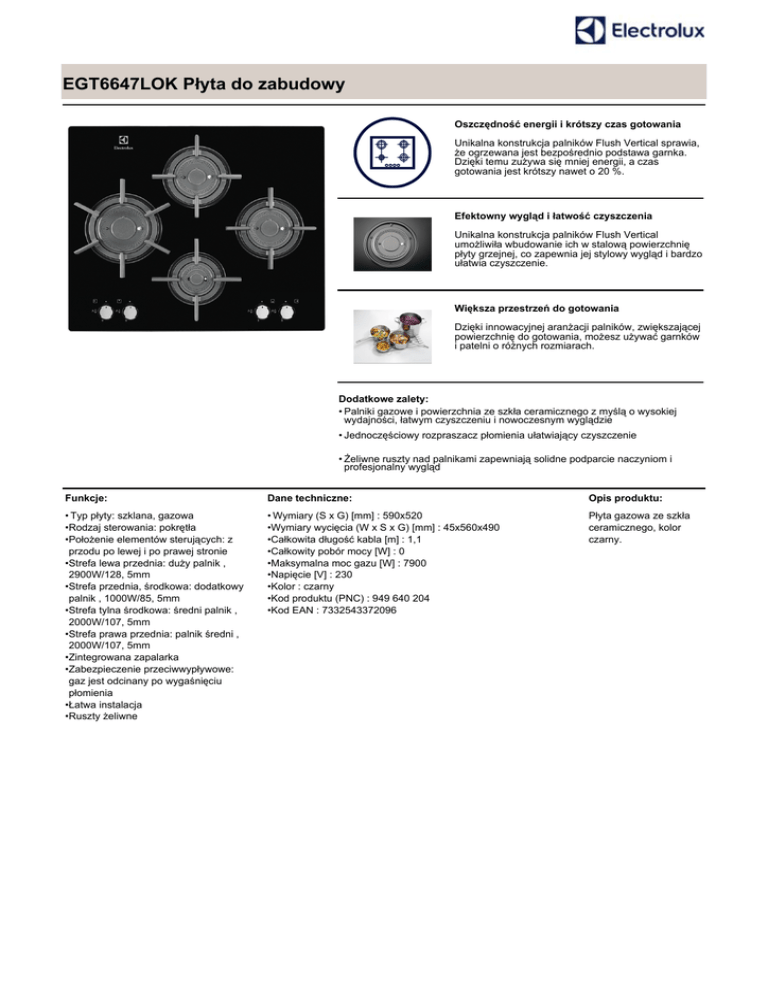EGT6647LOK Płyta do zabudowy Oszczędność energii i krótszy czas gotowania Unikalna konstrukcja palników Flush Vertical sprawia, że ogrzewana jest bezpośrednio podstawa garnka. Dzięki temu zużywa się mniej energii, a czas gotowania jest krótszy nawet o 20 %. Efektowny wygląd i łatwość czyszczenia Unikalna konstrukcja palników Flush Vertical umożliwiła wbudowanie ich w stalową powierzchnię płyty grzejnej, co zapewnia jej stylowy wygląd i bardzo ułatwia czyszczenie. Większa przestrzeń do gotowania Dzięki innowacyjnej aranżacji palników, zwiększającej powierzchnię do gotowania, możesz używać garnków i patelni o różnych rozmiarach. Dodatkowe zalety: • Palniki gazowe i powierzchnia ze szkła ceramicznego z myślą o wysokiej wydajności, łatwym czyszczeniu i nowoczesnym wyglądzie • Jednoczęściowy rozpraszacz płomienia ułatwiający czyszczenie • Żeliwne ruszty nad palnikami zapewniają solidne podparcie naczyniom i profesjonalny wygląd Funkcje: Dane techniczne: Opis produktu: • Typ płyty: szklana, gazowa •Rodzaj sterowania: pokrętła •Położenie elementów sterujących: z przodu po lewej i po prawej stronie •Strefa lewa przednia: duży palnik , 2900W/128, 5mm •Strefa przednia, środkowa: dodatkowy palnik , 1000W/85, 5mm •Strefa tylna środkowa: średni palnik , 2000W/107, 5mm •Strefa prawa przednia: palnik średni , 2000W/107, 5mm •Zintegrowana zapalarka •Zabezpieczenie przeciwwypływowe: gaz jest odcinany po wygaśnięciu płomienia •Łatwa instalacja •Ruszty żeliwne • Wymiary (S x G) [mm] : 590x520 •Wymiary wycięcia (W x S x G) [mm] : 45x560x490 •Całkowita długość kabla [m] : 1,1 •Całkowity pobór mocy [W] : 0 •Maksymalna moc gazu [W] : 7900 •Napięcie [V] : 230 •Kolor : czarny •Kod produktu (PNC) : 949 640 204 •Kod EAN : 7332543372096 Płyta gazowa ze szkła ceramicznego, kolor czarny. EGT6647LOK Płyta do zabudowy