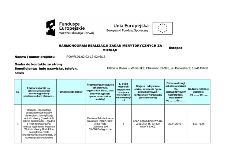 HARMONOGRAM REALIZACJI ZADAŃ MERYTORYCZNYCH ZA MIESIĄC Nazwa i numer projektu: POWR.01.02.02-12-0246/15 Osoba do kontaktu ze strony Beneficjenta: imię nazwisko, telefon, adres Forma wsparcia np. l.p. 1 szkolenia/staże/prace interwencyjne/bony szkoleniowe/bony stażowe/… Moduł II – Konsultacje poszczególnych etapów biznesplanu: Identyfikacja wnioskodawcy (przedmiot i zakres działalności – zgodnie z PKD; forma prawna, miejsce rejestracji), Potencjał Wnioskodawcy Moduł III – Zewnętrzne źródła finansowania; rola Internetu w rozwoju przedsiębiorstwa listopad Tematyka szkolenia* Elżbieta Bożek – Winiarska; Chełmiec 33-395, ul. Papieska 2; 18/4145658 L. osób Pracodawca/Instytucja objętych szkoleniowa, organizator stażu, prac wsparciem (staż/prace interwencyjnych interw/szkole (pełna nazwa i adres siedziby) nie/warsztaty/ ...) Centrum Szkoleniowo – Doradcze „KREATOR” Alina Plata Gostwica 200 33-386 Podegrodzie 1 Miejsce odbywania stażu / szkolenia / prac interwencyjnych / konferencji/ warsztatów (dokładny adres) SALA SZKOLENIOWA UL. ZIELONA 45, 33-300 NOWY SĄCZ Okres realizacji szkolenia/stażu/p rac Godziny realizacji interwencyjnych/ wsparcia konferencji / od …… do…… warsztatów od…….. do …… 22.11.2016 r. 8.00-16.15 2 Moduł II – Analiza marketingowa (produkt, klienci i rynek, promocja, główni konkurenci, analiza ograniczeń) – 8 godz. Centrum Szkoleniowo – Doradcze „KREATOR” Alina Plata Gostwica 200 33-386 Podegrodzie 1 SALA SZKOLENIOWA UL. ZIELONA 45, 33-300 NOWY SĄCZ 23.11.2016 r. 8.00-16.15 3 Moduł I – Formy prawne prowadzenia działalności gospodarczej: plusy i minusy, różnice w zakresie odpowiedzialności za zobowiązania, rejestracja działalności w CEIDG (nadanie numeru REGON, wybór formy opodatkowania i numer NIP, obowiązek ubezpieczenia – ZUS, konto bankowe, SANEPID, PIP), obowiązki przedsiębiorcy wobec organów administracji, Omówienie form opodatkowania. Moduł II – Definicja biznesplanu, cele biznesplanu, zasady przygotowania biznesplanu, omówienie poszczególnych części biznesplanu, Błędy popełniane w trakcie sporządzania biznesplanu Centrum Szkoleniowo – Doradcze „KREATOR” Alina Plata Gostwica 200 33-386 Podegrodzie 1 SALA SZKOLENIOWA UL. ZIELONA 45, 33-300 NOWY SĄCZ 21.11.2016 r. 8.00-16.15 4 Moduł III - Wybrane aspekty odpowiedzialności przedsiębiorcy (odszkodowania, prawa autorskie, odpowiedzialność za czyny pracowników), Wybrane aspekty związane z windykacją należności; przedsiębiorca w sądzie; omówienie najważniejszych elementów kodeksu pracy (8 godz.) Centrum Szkoleniowo – Doradcze „KREATOR” Alina Plata Gostwica 200 33-386 Podegrodzie 1 SALA SZKOLENIOWA UL. ZIELONA 45, 33-300 NOWY SĄCZ 24.11.2016 r. 8.00-16.15 5 Moduł II – Konsultacje poszczególnych etapów biznesplanu: Identyfikacja wnioskodawcy (przedmiot i zakres działalności – zgodnie z PKD; forma prawna, miejsce rejestracji), Potencjał Wnioskodawcy Moduł III – Zewnętrzne źródła finansowania; rola Internetu w rozwoju przedsiębiorstwa Centrum Szkoleniowo – Doradcze „KREATOR” Alina Plata Gostwica 200 33-386 Podegrodzie 1 SALA SZKOLENIOWA UL. ZIELONA 45, 33-300 NOWY SĄCZ 25.11.2016 r. 8.00-16.15 6 Moduł II - Analiza marketingowa (produkt, klienci i rynek, promocja, główni konkurenci, analiza ograniczeń) – 8 godz. Centrum Szkoleniowo – Doradcze „KREATOR” Alina Plata Gostwica 200 33-386 Podegrodzie 1 SALA SZKOLENIOWA UL. ZIELONA 45, 33-300 NOWY SĄCZ 26.11.2016 r. 8.00-16.15 7 Moduł II – Konsultacje poszczególnych etapów pisania biznesplanów Opłacalność i efektywność ekonomiczna przedsięwzięcia; wykonalność ekonomiczna przedsięwzięcia, (prognoza poziomu cen, prognoza wielkości sprzedaży, prognoza przychodów ze sprzedaży, koszty); prognoza finansowa (bilans, rachunek zysków i strat). *dotyczy szkoleń/warsztatów szkoleniowych Centrum Szkoleniowo – Doradcze „KREATOR” Alina Plata Gostwica 200 33-386 Podegrodzie 1 SALA SZKOLENIOWA UL. ZIELONA 45, 33-300 NOWY SĄCZ 28.11.2016 r. 8.00-16.15 /4145658 Uwagi