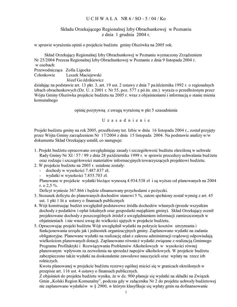U C H W A Ł A NR 6 / SO - 5 / 04 / Ko Składu Orzekającego Regionalnej Izby Obrachunkowej w Poznaniu z dnia 1 grudnia 2004 r. w sprawie wyrażenia opinii o projekcie budżetu gminy Olszówka na 2005 rok. Skład Orzekający Regionalnej Izby Obrachunkowej w Poznaniu wyznaczony Zrządzeniem Nr 25/2004 Prezesa Regionalnej Izby Obrachunkowej w Poznaniu z dnia 9 listopada 2004 r. w osobach: Przewodnicząca Zofia Ligocka Członkowie Leszek Maciejewski Józef Go ździkiewicz działając na podstawie art. 13 pkt. 3, art. 19 ust. 2 ustawy z dnia 7 pa ździernika 1992 r. o regionalnych izbach obrachunkowych (Dz. U. z 2001 r. Nr 55, poz. 577 z pó źn. zm.) wyraża o przedłożonym przez Wójta Gminy Olszówka projekcie budżetu na 2005 r. wraz z objaśnieniami i informacją o stanie mienia komunalnego opinię pozytywną z uwagą wyrażoną w pkt 5 uzasadnienia U z a s a d n i e n i e Projekt budżetu gminy na rok 2005, przedłożony tut. Izbie w dniu 16 listopada 2004 r., został przyjęty przez Wójta Gminy zarządzeniem Nr 17/2004 z dnia 15 listopada 2004. Na podstawie analizy w/w dokumentu Skład Orzekający ustalił, co następuje: 1. Projekt budżetu opracowano uwzględniając zasady i szczegółowość budżetu określoną w uchwale Rady Gminy Nr XI / 57 / 99 z dnia 28 października 1999 r. w sprawie procedury uchwalania bud żetu oraz rodzaju i szczegółowości materiałów informacyjnych towarzyszących projektowi budżetu. 2. W projekcie budżetu na 2005 r. ustalone zostały: - dochody w wysokości 7.487.837 zł; - wydatki w wysokości 7.855.703 zł. Planowane w projekcie wydatki bieżące wynoszą 4.934.538 zł i są wyższe od planowanych na 2004 r. o 2,5 %. Deficyt wyniesie 367.866 i będzie sfinansowany przychodami z pożyczki. 3. Stosunek deficytu do planowanych dochodów stanowi 5 %, zatem spełniony został wymóg z art. 45 ust. 1 pkt 1 lit a ustawy o finansach publicznych 4. Wójt konstruując budżet uwzględnił podstawowe źródła dochodów własnych (przede wszystkim dochody z podatków i opłat lokalnych oraz gospodarki majątkiem gminy). Skład Orzekający ocenił projektowane dochody z poszczególnych źródeł z uwzględnieniem informacji zamieszczonych w objaśnieniach i nie wnosi uwag do wielkości ujętych w projekcie budżetu. 5. Opracowując projekt budżetu Wójt uwzględnił wydatki na pokrycie kosztów utrzymania i funkcjonowania urzędu jak i jednostek organizacyjnych gminy. Zaplanowano wydatki na zadania obligatoryjne. Planowane wydatki na realizację zdań z zakresu administracji rządowej odpowiadają wielkościom planowanych dotacji. Zaplanowano również wydatki związane z realizacją Gminnego Programu Profilaktyki i Rozwiązywania Problemów Alkoholowych w wysokości równej planowanym wpływom za zezwolenia na sprzedaż napojów alkoholowych. W projekcie budżetu zabezpieczono także wydatki na doskonalenie zawodowe nauczycieli oraz wpłaty na rzecz izb rolniczych. Kwota planowanej w projekcie budżetu rezerwy ogólnej mieści się w granicach określonych w przepisie art. 116 ust. 4 ustawy o finansach publicznych. Z objaśnień do projektu budżetu wynika, że w dz. 900 planuje się wydatki na składki na Związek Gmin „Kolski Region Komunalny”, podczas gdy w załączniku Nr 2 do projektu uchwały budżetowej nie zaplanowano wydatków w § 2900, w którym klasyfikuje się wpłaty gmin na dofinansowanie 1 zadań bieżących ani też w § 6650, w którym klasyfikuje się wpłaty gmin na dofinansowanie zadań inwestycyjnych. W objaśnieniach nie zamieszczono natomiast informacji czy w projekcie bud żetu na 2005 r. przewidziano wydatki na świadczenia usług opiekuńczych, które są obowiązkowym zadaniem gminy. W projekcie budżetu zaplanowane zostały wydatki na sfinansowanie zobowiązań wynikających z podjętych przez Radę na podstawie przepisu art. 18 ust. 2 pkt 9 lit. e ustawy o samorządzie gminnym uchwał: - Nr XX/72/2004 z dnia 28 czerwca 2004 r. w sprawie wyra żenia zgody na realizację inwestycji pod nazwą „Modernizacja drogi gminnej w Ponętowie Górnym A”; - Nr XX/73/2004 z dnia 28 czerwca 2004 r. w sprawie wyra żenia zgody na realizację inwestycji pod nazwą „Przebudowa drogi gminnej w Krzewacie” zmienionej uchwałą Nr XXII/85/2004; - Nr XX/74/2004 z dnia 28 czerwca 2004 r. w sprawie wyra żenia zgody na realizację inwestycji pod nazwą „Kudowa kanalizacji sanitarnej z przykanalikami w miejscowości Ponętów Górny B” Do projektu uchwały budżetowej dołączono limity wydatków na wieloletnie programy inwestycyjne, które opracowane zostały z uwzględnieniem wymogów wynikających z art. 110 ustawy o finansach publicznych. Załącznik Nr 9 obejmujący wieloletni program inwestycyjny zawiera kolumny dotyczące wydatków poniesionych w 2003 i poniesionych lub przewidzianych do zrealizowania w 2004 r. Zdaniem Składu Orzekającego kolumny te należy wyeliminować lub zastąpić kolumną informującą o wydatkach poniesionych przed 2005 r., bowiem nie można ustalać limitów wydatków na lata poprzednie. Skład Orzekający ustalił, że w uchwale Nr XX/74/2004 z dnia 28 czerwca 2004 r oraz Wieloletnim Programie Inwestycyjnym dołączonym do uchwały budżetowej na 2004 r. określono, iż zadanie inwestycyjne pod nazwą „Budowa kanalizacji sanitarnej z przykanalikami w miejscowości Ponętów Górny B” realizowane będzie w latach 2004-2005 a z Wieloletniego Programu Inwestycyjnego dołączonego do projektu budżetu na 2005 rok wynika, że zadanie to na być realizowane w latach 2004-2006. W objaśnieniach Wójt poinformował, że gmina sfinansowała wykonanie dokumentacji technicznej i studium wykonalności, lecz zadanie to nie zostało zakwalifikowane w 2004 r. do współfinansowania ze środków strukturalnych UE. Z uwagi na powyższe Wójt zaproponował przesunięcie realizacji tego zadania do 2006 r. Z objaśnień do projektu budżetu wynika, że w dziale 926 /Kultura fizyczna i sport/ obok wydatków na utrzy
