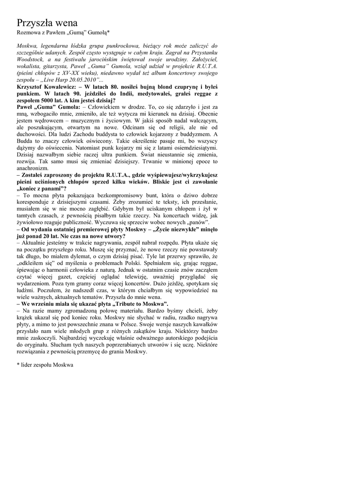 Przyszła wena Rozmowa z Pawłem „Gumą” Gumolą* Moskwa, legendarna łódzka grupa punkrockowa, bieżący rok może zaliczyć do szczególnie udanych. Zespół często występuje w całym kraju. Zagrał na Przystanku Woodstock, a na festiwalu jarocińskim świętował swoje urodziny. Założyciel, wokalista, gitarzysta, Paweł „Guma” Gumola, wziął udział w projekcie R.U.T.A. (pieśni chłopów z XV-XX wieku), niedawno wydał też album koncertowy swojego zespołu – „Live Harp 20.05.2010”... Krzysztof Kowalewicz: – W latach 80. nosiłeś bujną blond czuprynę i byłeś punkiem. W latach 90. jeździłeś do Indii, medytowałeś, grałeś reggae z zespołem 5000 lat. A kim jesteś dzisiaj? Paweł „Guma” Gumola: – Człowiekiem w drodze. To, co się zdarzyło i jest za mną, wzbogaciło mnie, zmieniło, ale też wytycza mi kierunek na dzisiaj. Obecnie jestem wędrowcem – muzycznym i życiowym. W jakiś sposób nadal walczącym, ale poszukującym, otwartym na nowe. Odcinam się od religii, ale nie od duchowości. Dla ludzi Zachodu buddysta to człowiek kojarzony z buddyzmem. A Budda to znaczy człowiek oświecony. Takie określenie pasuje mi, bo wszyscy dążymy do oświecenia. Natomiast punk kojarzy mi się z latami osiemdziesiątymi. Dzisiaj nazwałbym siebie raczej ultra punkiem. Świat nieustannie się zmienia, rozwija. Tak samo musi się zmieniać dzisiejszy. Trwanie w minionej epoce to anachronizm. – Zostałeś zaproszony do projektu R.U.T.A., gdzie wyśpiewujesz/wykrzykujesz pieśni uciśnionych chłopów sprzed kilku wieków. Bliskie jest ci zawołanie „koniec z panami”? – To mocna płyta pokazująca bezkompromisowy bunt, która o dziwo dobrze koresponduje z dzisiejszymi czasami. Żeby zrozumieć te teksty, ich przesłanie, musiałem się w nie mocno zagłębić. Gdybym był uciskanym chłopem i żył w tamtych czasach, z pewnością pisałbym takie rzeczy. Na koncertach widzę, jak żywiołowo reaguje publiczność. Wyczuwa się sprzeciw wobec nowych „panów”. – Od wydania ostatniej premierowej płyty Moskwy – „Życie niezwykłe” minęło już ponad 20 lat. Nie czas na nowe utwory? – Aktualnie jesteśmy w trakcie nagrywania, zespół nabrał rozpędu. Płyta ukaże się na początku przyszłego roku. Muszę się przyznać, że nowe rzeczy nie powstawały tak długo, bo miałem dylemat, o czym dzisiaj pisać. Tyle lat przerwy sprawiło, że „odkleiłem się” od myślenia o problemach Polski. Spełniałem się, grając reggae, śpiewając o harmonii człowieka z naturą. Jednak w ostatnim czasie znów zacząłem czytać więcej gazet, częściej oglądać telewizję, uważniej przyglądać się wydarzeniom. Poza tym gramy coraz więcej koncertów. Dużo jeżdżę, spotykam się ludźmi. Poczułem, że nadszedł czas, w którym chciałbym się wypowiedzieć na wiele ważnych, aktualnych tematów. Przyszła do mnie wena. – We wrześniu miała się ukazać płyta „Tribute to Moskwa”. – Na razie mamy zgromadzoną połowę materiału. Bardzo byśmy chcieli, żeby krążek ukazał się pod koniec roku. Moskwy nie słychać w radiu, rzadko nagrywa płyty, a mimo to jest powszechnie znana w Polsce. Swoje wersje naszych kawałków przysłało nam wiele młodych grup z różnych zakątków kraju. Niektórzy bardzo mnie zaskoczyli. Najbardziej wyczekuję właśnie odważnego autorskiego podejścia do oryginału. Słucham tych naszych poprzerabianych utworów i się uczę. Niektóre rozwiązania z pewnością przemycę do grania Moskwy. * lider zespołu Moskwa