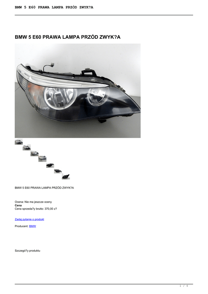 BMW 5 E60 PRAWA LAMPA PRZÓD ZWYK?A BMW 5 E60 PRAWA LAMPA PRZÓD ZWYK?A BMW 5 E60 PRAWA LAMPA PRZÓD ZWYK?A Ocena: Nie ma jeszcze oceny Cena Cena sprzeda?y brutto: 370,00 z? Zadaj pytanie o produkt Producent: BMW Szczegó?y produktu O NAS 1 / 4 BMW 5 E60 PRAWA LAMPA PRZÓD ZWYK?A Od wielu lat zajmujemy si? skupem i sprzeda?? lamp samochodowych. W swoim komisie posiadamy bogaty asortyment zarówno lamp u?ywanych pochodz?cych z demonta?u, jak i nowych cz??ci. Kupuj?c u nas masz pewno?? i gwarancj? rozruchow? towaru (14 dni od momentu odbioru). Istnieje mo?liwo?? zamówienia cz??ci, gdy? 2 razy w tygodniu realizowana jest nowa dostawa towaru. WYSY?KA Towar wysy?amy w tym samym dniu je?eli zamówienie zostanie z?o?one do godz.13:00 kurierem In Post lub Poczt? Polsk?. Po godz. 13:00 przesy?ka zostanie wys?ana w nast?pnym dniu roboczym. Istnieje mo?liwo?? wysy?ki paczek (forma p?atno?ci): - za pobraniem - przedp?ata na konto Przesy?ka z regu?y dociera na nast?pny dzie? roboczy. Paczki nadawane s? tylko w dni powszednie. Istnieje mo?liwo?? osobistego odbioru reflektorów po wcze?niejszej konsultacji. Maj? Pa?stwo prawo zwrotu zakupionego towaru w ci?gu 14 dni (ustawowo) wraz z dowodem zakupu i formularzem odst?pienia od umowy zawartym na naszej stronie : http://lampy-samochodowe.pl/media/files/Formularz_Odstapienia_OU.pdf bez podania przyczyny. Nie odbieramy przesy?ek za pobraniem. ZAKUP PRZEDMIOTU BMW 5 E60 PRAWA LAMPA PRZÓD ZWYK?A 1. Wybierz produkt i dodaj go do koszyka. 2. Wybierz sposób zap?aty/ odbioru, uzupe?nij dane do wysy?ki 3. Ewentualne sugestie prosz? wpisa? w polu wiadomo??. 4. Oczekuj na kuriera- sprawd? zawarto?? przesy?ki przy odbiorze (wszystkie paczki s? ubezpieczone) . MODEL STRON OPIS STAN CENA /MARK A CZ??CI MAGA A ZYNO WY BMW 5 PRAWA PRZÓD, D5-18 370,00 E60 ZWYK?A PLN , ORYGI NA? HELLA, KLOSZ S ZCZELN Y, PRZY KRAW?D ZI PRZY TARTY, UCHWYT Y CA?E, LUSTRO ?ADNE, STAN JAK NA FOTO PARAGON/FAKTURA Do ka?dej zakupionej cz??ci do??czamy paragon . Je?li ?ycz? Pa?stwo sobie faktur?, prosimy o informacj? wraz z danymi niezb?dnymi do jej wystawienia. 2 / 4 BMW 5 E60 PRAWA LAMPA PRZÓD ZWYK?A KONTAKT: Wszelkie zapytania prosimy kierowa? na e-mail: [email protected] Wszystkie przedmioty s? dok?adnie opisane i skatalogowane. Je?li masz dodatkowe pytania prosimy o kontakt z nami pod nr tel.: 798-986-497 GODZINY OTWARCIA: Pracujemy od poniedzia?ku do pi?tku w godz. 8:00- 16:00. STRONA WWW: www.lampy-samochodowe.pl ZAMIENNIKI: Nie kupuj zamienników na innych aukcjach. S? to cz??ci o krótkiej ?ywotno?ci i s?abej jako?ci wykonania. Pos?u?? na zdecydowanie krótszy czas ni? cz??ci oryginalne, mimo, ?e s? nowe. Zakup na naszych aukcjach jest jednoznaczny z akceptacj? regulaminu dost?pnego na naszej stronie. DZI?KUJEMY ZA ZAINTERESOWANIE AUTO LAMPY SPRZEDA? CZ??CI REFLEKTORY PRZÓD LAMPY TY? TEL.798986497 Mercedes - naprawa i przeróbka lamp LED tel: 513-531-967 / tel: 795-785-666 naprawa lamp LED - w przypadku uszkodzenia lamp LED w samochodach osobowych - producent nie przewidzia? ingerencji w lamp? , czy wymiany uszkodzonych elementów lub przepalanego LED - ASO oferuja wymian? lamp na nowe - jednak cena nowych lamp nadal powala na kolana - oferujemy napraw? i przeróbk lamp LED - przerabiamy równie? lampy z wersji USA www.motolampy.com ?#?naprawa_lamp? ?#?lampy_samochodowe? ?#?lampy_led? ?#?naprawa_led??#?przeróbka_usa? ?#?lampy_usa? Wi?kszo?? wspó?czesnych samochodów osobowych wyposa?onych jest w lampy zbudowane w oparciu o LED. Takie lampy nie posiadaj? zwyk?ych ?arówek . Minusem tego rozwi?zania jest brak mo?liwo?ci w?asnor?cznej szybkiej wymiany uszkodzonego czy przepalonego elementu. Autoryzowane serwisy nie widza innego wyj?cia jak wymian? lampy na now? , jednak cena nowych lamp powala na kolana. Nasza firma oferuje napraw? lamp LED. Naprawiamy lampy we wszystkich modelach Mercedes , Audi , BMW - inne po uzgodnieniu Przerabiamy równie? lampy z wersji USA na europ? Nie musisz wymienia? lamp na nowe - ka?d? naprawimy naprawa lamp regeneracja lamp lampy samochodowe autolampy lampy led, przeróbka lamp naprawa lamp led polerowanie reflektorów przeróbka lamp usa, lampy mercedes, naprawa reflektorów polerowanie lamp lampy ty? reflektor audi tanie lampy lampy u?ywane tuning lamp powrót Czytaj równie?: 3 / 4 BMW 5 E60 PRAWA LAMPA PRZÓD ZWYK?A BMW e39 - opis , porady i ciekawostki Mercedes GL przeróbka lamp z USA Regeneracja reflektorów - Skoda Roomster Dlaczego regenerowa? lampy ? eXfan - lampy samochodowe - naprawa lamp 4 / 4 Powered by TCPDF (www.tcpdf.org)