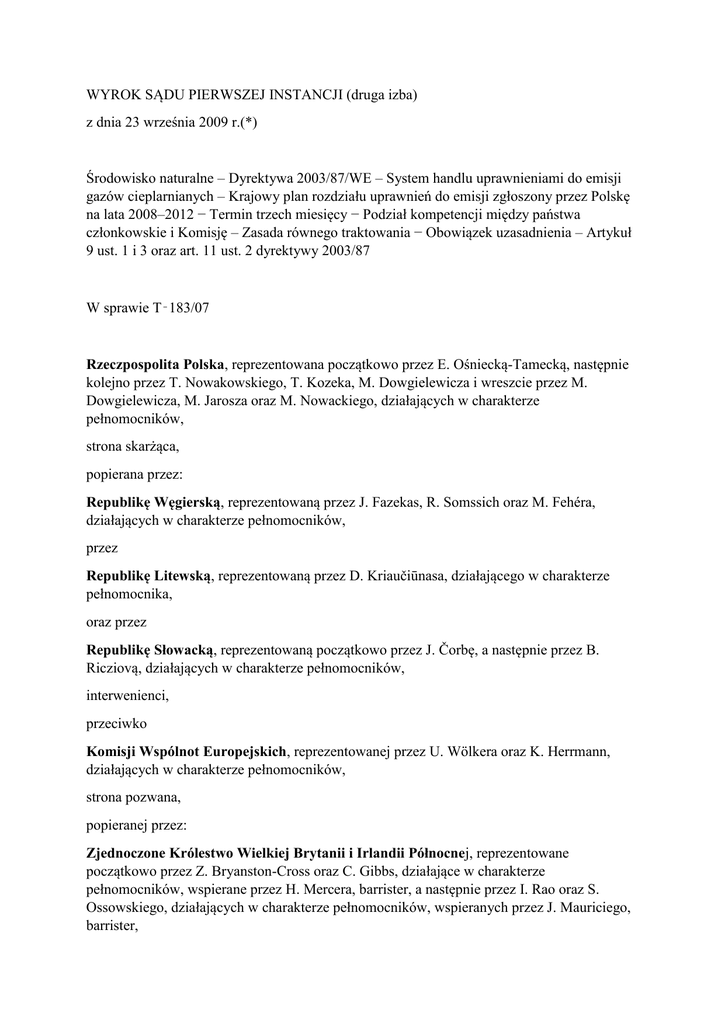 WYROK SĄDU PIERWSZEJ INSTANCJI (druga izba) z dnia 23 września 2009 r.(*) Środowisko naturalne – Dyrektywa 2003/87/WE – System handlu uprawnieniami do emisji gazów cieplarnianych – Krajowy plan rozdziału uprawnień do emisji zgłoszony przez Polskę na lata 2008–2012 − Termin trzech miesięcy − Podział kompetencji między państwa członkowskie i Komisję – Zasada równego traktowania − Obowiązek uzasadnienia – Artykuł 9 ust. 1 i 3 oraz art. 11 ust. 2 dyrektywy 2003/87 W sprawie T‑183/07 Rzeczpospolita Polska, reprezentowana początkowo przez E. Ośniecką-Tamecką, następnie kolejno przez T. Nowakowskiego, T. Kozeka, M. Dowgielewicza i wreszcie przez M. Dowgielewicza, M. Jarosza oraz M. Nowackiego, działających w charakterze pełnomocników, strona skarżąca, popierana przez: Republikę Węgierską, reprezentowaną przez J. Fazekas, R. Somssich oraz M. Fehéra, działających w charakterze pełnomocników, przez Republikę Litewską, reprezentowaną przez D. Kriaučiūnasa, działającego w charakterze pełnomocnika, oraz przez Republikę Słowacką, reprezentowaną początkowo przez J. Čorbę, a następnie przez B. Ricziovą, działających w charakterze pełnomocników, interwenienci, przeciwko Komisji Wspólnot Europejskich, reprezentowanej przez U. Wölkera oraz K. Herrmann, działających w charakterze pełnomocników, strona pozwana, popieranej przez: Zjednoczone Królestwo Wielkiej Brytanii i Irlandii Północnej, reprezentowane początkowo przez Z. Bryanston-Cross oraz C. Gibbs, działające w charakterze pełnomocników, wspierane przez H. Mercera, barrister, a następnie przez I. Rao oraz S. Ossowskiego, działających w charakterze pełnomocników, wspieranych przez J. Mauriciego, barrister, interwenient, mającej za przedmiot wniosek o stwierdzenie nieważności w całości lub w części decyzji Komisji C (2007) 1295 wersja ostateczna z dnia 26 marca 2007 r. dotyczącej krajowego planu rozdziału uprawnień do emisji gazów cieplarnianych zgłoszonego przez Rzeczpospolitą Polską na lata 2008–2012 zgodnie z dyrektywą 2003/87/WE Parlamentu Europejskiego i Rady z dnia 13 października 2003 r. ustanawiającą system handlu przydziałami emisji gazów cieplarnianych we Wspólnocie oraz zmieniającą dyrektywę Rady 96/61/WE (Dz.U. L 275, s. 32), SĄD PIERWSZEJ INSTANCJI WSPÓLNOT EUROPEJSKICH (druga izba), w składzie: I. Pelikánová, prezes, K. Jürimäe (sprawozdawca) i S. Soldevila Fragoso, sędziowie, sekretarz: K. Pocheć, administrator, uwzględniając procedurę pisemną i po przeprowadzeniu rozprawy w dniu 10 lutego 2009 r., wydaje następujący Wyrok Ramy prawne I – Uregulowania międzynarodowe i wspólnotowe dotyczące ramowej konwencji Narodów Zjednoczonych w sprawie zmian klimatu i protokołu z Kioto 1 Ramowej konwencji Narodów Zjednoczonych w sprawie zmian klimatu zawartej w dniu 9 maja 1992 r. w Nowym Jorku (zwanej dalej „konwencją ramową”), zatwierdzonej w imieniu Wspólnoty mocą decyzji Rady 94/69/WE dotyczącej zawarcia ramowej konwencji Narodów Zjednoczonych w sprawie zmian klimatu (Dz.U. 1994, L 33, s. 11) przyświeca ostateczny cel utrzymania koncentracji gazów cieplarnianych w atmosferze na poziomie, który powstrzyma wszelkie niebezpieczne, antropogeniczne zaburzenia systemu klimatycznego. Załącznik I do konwencji ramowej zawiera wykaz państw, wśród których w kategorii krajów podlegających procesowi przejścia do gospodarki rynkowej figuruje Rzeczpospolita Polska. Konwencja ramowa zaczęła obowiązywać we Wspólnocie w dniu 21 marca 1994 r., a przez Rzeczpospolitą Polską została ratyfikowana w dniu 28 lipca 1994 r., gdzie zaczęła obowiązywać w dniu 26 października 1994 r. 2 W dążeniu do osiągnięcia ostatecznego celu konwencji ramowej w dniu 11 grudnia 1997 r. został przyjęty protokół z Kioto do konwencji ramowej (decyzja 1/CP.3 „w sprawie przyjęcia protokołu [do konwencji ramowej]”). W załączniku A do protokołu z Kioto zamieszczono wykaz gazów cieplarnianych oraz wykaz kategorii sektorów i źródeł emisji, do których odnosi się ten protokół. W załączniku B do protokołu z Kioto zamieszczono wykaz państw będących stronami tego protokołu wraz z podjętymi przez nie, wyrażonymi ilościowo, zobowiązaniami w zakresie ograniczenia lub redukcji emisji. 3 W dniu 25 kwietnia 2002 r. Rada Unii Europejskiej wydała decyzję dotyczącą zatwierdzenia przez Wspólnotę Europejską protokołu z Kioto do [konwencji ramowej] i wspólnej realizacji wynikających z niego zobowiązań (Dz.U. L 130, s. 1). Protokół z Kioto, jak również jego załączniki A i B zostały zawarte w załączniku I do decyzji 2002/358. Tabela określonych ilościowo zobowiązań stron do ograniczenia lub redukcji emisji, stworzona z myślą o ustanowieniu liczby uprawnień przyznanych odpowiednio Wspólnocie Europejskiej i jej państwom członkowskim zgodnie z art. 4 protokołu, figuruje w załączniku II do decyzji 2002/358. 4 Rzeczpospolita Polska ratyfikowała protokół z Kioto w dniu 13 grudnia 2002 r. Protokół ten wszedł w życie we Wspólnocie Europejskiej i w Rzeczypospolitej Polskiej w dniu 16 lutego 2005 r. II – Uregulowania dotyczące wspólnotowego systemu handlu uprawnieniami do emisji gazów cieplarnianych 5 Artykuł 1 dyrektywy 2003/87/WE Parlamentu Europejskiego i Rady z dnia 13 października 2003 r. ustanawiającej system handlu przydziałami emisji gazów cieplarnianych we Wspólnocie oraz zmieniającej dyrektywę Rady 96/61/WE (Dz.U. L 275, s. 32, zwanej dalej „dyrektywą”), zmienionej dyrektywą 2004/101/WE Parlamentu Europejskiego i Rady z dnia 27 października 2004 r. (Dz.U. L 338, s. 18), przewiduje: „Niniejsza dyrektywa ustanawia system handlu przydziałami emisji gazów cieplarnianych we Wspólnocie […] w celu wspierania zmniejszania emisji gazów cieplarnianych w efektywny pod względem kosztów oraz skuteczny gospodarczo sposób”. 6 Artykuł 9 dyrektywy 