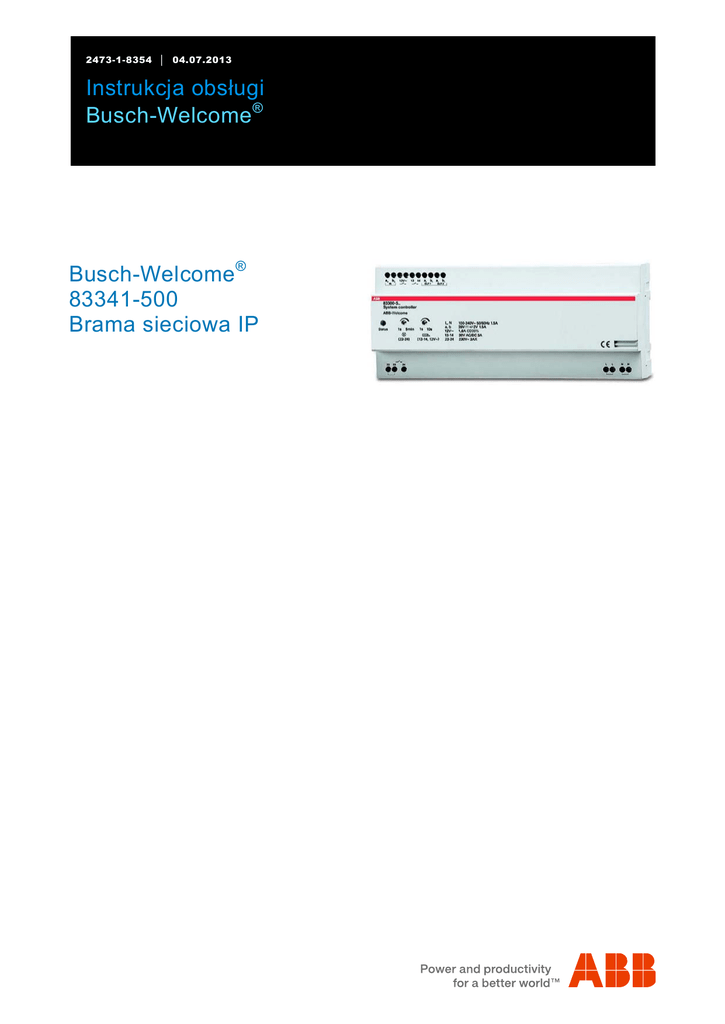 2473-1-8354 │ 04.07.2013 Instrukcja obsługi Busch-Welcome® Pos: 2 /#Neustruktur#/Online-Dokumentation (+KNX)/Titelblätter/Türkommunikation/Busch-Welcome II/Titelblatt - 83341 - ABB @ 36\mod_1370935982690_124510.docx @ 296879 @ @ 1 Busch-Welcome® 83341-500 Brama sieciowa IP === Ende der Liste für Textmarke Cover === Instrukcja obsługi Busch-Welcome ® Pos: 4 /#Neustruktur#/Online-Dokumentation (+KNX)/Inhaltsverzeichnis (--> Für alle Dokumente <--)/Inhaltsverzeichnis @ 19\mod_1320649044386_124510.docx @ 134663 @ @ 1 1 2 3 4 5 6 7 8 9 10 11 Wskazówki na temat bramy sieciowej IP ................................................................................................................. 3 1.1 Wskazówki ogólne .................................................................................................................................. 3 1.2 Struktura podręcznika ............................................................................................................................. 3 1.3 Symbole w podręczniku .......................................................................................................................... 4 Bezpieczeństwo ....................................................................................................................................................... 5 2.1 Zastosowanie zgodne z przeznaczeniem ............................................................................................... 5 2.2 Zastosowanie wbrew przeznaczeniu ...................................................................................................... 5 2.3 Grupy docelowe i kwalifikacje ................................................................................................................. 5 2.4 Odpowiedzialność i rękojmia ................................................................................................................... 5 Środowisko .............................................................................................................................................................. 6 Warunki systemowe ................................................................................................................................................. 6 Pierwsze uruchomienie ............................................................................................................................................ 7 5.1 Uruchomienie przy użyciu usługi UPnP w systemie Windows ................................................................ 8 5.2 Serwer DNS ............................................................................................................................................ 9 5.3 Konfiguracja ręczna ................................................................................................................................ 9 5.4 Bezpośrednie wpisanie adresu IP ......................................................................................................... 10 Konfiguracja ........................................................................................................................................................... 11 6.1 Ogólne przyciski konfiguracyjne ............................................................................................................ 11 6.2 Logowanie............................................................................................................................................. 11 6.2.1 RESET .................................................................................................................................................. 12 6.3 Informacje o sieci .................................................................................................................................. 13 6.4 Strona konfiguracji „Konfiguracja sieci“ ................................................................................................. 14 6.5 Strona konfiguracji „Ustawienia podstawowe“ ....................................................................................... 16 6.6 Strona konfiguracji „Zmiana hasła“ ....................................................................................................... 17 6.7 Strona konfiguracji „Zarządzanie użytkownikami“ ................................................................................. 18 6.7.1 Strona konfiguracji „Dodawanie użytkownika“ ....................................................................................... 19 6.7.2 Logowanie z nową nazwą użytkownika................................................................................................. 21 6.7.2.1 Zmiana hasła ........................................................................................................................................ 22 6.8 Strona konfiguracji „Ustawienia urządzenia“ ......................................................................................... 23 6.8.1 Dodawanie urządzeń ............................................................................................................................ 24 6.9 Strona konfiguracji „Przynależny ComfortTouch 2.x“ ............................................................................ 25 6.10 Strona konfiguracji „Wysyłanie / pobieranie pliku konfiguracji“ .............................................................. 26 6.11 Strona konfiguracji „Aktualizacja oprogramowania systemowego“ ....................................................... 27 6.12 Strona konfiguracji „Ustawienia NTP“ ................................................................................................... 28 6.13 Strona konfiguracji „Tworzenie nowego certyfikatu“ .............................................................................. 29 6.14 Strona konifguracji „Informacja o wersji“ ...........................................................................................