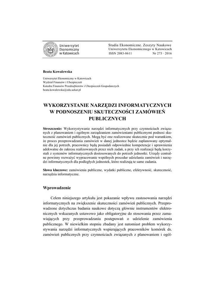 Studia Ekonomiczne. Zeszyty Naukowe Uniwersytetu Ekonomicznego w Katowicach ISSN 2083-8611 Nr 273 · 2016 Beata Kowalewska Uniwersytet Ekonomiczny w Katowicach Wydział Finansów i Ubezpieczeń Katedra Finansów Przedsiębiorstw i Ubezpieczeń Gospodarczych [email protected] WYKORZYSTANIE NARZĘDZI INFORMATYCZNYCH W PODNOSZENIU SKUTECZNOŚCI ZAMÓWIEŃ PUBLICZNYCH Streszczenie: Wykorzystywanie narzędzi informatycznych przy czynnościach związanych z planowaniem i ogólnym zarządzaniem zamówieniami publicznymi podnosi skuteczność zamówień publicznych. Mogą być one realizowane skutecznie pod warunkiem, że proces przeprowadzania zamówień w danej jednostce będzie zaplanowany optymalnie dla jej potrzeb, pracownicy będą posiadali odpowiednie kompetencje i uprawnienia adekwatne do zakresu realizowanych przez nich zadań, a przy ich realizacji będą korzystali z systemów informatycznych dostosowanych do potrzeb jednostki. Urzędy centralne powinny rozważyć wypracowanie wspólnych procedur udzielania zamówień i narzędzi informatycznych dla podległych jednostek, które realizują te same zadania. Słowa kluczowe: zamówienia publiczne, wydatki publiczne, efektywność, skuteczność, narzędzia informatyczne. Wprowadzenie Celem niniejszego artykułu jest pokazanie wpływu zastosowania narzędzi informatycznych na zwiększenie skuteczności zamówień publicznych. Przeprowadzone dotychczas badania naukowe dotyczą głównie instrumentów elektronicznych wskazanych ustawowo jako obligatoryjne do stosowania przez zamawiających przy przeprowadzaniu postępowań o udzielenie zamówienia publicznego. W niewielkim stopniu zbadany jest natomiast problem wykorzystywania narzędzi informatycznych wspierających pracowników komórek ds. zamówień publicznych przy czynnościach związanych z planowaniem i ogól- Wykorzystanie narzędzi informatycznych w podnoszeniu skuteczności… 159 nym zarządzaniem zamówieniami publicznymi oraz wpływ tych narzędzi na skuteczność przeprowadzania postępowań. Podczas badań nad problematyką wykorzystania narzędzi informatycznych w podnoszeniu skuteczności zamówień publicznych przeprowadzono analizę literatury naukowej oraz wspólnotowych i krajowych dokumentów strategicznych dotyczących elektronicznych zamówień publicznych. Do zilustrowania praktycznych działań wykorzystywania narzędzi informatycznych w procesie zamówień publicznych skorzystano z obserwacji uczestniczącej, studium przypadku oraz wywiadów bezpośrednich. 1. Efektywność i skuteczność zamówień publicznych na tle wspólnotowych i krajowych regulacji dotyczących e-zamówień Wykorzystywanie narzędzi elektronicznych w zamówieniach publicznych powinno sprzyjać efektywnemu wydatkowaniu środków publicznych. Efektywność jest ściśle powiązana ze skutecznością, a obie te kategorie decydują o sprawności. Zdaniem Kieżuna „podstawowymi postaciami (walorami) sprawnego działania zapobiegającego zjawisku chaotyczności i nieuporządkowania (…) są: skuteczność, korzystność i ekonomiczność” [Kieżun, 1998, s. 18]. Skuteczność (effectiveness) wg Lisieckiej „zakłada osiąganie założonych celów – dostarczenie usług w odpowiednim czasie, w określonej ilości i o określonym poziomie jakości przy wykorzystaniu minimalnej ilości zasobów [Lisiecka i Papaj (red.), 2012, s. 18]. Z kolei efektywność (efficiency) odnosi się do stopnia osiągnięcia założonych celów przy minimalnych kosztach lub maksymalizacji stopnia osiągnięcia celu przy założonych kosztach [Lubińska, 2009, s. 57]. Kocowski twierdzi, że w efektywnym wydatkowaniu środków publicznych „idzie o to by posiadane środki publiczne zapewniły maksymalną i optymalną realizację zadania publicznego” [Kocowski, 2012, s. 23-24]. Zdaniem Nowickiego „właściwie prowadzone zamówienia publiczne to zamówienia efektywne ekonomicznie, zapewniające w toku sprawnej, szybkiej i otwartej na innowacje procedury najlepszy stosunek nakładów do efektów uzyskanych zamówień” [Nowicki, 2013, s. 10]. W tym rozumieniu zamówienia publiczne traktowane są jako jeden z elementów zarządzania publicznego1. Sudoł oraz Kożuch twierdzą, że: „przedmiotem subdyscypliny zarządzanie publiczne jest badanie procesów zarządzania pod kątem prawidłowości i źródeł sprawności w organizacjach (zarówno w pojedynczych jednostkach, jak i w zbiorach) nastawionych na realizację 1 Szerzej na temat zarządzania publicznego: [Lissowski, 2009; Kożuch, 2011]. 160 Beata Kowalewska interesu publicznego, a także wykrywanie tendencji tych zmian, które mogą być z pożytkiem wykorzystywane w przekształcaniu rzeczywistości działania publicznego” [Lachewicz i Nogalski (red.), 2010, s. 392]. Jedną z tych tendencji jest niewątpliwie wykorzystywanie technologii informacyjno-komunikacyjnych w zamówieniach publicznych. Jednak Starzyńska, oceniając narzędzia informatyzujące polski system zamówień publicznych, stwierdziła m.in., że: „o ile elektroniczne środki udzielania zamówień publicznych nie są obowiązkowe – stosowane są przez zamawiających w stopniu znikomym” [Nowicki i Sadowy (red.), 2009, s. 214]. Komisja Europejska w Zielonej Księdze w sprawie szerszego stosowania e-zamówień w UE zdefiniowała e-zamówienia jako „stosowanie przez instytucje rządowe oraz inne organizacje sektora publicznego komunikacji elektronicznej i elektronicznego przetwarzania transakcji przy zakupie towarów i usług lub przy zamówieniach na roboty budowlane” [www 1, s. 2]. Zdaniem Komisji w przypadku procedur zamówień publicznych nie chodzi jednak tylko o przejście z systemów papierowych na elektroniczne. Korzystanie z e-zamówień może znacząco poprawić efektywność poszczególnych zakupów, ogólną administrację zamówieniami publicznymi oraz funkcjonowanie rynków zamówień rządowych [www 1, s. 2]. Pogląd ten znalazł odzwierciedlenie w Planie Informaty