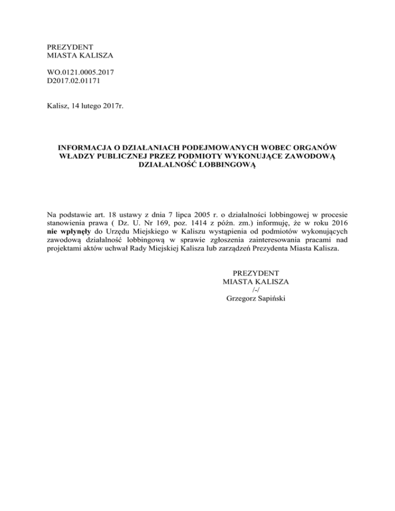 PREZYDENT MIASTA KALISZA WO.0121.0005.2017 D2017.02.01171 Kalisz, 14 lutego 2017r. INFORMACJA O DZIAŁANIACH PODEJMOWANYCH WOBEC ORGANÓW WŁADZY PUBLICZNEJ PRZEZ PODMIOTY WYKONUJĄCE ZAWODOWĄ DZIAŁALNOŚĆ LOBBINGOWĄ Na podstawie art. 18 ustawy z dnia 7 lipca 2005 r. o działalności lobbingowej w procesie stanowienia prawa ( Dz. U. Nr 169, poz. 1414 z późn. zm.) informuję, że w roku 2016 nie wpłynęły do Urzędu Miejskiego w Kaliszu wystąpienia od podmiotów wykonujących zawodową działalność lobbingową w sprawie zgłoszenia zainteresowania pracami nad projektami aktów uchwał Rady Miejskiej Kalisza lub zarządzeń Prezydenta Miasta Kalisza. PREZYDENT MIASTA KALISZA /-/ Grzegorz Sapiński