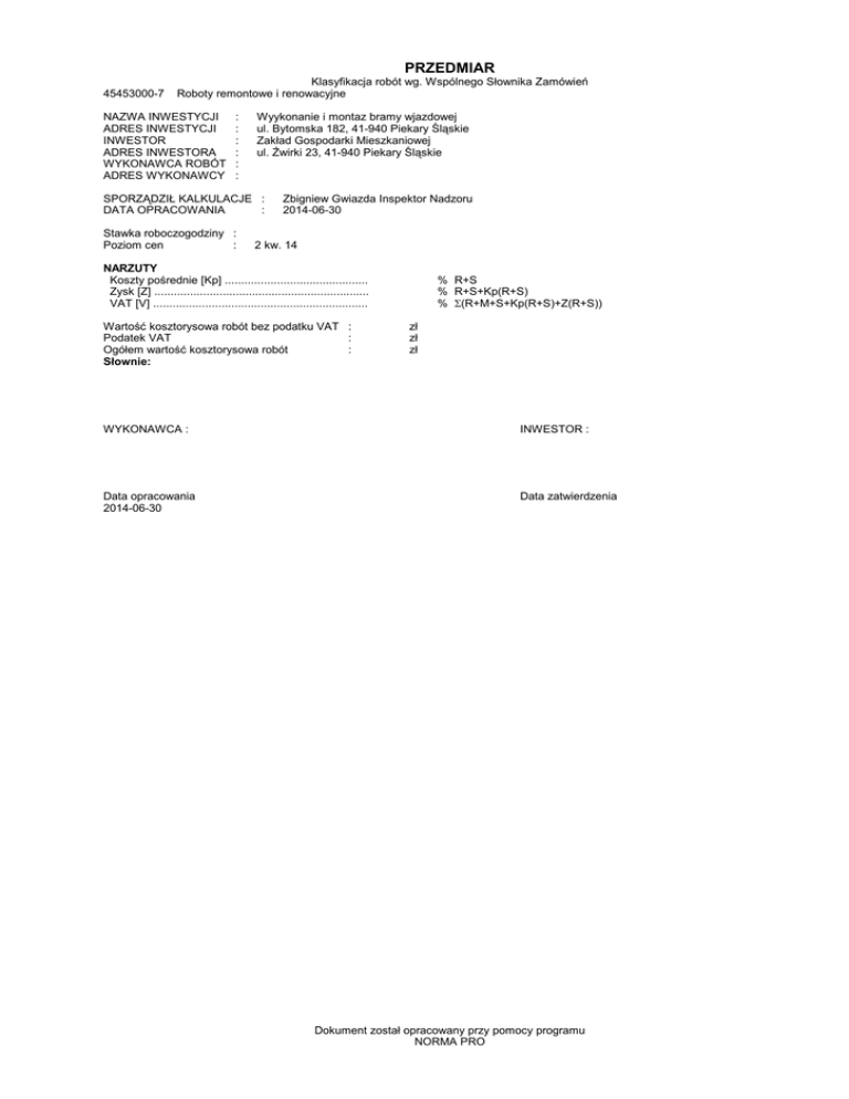 przedmiar - Zakład Gospodarki Mieszkaniowej w Piekarach Śląskich
