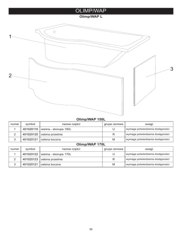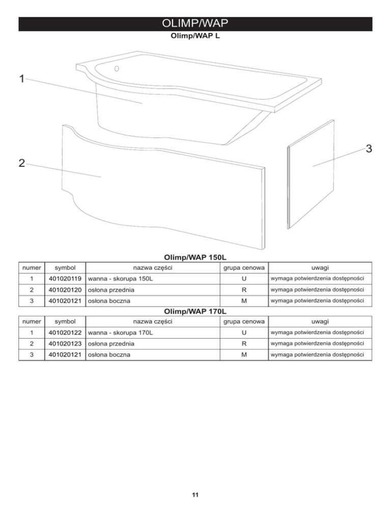 OLIMP/WAP Olimp/WAP L 1 3 2 Olimp/WAP 150L numer symbol 1 401020119 2 3 nazwa części grupa cenowa uwagi U wymaga potwierdzenia dostępności 401020120 osłona przednia R wymaga potwierdzenia dostępności 401020121 osłona boczna M wymaga potwierdzenia dostępności wanna - skorupa 150L Olimp/WAP 170L numer symbol nazwa części grupa cenowa uwagi 1 401020122 wanna - skorupa 170L U wymaga potwierdzenia dostępności 2 401020123 osłona przednia R wymaga potwierdzenia dostępności 3 401020121 osłona boczna M wymaga potwierdzenia dostępności 11 Olimp/WAP P 1 2 3 Olimp/WAP 150P numer symbol nazwa części grupa cenowa uwagi 1 401020124 wanna - skorupa 150P U wymaga potwierdzenia dostępności 2 401020121 osłona boczna M wymaga potwierdzenia dostępności 3 401020120 osłona przednia R wymaga potwierdzenia dostępności Olimp/WAP 170P numer symbol nazwa części grupa cenowa uwagi 1 401020125 wanna - skorupa 170P U wymaga potwierdzenia dostępności 2 401020121 osłona boczna M wymaga potwierdzenia dostępności 3 401020123 osłona przednia R wymaga potwierdzenia dostępności 12 Olimp/WAP - akcesoria 1 2 3 4 5 6 7 8 9 10 11 12 13 14 15 16 17 18 19 20 numer symbol nazwa części grupa cenowa 1 403010076 zestaw montażowy wanny J 2 403010077 zestaw montażowy przedniej osłony H 3 403010078 zestaw montażowy bocznej osłony G 4 105050017 drenaż J 5 6 7 8 9 10 11 12 13 14 15 16 17 18 19 20 13 uwagi