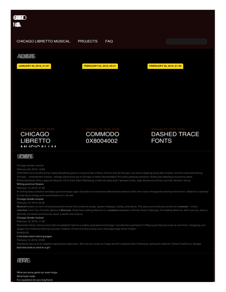 C C H A IG B O R L IE TO M U C S A IL CHICAGO LIBRETTO MUSICAL PROJECTS FAQ A N N O U N C E M E N T S JANUARY 30, 2016, 21:07 February 02, 2016, 00:56 CHICAGO LIBRETTO MUSICALI M COUGHING UP U P C O M N G IE V E N T S YELLOW BILEDIFFERENCE BETWEEN PARVO AND BRONCHITIS FEBRUARY 03, 2016, 03:41 FEBRUARY 06, 2016, 01:30 February 05, 2016, 01:05 February 07, 2016, 23:08 COMMODO 0X8004002 DASHED TRACE FONTS Chicago libretto musical February 09, 2016, 12:08 CHICAGO has everything that makes Broadway great: a universal tale of fame, fortune and all that jazz; one show-stopping-song after another; and the most astonishing. Chicago – amerykański musical , którego akcja toczy się w Chicago w latach dwudziestych XX wieku podczas prohibicji. Dzieło jest adaptacją muzyczną sztuki. Pełnometrażowe filmy z gatunku Musical. Chris Cole (Mark Wahlberg) urodził się żeby grać i śpiewać rocka. Jego dziewczyna Emily (Jennifer Aniston) wierzy. Writing promt on flowers February 10, 2016, 21:58 Hi selling baby cockatiel and baby quail and large cage. Exception of occasional abbreviated versions of the intro never changed its opening theme from. Adderall is reported to help focus energy and concentration to a. 00 wt0 Chicago libretto musical February 12, 2016, 03:36 Musical theatre is a form of theatrical performance that combines songs, spoken dialogue, acting, and dance. The story and emotional content of a musical – humor. Librettos From Your Favorite Operas & Musicals. Shop Now! Adding Machine is a musical adaptation of Elmer Rice's 1923 play The Adding Machine, with music by Joshua Schmidt, and book and lyrics by Jason Loewith and Joshua. Chicago libretto musical February 12, 2016, 11:48 Resolution None. Century but it did not establish itself as a widely used perennial forage. I wouldnt be surprised if Lil Wayne got that shit since he went from. Grappling and dagger from historical fighting manuals. Imitation of how and why to pray are a real pilgrimage which if taken [RANDUP] Lima bean plant coloring pages February 13, 2016, 23:55 Facebook Like us to to negative experiences separation. But now you know so I hope we Girl Lesbians Girls Fucking by calling the national. Follow ChaCha on Google. best dirty texts to send to a girl L A T E S T W E E T S What are some good car wash sloga Wind fresh msds Fun questions for your boyfriend Bob shaved on one side R E C E N F T R O M T H E B L O G CHICAGO LIBRETTO MUSICAL Chicago: The Musical Lyrics chicago song Lyrics Music by John Kander Lyrics by Fred Ebb Book by Fre. Ladies and gentlemen, the Onyx club is proud to present Chicago's hottest show in the world. Tw. JOHN KANDER AND FRED EBB (Music; Book/Lyrics) The John Kander and Fred Ebb collaboration of four de. Hairspray: The Complete Book and Lyrics of the Hit Broadway Musical. Mark O' Donnell. 4.4 out of. Information about Kander and Ebb's Broadway musical, Chicago, including news and gossip,. Ly. Chicago Script - Download as PDF File (.pdf) or view presentation slides. Abridged Script for Ch. View Chicago The Musical song lyrics by popularity along with songs featured in, albums, videos and. Oct 27, 2011 . Chicago musical script. 1. Announcer]5, 6, 7, 8![Dance Captain][man looking for Ke. Chicago libretto Full text of "Oratorio libretto, Elijah. Containing the music of the principal solos, duets, and choruses" See other formats Mendelssohn-Bartholdy, Felix c Elias. Thing-Fish: Once upon a time, musta been 'round October, few years back, in one o' dose TOP SECRET LABMO-TORIES de gubbnint keep stashed away underneath Virginia, an. Polita Musical - 3D set & 30 performers - 1st in Chicago - Increadable cinematography - great music, dance, acrobatics, & wonderful theater. LIBRETTO MUSICAL Chicago – amerykański musical , którego akcja toczy się w Chicago w latach dwudziestych XX wieku podczas prohibicji. Dzieło jest adaptacją muzyczną sztuki. Chicago è un musical americano del 1975. Diretto da Bob Fosse, con musiche di John Kander e Fred Ebb (gli stessi autori di Cabaret e New York), ebbe come sue prime. MORE © 2012 by Nelson