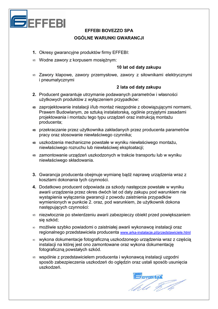 EFFEBI BOVEZZO SPA OGÓLNE WARUNKI GWARANCJI 1. Okresy gwarancyjne produktów firmy EFFEBI: • Wodne zawory z korpusem mosięŜnym: 10 lat od daty zakupu • Zawory klapowe, zawory przemysłowe, zawory z siłownikami elektrycznymi i pneumatycznymi 2 lata od daty zakupu 2. Producent gwarantuje utrzymanie podawanych parametrów i własności uŜytkowych produktów z wyłączeniem przypadków: • zaprojektowanie instalacji i/lub montaŜ niezgodnie z obowiązującymi normami, Prawem Budowlanym, ze sztuką instalatorską, ogólnie przyjętymi zasadami projektowania i montaŜu tego typu urządzeń oraz instrukcją montaŜu producenta; • przekraczanie przez uŜytkownika zakładanych przez producenta parametrów pracy oraz stosowanie niewłaściwego czynnika; • uszkodzenia mechaniczne powstałe w wyniku niewłaściwego montaŜu, niewłaściwego rozruchu lub niewłaściwej eksploatacji; • zamontowanie urządzeń uszkodzonych w trakcie transportu lub w wyniku niewłaściwego składowania. 3. Gwarancja producenta obejmuje wymianę bądź naprawę urządzenia wraz z kosztami dokonania tych czynności. 4. Dodatkowo producent odpowiada za szkody następcze powstałe w wyniku awarii urządzenia przez okres dwóch lat od daty zakupu pod warunkiem nie wystąpienia wyłączenia gwarancji z powodu zaistnienia przypadków wymienionych w punkcie 2. oraz, pod warunkiem, Ŝe uŜytkownik dokona następujących czynności: • niezwłocznie po stwierdzeniu awarii zabezpieczy obiekt przed powiększaniem się szkód; • moŜliwie szybko powiadomi o zaistniałej awarii wykonawcę instalacji oraz regionalnego przedstawiciela producenta www.arka-instalacje.pl/przedstawiciele.html • wykona dokumentacje fotograficzną uszkodzonego urządzenia wraz z częścią instalacji na której jest ono zamontowane oraz wykona dokumentację fotograficzną powstałych szkód. • wspólnie z przedstawicielem producenta i wykonawcą instalacji uzgodni sposób zabezpieczenia uszkodzeń do oględzin oraz ustali sposób usunięcia uszkodzeń.