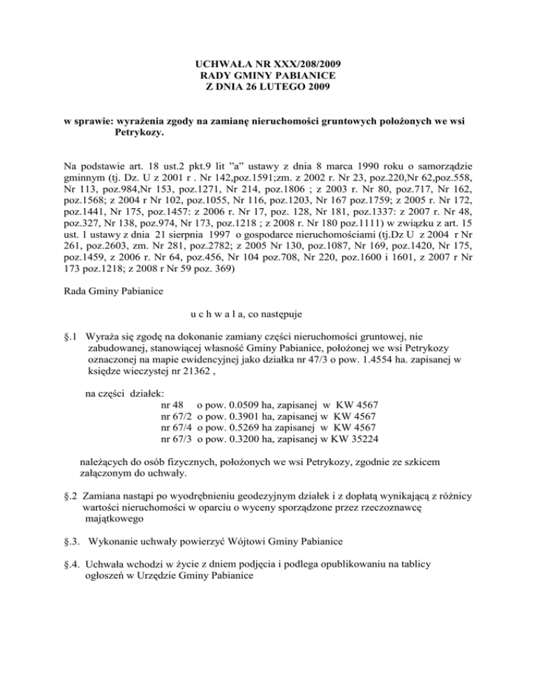 UCHWAŁA NR XXX/208/2009 RADY GMINY PABIANICE Z DNIA 26 LUTEGO 2009 w sprawie: wyraŜenia zgody na zamianę nieruchomości gruntowych połoŜonych we wsi Petrykozy. Na podstawie art. 18 ust.2 pkt.9 lit ”a” ustawy z dnia 8 marca 1990 roku o samorządzie gminnym (tj. Dz. U z 2001 r . Nr 142,poz.1591;zm. z 2002 r. Nr 23, poz.220,Nr 62,poz.558, Nr 113, poz.984,Nr 153, poz.1271, Nr 214, poz.1806 ; z 2003 r. Nr 80, poz.717, Nr 162, poz.1568; z 2004 r Nr 102, poz.1055, Nr 116, poz.1203, Nr 167 poz.1759; z 2005 r. Nr 172, poz.1441, Nr 175, poz.1457: z 2006 r. Nr 17, poz. 128, Nr 181, poz.1337: z 2007 r. Nr 48, poz.327, Nr 138, poz.974, Nr 173, poz.1218 ; z 2008 r. Nr 180 poz.1111) w związku z art. 15 ust. 1 ustawy z dnia 21 sierpnia 1997 o gospodarce nieruchomościami (tj.Dz U z 2004 r Nr 261, poz.2603, zm. Nr 281, poz.2782; z 2005 Nr 130, poz.1087, Nr 169, poz.1420, Nr 175, poz.1459, z 2006 r. Nr 64, poz.456, Nr 104 poz.708, Nr 220, poz.1600 i 1601, z 2007 r Nr 173 poz.1218; z 2008 r Nr 59 poz. 369) Rada Gminy Pabianice u c h w a l a, co następuje §.1 WyraŜa się zgodę na dokonanie zamiany części nieruchomości gruntowej, nie zabudowanej, stanowiącej własność Gminy Pabianice, połoŜonej we wsi Petrykozy oznaczonej na mapie ewidencyjnej jako działka nr 47/3 o pow. 1.4554 ha. zapisanej w księdze wieczystej nr 21362 , na części działek: nr 48 nr 67/2 nr 67/4 nr 67/3 o pow. 0.0509 ha, zapisanej w KW 4567 o pow. 0.3901 ha, zapisanej w KW 4567 o pow. 0.5269 ha zapisanej w KW 4567 o pow. 0.3200 ha, zapisanej w KW 35224 naleŜących do osób fizycznych, połoŜonych we wsi Petrykozy, zgodnie ze szkicem załączonym do uchwały. §.2 Zamiana nastąpi po wyodrębnieniu geodezyjnym działek i z dopłatą wynikającą z róŜnicy wartości nieruchomości w oparciu o wyceny sporządzone przez rzeczoznawcę majątkowego §.3. Wykonanie uchwały powierzyć Wójtowi Gminy Pabianice §.4. Uchwała wchodzi w Ŝycie z dniem podjęcia i podlega opublikowaniu na tablicy ogłoszeń w Urzędzie Gminy Pabianice