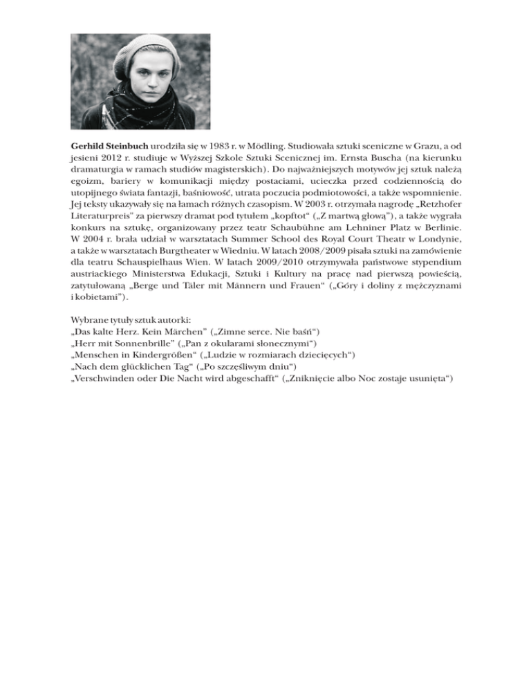 Gerhild Steinbuch urodzi³a siê w 1983 r. w Mödling. Studiowa³a sztuki sceniczne w Grazu, a od jesieni 2012 r. studiuje w Wy¿szej Szkole Sztuki Scenicznej im. Ernsta Buscha (na kierunku dramaturgia w ramach studiów magisterskich). Do najwa¿niejszych motywów jej sztuk nale¿¹ egoizm, bariery w komunikacji miêdzy postaciami, ucieczka przed codziennoœci¹ do utopijnego œwiata fantazji, baœniowoœæ, utrata poczucia podmiotowoœci, a tak¿e wspomnienie. Jej teksty ukazywa³y siê na ³amach ró¿nych czasopism. W 2003 r. otrzyma³a nagrodê „Retzhofer Literaturpreis" za pierwszy dramat pod tytu³em „kopftot“ („Z martw¹ g³ow¹”), a tak¿e wygra³a konkurs na sztukê, organizowany przez teatr Schaubühne am Lehniner Platz w Berlinie. W 2004 r. bra³a udzia³ w warsztatach Summer School des Royal Court Theatr w Londynie, a tak¿e w warsztatach Burgtheater w Wiedniu. W latach 2008/2009 pisa³a sztuki na zamówienie dla teatru Schauspielhaus Wien. W latach 2009/2010 otrzymywa³a pañstwowe stypendium austriackiego Ministerstwa Edukacji, Sztuki i Kultury na pracê nad pierwsz¹ powieœci¹, zatytu³owan¹ „Berge und Täler mit Männern und Frauen“ („Góry i doliny z mê¿czyznami i kobietami”). Wybrane tytu³y sztuk autorki: „Das kalte Herz. Kein Märchen” („Zimne serce. Nie baœñ“) „Herr mit Sonnenbrille” („Pan z okularami s³onecznymi“) „Menschen in Kindergrößen“ („Ludzie w rozmiarach dzieciêcych“) „Nach dem glücklichen Tag“ („Po szczêœliwym dniu“) „Verschwinden oder Die Nacht wird abgeschafft“ („Znikniêcie albo Noc zostaje usuniêta“) Instytut Filologii Germañskiej UJ zaproszenie na spotkanie z austriack¹ pisark¹ Gerhild Steinbuch moderacja Anna Barbara D¹browska Instytut Filologii Germañskiej UJ spotkanie w jêzyku niemieckim 15 kwietnia 2013 (poniedzia³ek), godz. 17.00 Galeria Austriackiego Konsulatu Generalnego, Kraków, ul. Cybulskiego 9