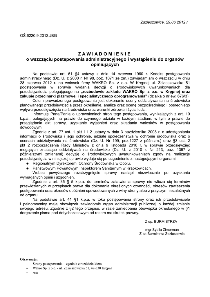 Zdzieszowice, 29.06.2012 r. OŚ.6220.9.2012.JBG ZAWIADOMIENIE o wszczęciu postepowania administracyjnego i wystąpieniu do organów opiniujących Na podstawie art. 61 §4 ustawy z dnia 14 czerwca 1960 r. Kodeks postępowania administracyjnego (Dz. U. z 2000 r. Nr 98, poz. 1071 ze zm.) zawiadamiam o wszczęciu w dniu 28 czerwca 2012 r. na wniosek firmy WAKRO Sp. z o.o. W Krępnej ul. Zdzieszowicka 51 podstępowania w sprawie wydania decyzji o środowiskowych uwarunkowaniach dla przedsięwziecia polegającego na „rozbudowie zakładu WAKRO Sp. z o.o. w Krępnej oraz zakupie przecinarki plazmowej i specjalistycznego oprogramowania” (działka o nr ew. 676/3) Celem prowadzonego postępowania jest dokonanie oceny oddziaływania na środowisko planowanego przedsięwzięcia przez określenie, analizę oraz ocenę bezpośredniego i pośredniego wpływu przedsięwzięcia na środowisko oraz warunki zdrowia i życia ludzi. Informuję Pana/Panią o uprawnieniach stron tego postępowania, wynikających z art. 10 k.p.a., polegających na prawie do czynnego udziału w każdym stadium, w tym o prawie do przeglądania akt sprawy, uzyskanie wyjaśnień oraz składania wniosków w postępowaniu dowodowym. Zgodnie z art. 77 ust. 1 pkt 1 i 2 ustawy w dnia 3 października 2008 r. o udostępnianiu informacji o środowisku i jego ochronie, udziale społeczeństwa w ochronie środowiska oraz o ocenach oddziaływania na środowisko (Dz. U. Nr 199, poz.1227 z późn.zm.) oraz §3 ust. 2 pkt 2 rozporządzenia Rady Ministrów z dnia 9 listopada 2010 r. w sprawie przedsięwzięć mogących znacząco oddziaływać na środowisko (Dz. U. z 2010 r. Nr 213, poz. 1397 z późniejszymi zmianami) decyzję o środowiskowych uwarunkowaniach zgody na realizację przedsięwzięcia w niniejszej sprawie wydaje się po uzgodnieniu z następującymi organami: Regionalnym Dyrektorem Ochrony Środowiska w Opolu, Państwowym Powiatowym Inspektorem Sanitarnym w Krapkowicach. Wobec powyższego rozstrzygnięcie sprawy nastąpi niezwłocznie po uzyskaniu wymaganych opinii i uzgodnień. Zgodnie z art. 35 § 5 k.p.a. do terminów załatwienia sprawy nie wlicza się terminów przewidzianych w przepisach prawa dla dokonania określonych czynności, okresów zawieszenia postępowania oraz okresów opóźnień spowodowanych z winy strony albo z przyczyn niezależnych od organu. Na podstawie art. 41 §1 k.p.a. w toku postępowania strony oraz ich przedstawiciele i pełnomocnicy mają obowiązek zawiadomić organ administracji publicznej o każdej zmianie swojego adresu. Zgodnie z §2 tego przepisu, w razie zaniedbania obowiązku określonego w §1 doręczenie pisma pod dotychczasowym ad resem ma skutek prawny. Z up. BURMISTRZA mgr Sybila Zimerman Z-ca Burmistrza Zdzieszowic Otrzymują: – Strony postępowania – zgodnie z rozdzielnikiem – Wakro Sp. z o.o. - ul. Zdzieszowicka 51, 47-330 Krępna – A/a