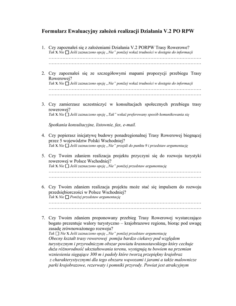 Formularz Ewaluacyjny założeń realizacji Działania V.2 PO RPW 1. Czy zapoznałeś się z założeniami Działania V.2 PORPW Trasy Rowerowe? Tak X Nie Jeśli zaznaczono opcję „Nie” poniżej wskaż trudności w dostępie do informacji ……………………………………………………………………………………… ……………………………………………………………………………………… 2. Czy zapoznałeś się ze szczegółowymi mapami propozycji przebiegu Trasy Rowerowej? Tak X Nie Jeśli zaznaczono opcję „Nie” poniżej wskaż trudności w dostępie do informacji ……………………………………………………………………………………… ……………………………………………………………………………………… 3. Czy zamierzasz uczestniczyć w konsultacjach społecznych przebiegu trasy rowerowej? Tak X Nie Jeśli zaznaczono opcję „Tak” wskaż preferowany sposób komunikowania się Spotkania konsultacyjne, listownie, fax, e-mail. 4. Czy popierasz inicjatywę budowy ponadregionalnej Trasy Rowerowej biegnącej przez 5 województw Polski Wschodniej? Tak X Nie Jeśli zaznaczono opcję „Nie” przejdź do punktu 9 i przedstaw argumentację 5. Czy Twoim zdaniem realizacja projektu przyczyni się do rozwoju turystyki rowerowej w Polsce Wschodniej? Tak X Nie Jeśli zaznaczono opcję „Nie” poniżej przedstaw argumentację ……………………………………………………………………………………… ……………………………………………………………………………………… 6. Czy Twoim zdaniem realizacja projektu może stać się impulsem do rozwoju przedsiębiorczości w Polsce Wschodniej? Tak X Nie Poniżej przedstaw argumentację ……………………………………………………………………………………… ……………………………………………………………………………………… 7. Czy Twoim zdaniem proponowany przebieg Trasy Rowerowej wystarczająco bogato prezentuje walory turystyczno – krajobrazowe regionu, biorąc pod uwagę zasadę zrównoważonego rozwoju? Tak Nie X Jeśli zaznaczono opcję „Nie” poniżej przedstaw argumentację Obecny kształt trasy rowerowej pomija bardzo ciekawy pod względem turystycznym i przyrodniczym obszar powiatu krasnostawskiego który cechuje duża różnorodność ukształtowania terenu, występują tu bowiem na przemian wzniesienia sięgające 300 m i padoły które tworzą przepiękny krajobraz z charakterystycznymi dla tego obszaru wąwozami i jarami a także malownicze parki krajobrazowe, rezerwaty i pomniki przyrody. Powiat jest atrakcyjnym miejscem aktywnego wypoczynku dla lubiących różnorodność przyrody, piękno krajobrazu czyste środowisko i jego zasoby. Wykorzystanie w/w walorów poprzez zaplanowanie szeregu działań wchodzących w realizację projektu w dużym zakresie przyczyni się do zachowania zasady zrównoważonego rozwoju. Pomijając powiat krasnostawski projekt niewątpliwie traci w znacznym stopniu na wartości. 8. Czy satysfakcjonuje Cię proponowany przebieg Trasy Rowerowej, jako Powiat Krasnostawski *? Tak Nie X 8 a) Jeśli nie satysfakcjonuje Cię proponowany przebieg przedstaw swą argumentację, wykorzystując szczegółowe mapy załączone w oddzielnym pliku do niniejszego formularza. W opisie odnoś się do konkretnych wycinków, co pozwoli wyselekcjonować odcinki trasy, co do których brak zastrzeżeń. Powiat Krasnostawski zgłasza zastrzeżenia odnośnie przebiegu trasy rowerowej przebiegającej przez teren województwa lubelskiego na odcinku łączącym Chełm i Zamość. Zaproponowany przebieg trasy pomijający obszar powiatu krasnostawskiego w znaczący sposób ogranicza szanse rozwoju powiatu, który niewątpliwie ma predyspozycje aby stać się miejscem atrakcyjnym dla turystyki rowerowej jako głównej formy wypoczynku i rekreacji. Argumentów przemawiających za uwzględnieniem powiatu w przedsięwzięciu jest wiele, wśród nich możemy wymienić m.in. bardzo dobrą bazę gastronomiczną i noclegową – bogata oferta agroturystyczna , atrakcyjne położenie geograficzne – większość obszaru powiatu to malownicze krajobrazy ze znacznym zróżnicowaniem w ukształtowaniu terenu, czyste środowisko, ciekawe obiekty zabytkowe i krajoznawcze oraz bogaty kalendarz imprez kulturalnych. Powiat krasnostawski stanowi także ważny węzeł komunikacyjny pomiędzy Chełmem, Zamościem i Lublinem, w związku z tym jest naturalnym punktem przesiadkowym. 8 b) Jeśli masz propozycję alternatywną przedstaw argumentację i opis nowego rozwiązania. Poniżej opisz alternatywny przebieg trasy rowerowej. Jeśli w ramach propozycji podjęto próby uzgodnień z potencjalnymi partnerami, opisz jakie ustalenia względem wspólnych działań zapadły. Powiat krasnostawski proponuje alternatywny przebieg trasy rowerowej na odcinku pomiędzy Chełmem i Zamościem z uwzględnieniem w jej przebiegu obszaru powiatu krasnostawskiego. Proponowany przebieg trasy to: Chełm Rejowiec – Krupe –Krasnystaw – Tarnogóra - Izbica – Zamość. Taki przebieg trasy rowerowej pozwoli na popularyzację wielu ciekawych zabytków: m.in. Wieża Ariańska, XV wieczne ruiny zamku w Krupem, odrestaurowane Kolegium Pojezuickie wraz z zabytkowym kościołem i przestrzenią rynku miejskiego oraz popularyzację walorów krajoznawczych do których w szczególności zaliczyć możemy rezerwat Wodny Dół i wiele innych parków i kompleksów leśnych. Obecna koncepcja przebiegu trasy przez województwo lubelskie znacząco odbiega od pierwotnego jej zarysu który przewidywał jej przebieg przez powiat krasnostawski. Obecny projekt ogranicza szansę na dostateczny rozwój usług turystycznych w powiecie oraz jego gminach. W związku z powyższym powiat krasnostawski wnosi alternatywny przebieg trasy rowerowej obejmujący swym zasięgiem atrakcyj