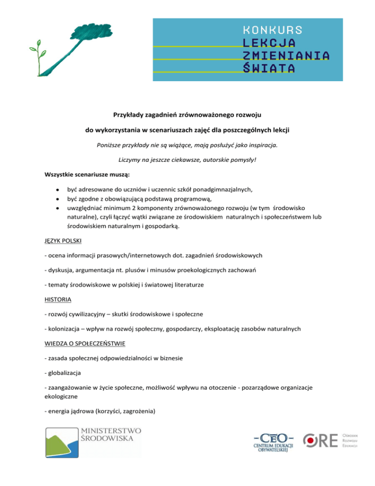 Przykłady zagadnieo zrównoważonego rozwoju do wykorzystania w scenariuszach zajęć dla poszczególnych lekcji Poniższe przykłady nie są wiążące, mają posłużyć jako inspiracja. Liczymy na jeszcze ciekawsze, autorskie pomysły! Wszystkie scenariusze muszą: byd adresowane do uczniów i uczennic szkół ponadgimnazjalnych, byd zgodne z obowiązującą podstawą programową, uwzględniad minimum 2 komponenty zrównoważonego rozwoju (w tym środowisko naturalne), czyli łączyd wątki związane ze środowiskiem naturalnych i społeczeostwem lub środowiskiem naturalnym i gospodarką. JĘZYK POLSKI - ocena informacji prasowych/internetowych dot. zagadnieo środowiskowych - dyskusja, argumentacja nt. plusów i minusów proekologicznych zachowao - tematy środowiskowe w polskiej i światowej literaturze HISTORIA - rozwój cywilizacyjny – skutki środowiskowe i społeczne - kolonizacja – wpływ na rozwój społeczny, gospodarczy, eksploatację zasobów naturalnych WIEDZA O SPOŁECZEŃSTWIE - zasada społecznej odpowiedzialności w biznesie - globalizacja - zaangażowanie w życie społeczne, możliwośd wpływu na otoczenie - pozarządowe organizacje ekologiczne - energia jądrowa (korzyści, zagrożenia) MATEMATYKA - obliczanie oszczędności finansowych budżetu domowego, przy zastosowaniu sprzętu elektrooszczędnego GEOGRAFIA - eksploatacja zasobów naturalnych – skutki środowiskowe, społeczne, korzyści ekonomiczne - urbanizacja – zagrożenia środowiskowe i społeczne związane z rozrostem aglomeracji miejskich - globalizacja BIOLOGIA - genetycznie modyfikowane organizmy (co to jest, jaki wpływ mają na zdrowie człowieka) - bioróżnorodnośd - obszary chronione a konflikty społeczne i gospodarcze, szansa na rozwój, czy hamulec dla inwestycji, CHEMIA - energetyka jądrowa (korzyści i zagrożenia) - substancje chemiczne – wykorzystanie w gospodarce, wpływ na środowisko i zdrowie człowieka FIZYKA - hałas (oddziaływanie w środowisku i na zdrowie człowieka) - promieniowanie (oddziaływanie w środowisku i na zdrowie człowieka) PODSTAWY PRZEDSIĘBIORCZOŚCI - certyfikaty jakości, w tym środowiskowe (korzyści dla rozwoju firmy) - społeczna odpowiedzialnośd biznesu WIEDZA O KULTURZE - środowisko naturalne w kulturze i sztuce - światowe dziedzictwo przyrodnicze i kulturowe – element promocji kraju/regionu/miejsca, wpływ na turystykę