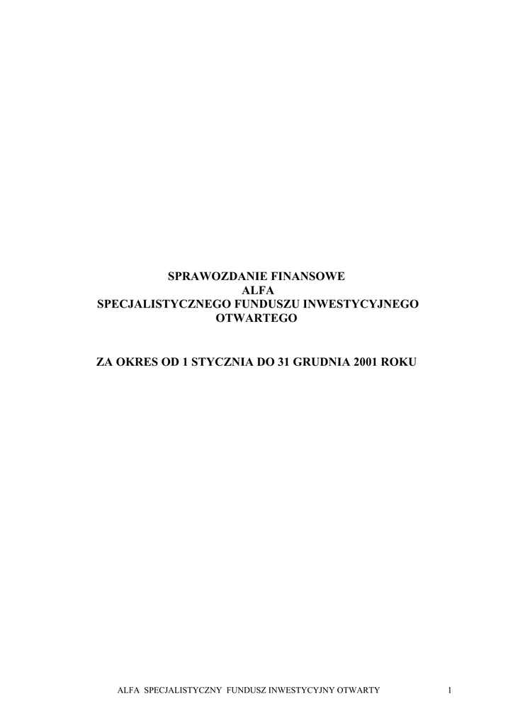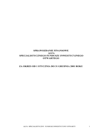 SPRAWOZDANIE FINANSOWE ALFA SPECJALISTYCZNEGO FUNDUSZU INWESTYCYJNEGO OTWARTEGO ZA OKRES OD 1 STYCZNIA DO 31 GRUDNIA 2001 ROKU ALFA SPECJALISTYCZNY FUNDUSZ INWESTYCYJNY OTWARTY 1 ALFA SPECJALISTYCZNY FUNDUSZ INWESTYCYJNY OTWARTY WSTĘP Fundusz Nazwa Funduszu ALFA Specjalistyczny Fundusz Inwestycyjny Otwarty. Podstawy prawne działalności Fundusz ALFA jest Specjalistycznym funduszem inwestycyjnym otwartym w rozumieniu ustawy z dnia 28 sierpnia 1997 r. – Ustawa o funduszach inwestycyjnych (Dz. U. z 1997 r. Nr 139, poz. 933) działającym zgodnie z w/w ustawą i Statutem Funduszu ALFA SFIO zatwierdzonym przez Komisję Papierów Wartościowych i Giełd (decyzja z dnia 2 sierpnia 2000 r., znak DFN1 – 409/18 – 14/00). Fundusz został zarejestrowany 14 września 2000 r. w Sądzie Okręgowym w Warszawie, VII Wydział Cywilny i Rejestrowy (nr rejestru RFj 77, REGON 016404535). Fundusz posiada osobowość prawną. Publikacja prospektu informacyjnego Prospekt informacyjny Funduszu ALFA SFIO został opublikowany w dzienniku „Prawo i Gospodarka” w dniu 6 października 2000 r. Zapisy na Jednostki Uczestnictwa Funduszu trwały od 17 sierpnia do 24 sierpnia 2000 r. Pierwsza wycena nastąpiła 20 września 2000 r. Podstawowe dane o polityce inwestycyjnej Funduszu ALFA SFIO Celem inwestycyjnym Funduszu jest osiąganie dochodów z lokowania jego Aktywów które powiększają wartość Aktywów Funduszu i odpowiednio wartość Jednostki Uczestnictwa. Dochód Funduszu może zostać przyznany Uczestnikom Funduszu jako Udział w Dochodzie Funduszu. ALFA SPECJALISTYCZNY FUNDUSZ INWESTYCYJNY OTWARTY 2 Kryterium doboru lokat jest uzyskiwanie możliwie wysokiej stopy zwrotu przy jednoczesnym minimalizowaniu ryzyka zmienności stóp procentowych, ryzyka ograniczonej płynności i ryzyka nie wypłacalności banku, w którym dokonywane są lokaty. Fundusz nie gwarantuje osiągnięcia celu inwestycyjnego. Zasady dywersyfikacji lokat Funduszu Zgodnie z Ustawą o funduszach inwestycyjnych z dnia 28 sierpnia 1997 r. i artykułem 8 Statutu Fundusz przy dokonywaniu lokat stosuje ograniczenia inwestycyjne dla funduszu inwestycyjnego mieszanego i stosuje następujące zasady dywersyfikacji lokat 1. Fundusz lokuje swoje Aktywa w: 1.1. papiery wartościowe, w tym do 100 % wartości Aktywów Funduszu może być inwestowane w dłużne papiery wartościowe, 1.2. wierzytelności pieniężne o terminie wymagalności nie dłuższym niż rok, 1.3. waluty - pod warunkiem, że są one zbywalne i ich wartość może być ustalona nie rzadziej niż w każdym Dniu Wyceny. 2. Lokaty w dłużne papiery wartościowe, w tym lokaty w papiery wartościowe emitowane lub gwarantowane przez Skarb Państwa i Narodowy Bank Polski oraz w wierzytelności pieniężne o terminie wymagalności nie dłuższym niż rok, mogą stanowić do 100% wartości Aktywów Funduszu. 3. Fundusz może nabywać jednostki uczestnictwa w innych funduszach inwestycyjnych, w tym funduszach zarządzanych przez Towarzystwo lub tytuły uczestnictwa emitowane przez instytucje wspólnego inwestowania, mające siedzibę za granicą. W przypadku nabywania przez Fundusz jednostek uczestnictwa w funduszach inwestycyjnych zarządzanych przez Towarzystwo, Towarzystwo nie może pobierać wynagrodzenia ani obciążać Funduszu kosztami związanymi z lokowaniem Aktywów Funduszu w jednostki uczestnictwa tych funduszy. 4. Fundusz może dokonywać lokat w papiery wartościowe wymienione w art. 3 ust. 3 Prawa o publicznym obrocie, inne prawa pochodne od praw majątkowych będących przedmiotem lokat oraz transakcje terminowe, przy uwzględnieniu swojego celu inwestycyjnego ALFA SPECJALISTYCZNY FUNDUSZ INWESTYCYJNY OTWARTY 3 5. Do 5% wartości Aktywów Funduszu może być lokowane w papiery wartościowe wyemitowane przez jeden podmiot lub w wierzytelności wobec tego podmiotu albo w walutę jednego państwa. 6. Fundusz może lokować od 5% do 10% wartości Aktywów Funduszu w papiery wartościowe wyemitowane przez jeden podmiot lub w wierzytelności wobec tego podmiotu albo w walutę jednego państwa jeżeli łączna wartość takich lokat nie przekroczy 40% wartości Aktywów Funduszu. 7. Ograniczeń, o których mowa w ust. 5 i 6 nie stosuje się do: 7.1. lokat w papiery wartościowe emitowane lub gwarantowane przez Skarb Państwa albo Narodowy Bank Polski, 7.2. lokat w papiery wartościowe emitowane lub gwarantowane przez państwa należące do OECD oraz międzynarodowe instytucje finansowe, których członkiem jest Rzeczpospolita Polska lub przynajmniej jedno z państw należących do OECD, o ile Komisja na to zezwoli. 8. Jeżeli lokaty, o których mowa w ust. 7, nie spełniają warunków określonych w ust. 5 i 6, powinny być dokonywane w papiery wartościowe co najmniej sześciu różnych emisji, z tym że wartość lokaty w papiery żadnej z tych emisji nie może przewyższać 30% wartości Aktywów Funduszu. 9. Lokaty, o których mowa w pkt. 7. dokonywane w papiery wartościowe Skarbu Państwa oraz Narodowego Banku Polskiego lub papiery wartościowe gwarantowane przez te podmioty, mogą przewyższać 35% wartości Aktywów Funduszu. Fundusz może zaciągać, wyłącznie w bankach, pożyczki i kredyty, o terminie spłaty do roku, w łącznej wysokości nie przekraczającej 10% wartości Aktywów Funduszu w chwili zaciągania tych pożyczek i kredytów. Fundusz utrzymuje, wyłącznie w zakresie niezbędnym do zaspokojenia swoich bieżących zobowiązań, część swoich aktywów na rachunkach bankowych. Zarządzający Fundusz ALFA SFIO jest zarządzany przez WARTA Towarzystwo Funduszy Inwestycyjnych S.A. z siedzibą w Warszawie, przy ulicy Solec 48 (zarejestrowane w Sądzie Rejonowym dla m. st. Warszawy – XIX Wydział Gospodarczy Krajowego Rejestru Sądowego, nr KRS 0000012513). Akcjonariuszem Towarzystwa jest Towarzystwo Ubezpieczeń i Reasekuracji WARTA S.A. z siedzibą w Warszawie (100% akcji) ALFA SPECJALISTYCZNY FUNDUSZ INWESTYCYJNY OTWARTY 4 WARTA Towarzystwo Fundusz
