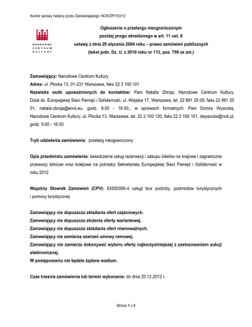 Numer sprawy nadany przez Zamawiającego: NCK/ZP/153/12 Ogłoszenie o przetargu nieograniczonym poniżej progu określonego w art. 11 ust. 8 ustawy z dnia 29 stycznia 2004 roku – prawo zamówień publicznych (tekst jedn. Dz. U. z 2010 roku nr 113, poz. 759 ze zm.) Zamawiający: Narodowe Centrum Kultury Adres: ul. Płocka 13, 01-231 Warszawa, faks 22 2 100 101 Nazwiska osób upoważnionych do kontaktów: Pani Natalia Zbroja, Narodowe Centrum Kultury, Dział ds. Europejskiej Sieci Pamięć i Solidarność, ul. Wiejska 17, Warszawa, tel. 22 891 25 05; faks 22 891 25 01, [email protected], godz. 9.00 - 16.00,; w sprawach formalnych: Pani Dorota Wysocka, Narodowe Centrum Kultury, ul. Płocka 13, Warszawa, tel. 22 2 100 120, faks 22 2 100 101, [email protected], godz. 9.00 - 16.00 Tryb udzielenia zamówienia: przetarg nieograniczony Opis przedmiotu zamówienia: świadczenie usług rezerwacji i zakupu biletów na krajowe i zagraniczne przewozy lotnicze oraz kolejowe na potrzeby Sekretariatu Europejskiej Sieci Pamięć i Solidarność w roku 2012 Wspólny Słownik Zamówień (CPV): 63500000-4 usługi biur podróży, podmiotów turystycznych i pomocy turystycznej Zamawiający nie dopuszcza składania ofert częściowych. Zamawiający nie dopuszcza złożenia oferty wariantowej. Zamawiający nie dopuszcza składania ofert równoważnych. Zamawiający nie zamierza zawrzeć umowy ramowej. Zamawiający nie zamierza dokonywać wyboru oferty najkorzystniejszej z zastosowaniem aukcji elektronicznej. W postępowaniu nie będzie żądane wadium. Czas trwania zamówienia lub termin wykonania: do dnia 20.12.2012 r. Strona 1 z 3 Numer sprawy nadany przez Zamawiającego: NCK/ZP/153/12 Wymagania od Wykonawców: O zamówienie mogą ubiegać się Wykonawcy, którzy spełniają warunki dotyczące: 1. posiadania uprawnień do wykonywania określonej działalności lub czynności, jeżeli przepisy prawa nakładają obowiązek ich posiadania, 2. posiadania wiedzy i doświadczenia niezbędnego do realizacji przedmiotu zamówienia, tj. wykonanie co najmniej pięciu potwierdzonych należytym wykonaniem usług - w okresie ostatnich trzech lat przed dniem wszczęcia postępowania o udzielenie zamówienia, a jeżeli okres prowadzenia działalności jest krótszy to w tym okresie - dotyczących rezerwacji i zakupu biletów na zagraniczne i krajowe przewozy lotnicze oraz kolejowe (łącznie) o wartości minimum 30 000,00 zł każda, 3. dysponowania odpowiednim potencjałem technicznym oraz osobami zdolnymi do wykonania zamówienia, 4. sytuacji ekonomicznej i finansowej umożliwiającej wykonanie przedmiotu zamówienia, tj. posiadania opłaconej polisy lub innego rodzaju ubezpieczenia od odpowiedzialności cywilnej w zakresie prowadzonej działalności związanej z przedmiotem zamówienia, na kwotę nie mniejszą niż 100 000,00 zł, 5. niepodlegania wykluczeniu z postępowania na podstawie art. 24 ust. 1 upzp. Opis sposobu dokonania oceny spełniania warunków udziału w postępowaniu: Ocena spełniania warunków udziału w postępowaniu zostanie dokonana na podstawie dokumentów złożonych przez Wykonawcę oraz Oświadczenia stanowiącego załącznik nr 2 do Specyfikacji Istotnych Warunków Zamówienia. Ocena spełniania warunków udziału w postępowaniu zostanie dokonana metodą: spełnia – nie spełnia. Kryteria oceny ofert: Lp. 1. 2. Kryterium Suma cen brutto opłat transakcyjnych za wystawienie jednego biletu (lotniczego zagranicznego i krajowego, kolejowego zagranicznego i krajowego) Wysokość upustu określonego w % od ceny biletu lotniczego przewoźnika, jakiego Wykonawca udzieli Zamawiającemu przy sprzedaży biletu lotniczego Strona 2 z 3 Znaczenie 40% 30% Numer sprawy nadany przez Zamawiającego: NCK/ZP/153/12 3. Wysokość upustu określonego w % od ceny biletu kolejowego przewoźnika, 30% jakiego Wykonawca udzieli Zamawiającemu przy sprzedaży biletu kolejowego RAZEM 100% Termin składania ofert: do dnia 13.09.2012 r. do godziny 12.00 w Narodowym Centrum Kultury, ul. Płocka 13, 01–231 Warszawa, na parterze, w recepcji. Termin związania z ofertą: 30 dni, licząc od upływu terminu składania ofert. Określenie sposobu uzyskania specyfikacji istotnych warunków zamówienia oraz adres strony internetowej, na której została zamieszczona Specyfikacja Istotnych Warunków Zamówienia: Specyfikacja Istotnych Warunków Zamówienia jest dostępna w siedzibie Zamawiającego, w Narodowym Centrum Kultury. Specyfikacja Istotnych Warunków Zamówienia została zamieszczona na stronie internetowej Zamawiającego www.nck.pl Data wywieszenia: 05.09.2012 r. Rafał Rogulski Zastępca Dyrektora Narodowego Centrum Kultury Strona 3 z 3