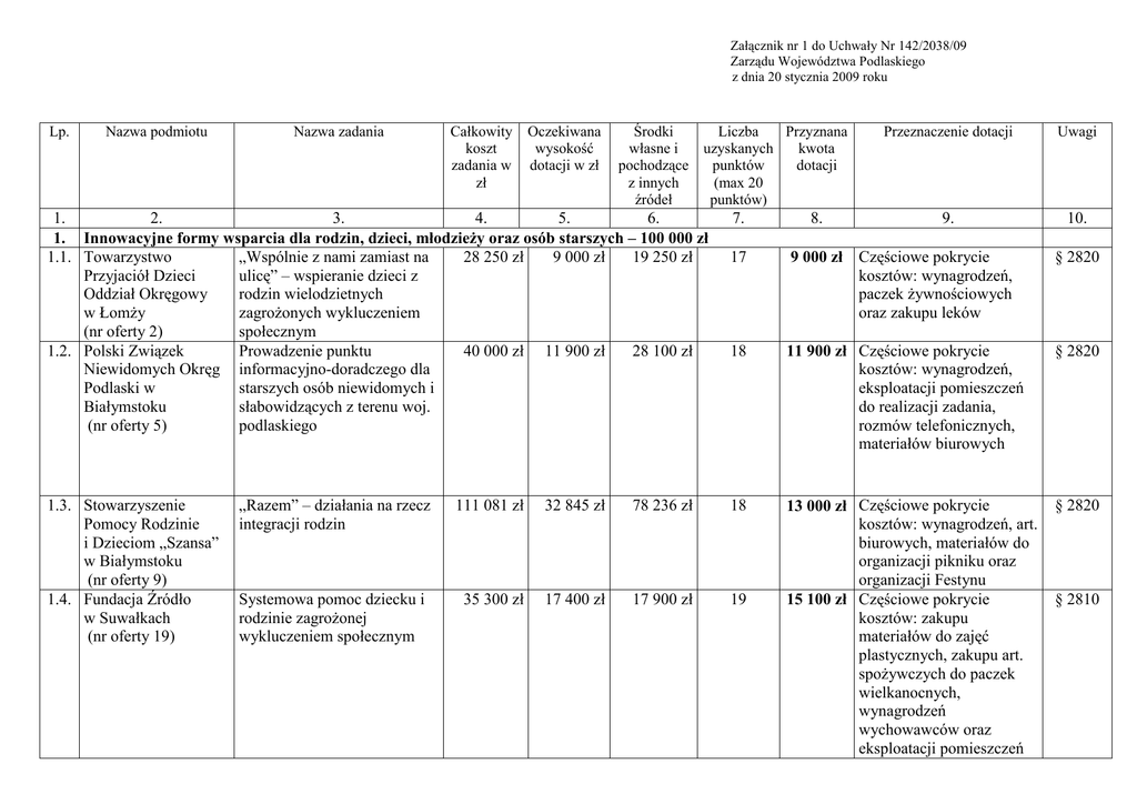 Załącznik nr 1 do Uchwały Nr 142/2038/09 Zarządu Województwa Podlaskiego z dnia 20 stycznia 2009 roku Lp. Nazwa podmiotu Nazwa zadania Całkowity koszt zadania w zł Oczekiwana wysokość dotacji w zł Środki Liczba Przyznana własne i uzyskanych kwota pochodzące punktów dotacji z innych (max 20 źródeł punktów) 1. 2. 3. 4. 5. 6. 1. Innowacyjne formy wsparcia dla rodzin, dzieci, młodzieŜy oraz osób starszych – 100 000 zł 1.1. Towarzystwo „Wspólnie z nami zamiast na 28 250 zł 9 000 zł 19 250 zł Przyjaciół Dzieci ulicę” – wspieranie dzieci z Oddział Okręgowy rodzin wielodzietnych w ŁomŜy zagroŜonych wykluczeniem (nr oferty 2) społecznym 1.2. Polski Związek Prowadzenie punktu 40 000 zł 11 900 zł 28 100 zł Niewidomych Okręg informacyjno-doradczego dla Podlaski w starszych osób niewidomych i Białymstoku słabowidzących z terenu woj. (nr oferty 5) podlaskiego 1.3. Stowarzyszenie Pomocy Rodzinie i Dzieciom „Szansa” w Białymstoku (nr oferty 9) 1.4. Fundacja Źródło w Suwałkach (nr oferty 19) 7. 8. Przeznaczenie dotacji Uwagi 9. 10. 17 9 000 zł Częściowe pokrycie kosztów: wynagrodzeń, paczek Ŝywnościowych oraz zakupu leków § 2820 18 11 900 zł Częściowe pokrycie kosztów: wynagrodzeń, eksploatacji pomieszczeń do realizacji zadania, rozmów telefonicznych, materiałów biurowych § 2820 13 000 zł Częściowe pokrycie kosztów: wynagrodzeń, art. biurowych, materiałów do organizacji pikniku oraz organizacji Festynu 15 100 zł Częściowe pokrycie kosztów: zakupu materiałów do zajęć plastycznych, zakupu art. spoŜywczych do paczek wielkanocnych, wynagrodzeń wychowawców oraz eksploatacji pomieszczeń § 2820 „Razem” – działania na rzecz integracji rodzin 111 081 zł 32 845 zł 78 236 zł 18 Systemowa pomoc dziecku i rodzinie zagroŜonej wykluczeniem społecznym 35 300 zł 17 400 zł 17 900 zł 19 § 2810 1.5. Kolneńskie Stowarzyszenie „Rodzina” w Kolnie (nr oferty 20) 1.6. Towarzystwo Przyjaciół Dzieci Oddział Okręgowy Suwałki (nr oferty 21) „Razem raźniej” 39 050 zł 19 000 zł 20 050 zł 18 15 500 zł Częściowe pokrycie kosztów: wynagrodzeń oraz wycieczki § 2820 „Mikołaj tuŜ, tuŜ ….” – wspieranie rodzin wielodzietnych i wielopokoleniowych poprzez przekazywanie świątecznych paczek Ŝywnościowych Innowacyjne formy wsparcia dla rodzin, dzieci, młodzieŜy oraz osób starszych 20 000 zł 15 000 zł 5 000 zł 14 10 000 zł Częściowe pokrycie kosztów zakupu art. spoŜywczych § 2820 46 100 zł 22 700 zł 23 400 zł 17 § 2830 329 001,40zł 1.8. Stowarzyszenie Bank Innowacyjne formy wsparcia 50 000 zł 279 001,40zł śywności w dla rodzin, dzieci, młodzieŜy Suwałkach oraz osób starszych (nr oferty 23) 648 782,40zł 177 845 zł 470 937,40 zł Ogółem zadanie nr 1 2. Wspieranie wypoczynku dzieci i młodzieŜy z rodzin wielodzietnych – 35 000 zł 2.1. Caritas Diecezji Zimowa akademia 8 700 zł 6 500 zł 2 200 zł ŁomŜyńskiej wolontariuszy – Sztuka (nr oferty 4) animacji czasu wolnego 15 14 500 zł Częściowe pokrycie kosztów: wyŜywienia dzieci, paczek świątecznych, poczęstunku na spotkaniach, wycieczek, przygotowania spotkań, biletów do kina oraz zakupu wyposaŜenia 11 000 zł Częściowe pokrycie kosztów wynagrodzenia pracowników 2.2. Polskie Stowarzyszenie Pedagogów i Animatorów KLANZA Oddział Białostocki (nr oferty 7) 18 1.7. Zgromadzenie Sióstr Św. Teresy od Dzieciątka Jezus w Podkowie Leśnej (nr oferty 22) „Zimowisko-klanzowisko” – aktywny wypoczynek zimowy młodzieŜy pochodzącej z rodzin wielodzietnych z problemem alkoholowym – podopiecznych świetlicy socjoterapeutycznej „Klanzowisko” 3 600 zł 2 100 zł 1 500 zł § 2820 100 000zł 18 4 300 zł Częściowe pokrycie kosztów: wynagrodzeń, materiałów dydaktycznoszkoleniowych, nagród i wyŜywienia 2 100 zł Pokrycie kosztów: wyŜywienia, biletów, warsztatów tanecznych oraz zajęć w ramach „Zielonej Szkoły” § 2830 § 2820 2.3. Stowarzyszenie Wspierania Inicjatyw Harcerskich „Otwórzmy Bramy” w Białymstoku (nr oferty 11) Ciekawe ferie – wyrównywanie szans 5 500 zł 3 900zł 1 600 zł 19 3 900 zł Pokrycie kosztów: transportu, wyŜywienia oraz materiałów biurowych i nagród § 2820 22 910 zł 17 130 zł 5 780 zł 20 5 700 zł Częściowe pokrycie kosztów: wyŜywienia, materiałów do prowadzenia zajęć, wynagrodzenia opiekunów, biletów do kina, transportu 3 500 zł Częściowe pokrycie kosztów: wyŜywienia, wynagrodzeń, materiałów do zajęć, karnetu na basen oraz kręgielni 4 300 zł Pokrycie kosztów: wyŜywienia, wynagrodzenia opiekunów, biletów na basen i do kina oraz zakupu art. papierniczych 4 600 zł Częściowe pokrycie kosztów: wyŜywienia, wycieczki, nagród, biletów na basen i do kina 3 275 zł Pokrycie kosztów: zakupu materiałów do zajęć, wyŜywienia, kuligu, nagród oraz biletów do kina § 2820 2.4. Związek Harcerstwa Polskiego Chorągiew Białostocka w Białymstoku (nr oferty 12) „Ferie z uśmiechem” – Półkolonie dla dzieci i młodzieŜy z rodzin wielodzietnych 2.5. Towarzystwo Przyjaciół Dzieci Oddział Okręgowy w Suwałkach (nr oferty 13) Ferie zimowe artystyczne i sportowe w Augustowie. Wspieranie wypoczynku dzieci i młodzieŜy z rodzin wielodzietnych 7 205 zł 5 305 zł 1 900 zł 16 2.6. Wspieranie wypoczynku dzieci i młodzieŜy z rodzin wielodzietnych w okresie ferii zimowych 6 456 zł 4 796 zł 1 660 zł 18 Ferie zimowe – „Nie nudź się” 19 750 zł 10 250 zł 9 500 zł 19 Ferie zimowe z uśmiechem 4 975 zł 3 275 zł 1 700 zł 18 Katolickie Towarzystwo SłuŜby Dzieciom w Suwałkach (nr oferty 14) 2.7. Kolneńskie Stowarzyszenie „RODZINA” w Kolnie (oferta nr 16) 2.8. Fundacja Źródło w Suwałkach (nr oferty 18) § 2820 § 2820 § 2820 § 2810 2.9. Stowarzyszenie na Rzecz Pomocy Społecznej w Augustowie (nr oferty 24) Ogółem zadanie nr 2 Ogółem zadanie nr 1 i2 Ferie w Augustowie – wspieranie wypoczynku