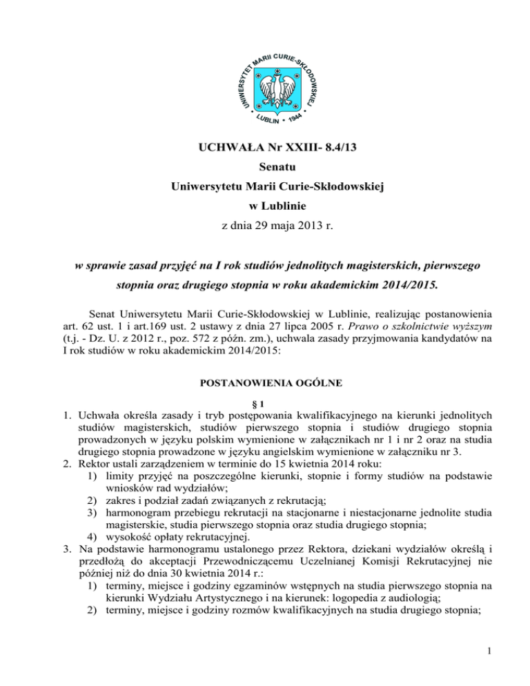 UCHWAŁA Nr XXIII- 8.4/13 Senatu Uniwersytetu Marii Curie-Skłodowskiej w Lublinie z dnia 29 maja 2013 r. w sprawie zasad przyjęć na I rok studiów jednolitych magisterskich, pierwszego stopnia oraz drugiego stopnia w roku akademickim 2014/2015. Senat Uniwersytetu Marii Curie-Skłodowskiej w Lublinie, realizując postanowienia art. 62 ust. 1 i art.169 ust. 2 ustawy z dnia 27 lipca 2005 r. Prawo o szkolnictwie wyŜszym (t.j. - Dz. U. z 2012 r., poz. 572 z późn. zm.), uchwala zasady przyjmowania kandydatów na I rok studiów w roku akademickim 2014/2015: POSTANOWIENIA OGÓLNE §1 1. Uchwała określa zasady i tryb postępowania kwalifikacyjnego na kierunki jednolitych studiów magisterskich, studiów pierwszego stopnia i studiów drugiego stopnia prowadzonych w języku polskim wymienione w załącznikach nr 1 i nr 2 oraz na studia drugiego stopnia prowadzone w języku angielskim wymienione w załączniku nr 3. 2. Rektor ustali zarządzeniem w terminie do 15 kwietnia 2014 roku: 1) limity przyjęć na poszczególne kierunki, stopnie i formy studiów na podstawie wniosków rad wydziałów; 2) zakres i podział zadań związanych z rekrutacją; 3) harmonogram przebiegu rekrutacji na stacjonarne i niestacjonarne jednolite studia magisterskie, studia pierwszego stopnia oraz studia drugiego stopnia; 4) wysokość opłaty rekrutacyjnej. 3. Na podstawie harmonogramu ustalonego przez Rektora, dziekani wydziałów określą i przedłoŜą do akceptacji Przewodniczącemu Uczelnianej Komisji Rekrutacyjnej nie później niŜ do dnia 30 kwietnia 2014 r.: 1) terminy, miejsce i godziny egzaminów wstępnych na studia pierwszego stopnia na kierunki Wydziału Artystycznego i na kierunek: logopedia z audiologią; 2) terminy, miejsce i godziny rozmów kwalifikacyjnych na studia drugiego stopnia; 1 3) miejsce i godziny przyjmowania dokumentów na jednolite studia magisterskie, studia pierwszego stopnia oraz studia drugiego stopnia. 4. Kierunek studiów moŜe być uruchomiony przy liczbie, co najmniej 25 przyjętych zakwalifikowanych na I rok studiów, o ile załącznik do niniejszej uchwały lub zarządzenie Rektora wydane na podstawie § 1 ust. 2 nie stanowi inaczej. Rektor, na wniosek Dziekana moŜe podjąć decyzję o uruchomieniu studiów przy liczbie kandydatów mniejszej niŜ 25. §2 1. O przyjęcie na jednolite studia magisterskie i studia pierwszego stopnia mogą ubiegać się kandydaci, którzy mają świadectwo dojrzałości, uzyskane w trybie egzaminu maturalnego - „nowa matura” lub egzaminu dojrzałości - „stara matura”. 2. O przyjęcie na studia drugiego stopnia mogą ubiegać się kandydaci, którzy mają tytuł magistra, licencjata, inŜyniera lub równorzędny. Pierwszeństwo w przyjęciu na studia drugiego stopnia przysługuje absolwentom Uniwersytetu Marii Curie-Skłodowskiej w Lublinie z oceną stanowiącą - zgodnie z zał. 2 - podstawę kwalifikacji nie niŜszą, niŜ 3,5. W przypadku, gdy podstawę kwalifikacji stanowią dwie lub więcej ocen, pierwszeństwo w przyjęciu na studia drugiego stopnia przysługuje absolwentom Uniwersytetu Marii Curie-Skłodowskiej w Lublinie, jeŜeli kaŜda z ocen jest nie niŜsza niŜ 3,5. W przypadku kwalifikowania kandydatów na podstawie złoŜonego kompletu dokumentów lub gdy wstęp na studia jest wolny, w pierwszym dniu przyjmowane będą dokumenty tylko od absolwentów UMCS. 3. Obywatele polscy, posiadający świadectwo ukończenia zagranicznej szkoły równorzędnej szkole ponadgimnazjalnej, mogą ubiegać się o przyjęcie na I rok studiów na zasadach ustalonych dla kandydatów z „nową maturą” pod warunkiem, Ŝe posiadane przez nich świadectwo jest równowaŜne z polskim świadectwem dojrzałości na podstawie umowy międzynarodowej. W innym przypadku - nostryfikacji świadectwa dokonuje, właściwy ze względu na miejsce zamieszkania kandydata, organ administracji oświatowej a w przypadku jego braku, właściwe ze względu na siedzibę instytucji, w której zamierza przedłoŜyć świadectwo. Zaświadczenie wydane przez właściwy organ administracji oświatowej waŜne jest łącznie z oryginałem lub zalegalizowanym duplikatem świadectwa uzyskanego za granicą. 4. Obywatele polscy, posiadający dyplom ukończenia zagranicznej szkoły wyŜszej mogą ubiegać się o przyjęcie na studia drugiego stopnia, zgodnie z art.191a ustawy Prawo o szkolnictwie wyŜszym. 5. Zasady podejmowania studiów przez osoby nie będące obywatelami polskimi określa załącznik nr 4 do niniejszej Uchwały. 6. Kandydaci posiadający dyplom matury międzynarodowej International Baccalaureate przyjmowani są na studia na takich samych zasadach, jak kandydaci z „nową maturą”. 7. Uprawnienia przysługujące laureatom oraz finalistom olimpiad stopnia centralnego przy ubieganiu się o przyjęcie na I rok studiów na Uniwersytecie Marii Curie-Skłodowskiej w Lublinie określa uchwała Senatu Nr XXII-40.7/12 z dnia 23 maja 2012 r. 8. Zgłoszenia kandydatów na studia przyjmowane są wyłącznie w trybie rejestracji internetowej, obsługiwanej przez system internetowej rejestracji kandydatów, zwanej IRK. 2 POSTĘPOWANIE KWALIFIKACYJNE §3 1. Warunkiem dopuszczenia kandydata do postępowania kwalifikacyjnego jest: 1) rejestracja i wybór kierunku studiów w systemie IRK oraz wprowadzenie do IRK swoich wyników ze świadectwa dojrzałości lub właściwej oceny ze studiów wyŜszych stanowiącej podstawę kwalifikowania (np. ocena na dyplomie, średnia ze studiów); 2) wniesienie opłaty rekrutacyjnej. 2. Postępowanie kwalifikacyjne ma charakter konkursowy i obejmuje: 1) wyniki procentowe uzyskane z pisemnego egzaminu maturalnego („nowa matura”) przeliczane na punkty rekrutacyjne w następujący sposób, o ile w załączniku nr 1 nie jest określone inaczej: a) 1% punktów na poziomie podstawowym = 1 punkt rekrutacyjny; b) 1% punktów na poziomie rozszerzonym = 2 punkty rekrutacyjne; c) kandydatom dysponującym wynikami zarówno z poziomu podstawow