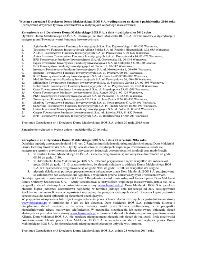 Wyciąg z zarządzeń Dyrektora Domu Maklerskiego BOŚ S.A. według stanu na dzień 4 października 2016 roku (zarządzenia dotyczące tytułów uczestnictwa w instytucjach wspólnego inwestowania) Zarządzenie nr 1 Dyrektora Domu Maklerskiego BOŚ S.A. z dnia 4 października 2016 roku Dyrektor Domu Maklerskiego BOŚ S.A. informuje, że Dom Maklerski BOŚ S.A. zawarł umowy o dystrybucję z następującymi Towarzystwami Funduszy Inwestycyjnych: 1. 2. 3. 4. 5. 6. 7. 8. 9. 10. 11. 12. 13. 14. 15. 16. 17. 18. 19. 20. 21. 22. AgioFunds Towarzystwo Funduszy Inwestycyjnych S.A. Plac Dąbrowskiego 1, 00-057 Warszawa, Towarzystwo Funduszy Inwestycyjnych Allianz Polska S.A. ul. Rodziny Hiszpańskich 1,02-685 Warszawa, ALTUS Towarzystwo Funduszy Inwestycyjnych S.A. ul. Pankiewicza 3, 00-696 Warszawa, Aviva Investors Towarzystwo Funduszy Inwestycyjnych S.A. ul. Domaniewska 44, 02-672 Warszawa, BPS Towarzystwo Funduszy Inwestycyjnych S.A. ul. Grzybowska 81, 00-844 Warszawa, Eques Investment Towarzystwo Funduszy Inwestycyjnych S.A. ul. Chłopska 53, 80-350 Gdańsk, ING Towarzystwo Funduszy Inwestycyjnych ul. Topiel 12, 00-342 Warszawa, Investors Towarzystwo Funduszy Inwestycyjnych S.A. ul. Mokotowska 1, 00-640 Warszawa, Ipopema Towarzystwo Funduszy Inwestycyjnych S.A. ul. Próżna 9, 00-107 Warszawa, KBC Towarzystwo Funduszy Inwestycyjnych S.A. ul. Chmielna 85/87 00- 805 Warszawa, MetLife Towarzystwo Funduszy Inwestycyjnych S.A. ul. Przemysłowa 26, 00-450 Warszawa, Millennium Towarzystwo Funduszy Inwestycyjnych S.A. ul. Stanisława Żaryna 2A, 02-593 Warszawa, Noble Funds Towarzystwo Funduszy Inwestycyjnych S.A. ul. Przyokopowa 33, 01-208 Warszawa, Open Towarzystwo Funduszy Inwestycyjnych S.A. ul. Przyokopowa 33, 01-208 Warszawa, Opera Towarzystwo Funduszy Inwestycyjnych S.A. Rondo ONZ 1, 00-124 Warszawa, PKO Towarzystwo Funduszy Inwestycyjnych S.A. ul. Puławska 15, 02-515 Warszawa, Towarzystwo Funduszy Inwestycyjnych PZU S.A. ul. Jana Pawła II 24, 00-133 Warszawa, Skarbiec Towarzystwo Funduszy Inwestycyjnych S.A. ul. Nowogrodzka 47A, 00-695 Warszawa, Superfund Towarzystwo Funduszy Inwestycyjnych S.A. Pl. Trzech Krzyży 18, 00-499 Warszawa, Union Investment Towarzystwo Funduszy Inwestycyjnych S.A. ul. Polna 11, 00-633 Warszawa. Caspar Towarzystwo Funduszy Inwestycyjnych S.A. ul. Szkolna 5/13, 61-832 Poznań. BPH Towarzystwo Funduszy Inwestycyjnych S.A., ul. Bonifraterska 17, 00-203 Warszawa Traci moc Zarządzenie nr 1 Dyrektora Domu Maklerskiego BOŚ S.A. z dnia 20 maja 2015 roku Zarządzenie wchodzi w życie z dniem 4 października 2016 roku. Zarządzenie nr 2 Dyrektora Domu Maklerskiego BOŚ S.A. z dnia 27 września 2016 roku Działając zgodnie z postanowieniami § 41 ust. 2 Regulaminu świadczenia usług maklerskich przez Dom Maklerski Banku Ochrony Środowiska S.A. – tytuły uczestnictwa w instytucjach wspólnego inwestowania, ustala się następujące terminy przyjmowania zleceń dotyczących jednostek uczestnictwa, ich anulacji oraz modyfikacji: 1. w Centrali Domu Maklerskiego BOŚ S.A., zlecenia przyjmowane są we wszystkie dni robocze od godz. 08:30 do godz.17:30, 2. w Oddziałach Domu Maklerskiego BOŚ S.A., zlecenia przyjmowane są we wszystkie dni robocze od godz. 08:30 do godz. 17:15, z zastrzeżeniem, że zlecenia składane w oddziale Domu Maklerskiego BOŚ S.A. w Częstochowie przyjmowane są od godz. 9:00 do godz. 17:00, we wszystkie dni sesyjne, 3. zlecenia składane za pomocą oprogramowania wskazanego przez Dom Maklerski BOŚ S.A. przyjmowane są całodobowo we wszystkie dni tygodnia, z wyjątkiem przerw konserwacyjnych i rozliczeniowych. Działając zgodnie z postanowieniami § 41 ust. 2 Regulaminu świadczenia usług maklerskich przez Dom Maklerski Banku Ochrony Środowiska S.A. – tytuły uczestnictwa w instytucjach wspólnego inwestowania, ustala się, że w przypadku zleceń złożonych za pośrednictwem strony www.bossabank.pl Dom Maklerski BOŚ S.A. przekaże zlecenia kupna jednostek uczestnictwa najpóźniej w terminie jednego dnia roboczego od daty zaksięgowania środków na rachunku Klienta w wysokości niezbędnej do pokrycia złożonych zleceń. Zlecenia kupna jednostek uczestnictwa do czasu opłacenia są zleceniami oczekującymi. W przypadku nieopłacenia lub częściowego opłacenia przez Klienta zleceń złożonych za pośrednictwem strony www.bossabank.pl w terminie do 4 dni od ich złożenia, Dom Maklerski BOŚ S.A. poinformuje Klienta o nieopłaceniu zleceń mailowo, o ile adres mailowy został przez Klienta zdefiniowany, a w przypadku niezdefiniowania adresu mailowego telefonicznie. W przypadku nieopłacenia lub częściowego opłacenia zleceń złożonych za pośrednictwem strony www.bossabank.pl w terminie 7 dni od ich złożenia, pomimo poinformowania Klienta, Dom Maklerski BOŚ S.A. nie przekaże nieopłaconego zlecenia lub zleceń do realizacji. Brak możliwości poinformowania klienta przez Dom Maklerski BOŚ S.A. o nieopłaceniu zleceń nie wyłącza prawa Domu Maklerskiego BOŚ S.A. do nieprzekazania nieopłaconych zleceń po upływie ww. terminu. Traci moc Zarządzenie nr 3 Dyrektora Domu Maklerskiego BOŚ S.A. z dnia 25 września 2014 roku Zarządzenie wchodzi w życie z dniem 03 października 2016 roku. Zarządzenie nr 1 Dyrektora Domu Maklerskiego BOŚ S.A. z dnia 22 września 2016 roku 1. Z dniem 23 września 2016 roku wprowadza się nową „Instrukcję obsługi serwera zleceń Stock OnLine” (dalej „Instrukcja”). 2. Aktualna wersja Instrukcji, obowiązująca od 23 września 2016 roku dostępna jest na stronie internetowej Domu Maklerskiego BOŚ S.A. http://bossa.pl/oferta/dokumenty/. Zarządzenie wchodzi w życie z dniem 23 września 2016 roku. Zarządzenie nr 3 Dyrektora Domu Maklerskiego BOŚ S.A. z dnia 24 marca 2016 roku Działając zgodnie z postanowieniami § 39 ust. 1 Regulaminu świadczenia usług maklerskich przez Dom Maklerski Banku Ochrony Środowiska S.A. – tytuły uczestnictwa w instytucjach wspólnego inwestowania, usta
