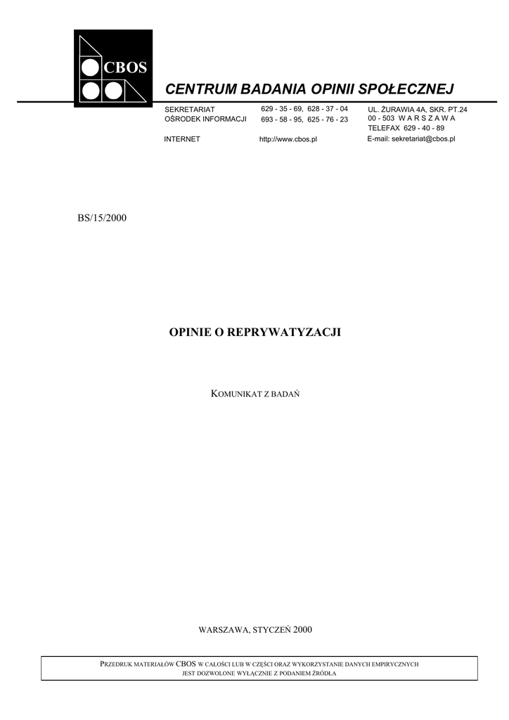 CBOS CENTRUM BADANIA OPINII SPOŁECZNEJ SEKRETARIAT OŚRODEK INFORMACJI 629 - 35 - 69, 628 - 37 - 04 693 - 58 - 95, 625 - 76 - 23 INTERNET http://www.cbos.pl UL. ŻURAWIA 4A, SKR. PT.24 00 - 503 W A R S Z A W A TELEFAX 629 - 40 - 89 E-mail: [email protected] BS/15/2000 OPINIE O REPRYWATYZACJI KOMUNIKAT Z BADAŃ WARSZAWA, STYCZEŃ 2000 PRZEDRUK MATERIAŁÓW CBOS W CAŁOŚCI LUB W CZĘŚCI ORAZ WYKORZYSTANIE DANYCH EMPIRYCZNYCH JEST DOZWOLONE WYŁĄCZNIE Z PODANIEM ŹRÓDŁA CBOS OPINIE O REPRYWATYZACJI STOSUNEK DO REPRYWATYZACJI 40% Zwolennicy 47% 40% Przeciwnicy Trudno powiedzieć 39% 20% 14% IX 1999 I 2000 !"Blisko trzy piąte badanych (56%) opowiada się za zwrotem mienia tylko obywatelom polskim mieszkającym obecnie na stałe w Polsce. Dalsze 7% jest zdania, że reprywatyzacja powinna objąć wszystkich obywateli polskich niezależnie od kraju ich zamieszkania. Za zwrotem mienia wszystkim byłym właścicielom, bez względu na ich narodowość i obecne obywatelstwo, opowiada się 15% ankietowanych, a nieliczni (4%) uważają za słuszne ograniczenie reprywatyzacji do osób narodowości polskiej bez względu na obecne obywatelstwo, postulują więc przyjęcie kryterium narodowego, trudnego, jeśli nie niemożliwego, do zastosowania w praktyce. Niemal co piąty badany (18%) nie ma sprecyzowanej opinii na temat tego, komu należy się zwrot zagrabionego mienia. Badanie „Aktualne problemy i wydarzenia” (116), 13-18 stycznia 2000, reprezentatywna próba losowo-adresowa dorosłej ludności Polski (N=1075). W Polsce jeszcze nie przeprowadzono reprywatyzacji, a debata nad rządowym projektem ustawy budzi coraz więcej emocji i niezadowolenia wśród byłych właścicieli, którzy zawartą w ustawie koncepcję reprywatyzacji uważają za niesprawiedliwą i krzywdzącą. Propozycja rządowej poprawki do ustawy reprywatyzacyjnej, wykluczająca z restytucji mienia osoby nie będące obecnie obywatelami RP i nie mieszkające w Polsce, przeniosła dyskusję nad tą ustawą poza granice kraju. Niedawno Komisja Kongresu USA ds. Bezpieczeństwa i Współpracy w Europie wystosowała do polskiego rządu list krytykujący tę poprawkę projektu ustawy. W styczniowym sondażu1 po raz kolejny pytaliśmy Polaków o ich stosunek do reprywatyzacji oraz postulowanego sposobu realizacji tej idei. STOSUNEK DO REPRYWATYZACJI Największe poparcie dla reprywatyzacji odnotowaliśmy na początku transformacji ustrojowej. W miarę upływu czasu i - jak się wydaje - w zależności od akcentowania problemów poruszanych w publicznej dyskusji odsetek osób popierających reprywatyzację wahał się od 41% do 53%, jednocześnie zaś znacząca grupa (do 21%) nie zajmowała stanowiska w tej sprawie. W porównaniu z wrześniem ’99 wzrosło (o 7 punktów) poparcie dla reprywatyzacji. Za zwrotem własności dawnym właścicielom opowiada się obecnie prawie połowa (47%) ankietowanych, niemal dwie piąte zaś (39%) jest temu przeciwnych. Co siódmy respondent (14%, spadek o 6 punktów) nie ma wyrobionej opinii na ten temat. 1 Badanie „Aktualne problemy i wydarzenia” (116) przeprowadzono w dniach 13-18 stycznia 2000 na 1075-osobowej reprezentatywnej próbie losowo-adresowej dorosłej ludności Polski. -2Tabela 1 Stosunek do reprywatyzacji Wskazania respondentów według terminów badań III 1991 XI 1992 V 1995 V 1997 XII 1997 IV 1999 IX 1999 I 2000 w procentach Zwolennicy 65 53 45 41 52 44 40 47 Przeciwnicy 28 41 38 38 28 37 40 39 Trudno powiedzieć 7 6 17 21 20 19 20 14 Stosunek do reprywatyzacji związany jest z poglądami politycznymi badanych i ich sympatiami partyjnymi. Opinie respondentów identyfikujących się z lewicą są podzielone: 42% opowiada się za zwrotem własności dawnym właścicielom, a 49% wyraża sprzeciw. Natomiast wśród osób deklarujących przekonania prawicowe zwolennicy reprywatyzacji (58%) dwukrotnie przeważają nad jej przeciwnikami (28%). Odpowiedzi osób o poglądach centrowych zbliżone są do opinii ogółu Polaków (48% za i 38% przeciw). Tabela 2 Stosunek do reprywatyzacji Potencjalne elektoraty partii i ugrupowań politycznych zwolennicy przeciwnicy Trudno powiedzieć w procentach UW 65 17 18 AWS 55 33 12 PSL 16 67 17 SLD 41 50 9 Niezdecydowani 52 28 20 Niezamierzający głosować 47 37 15 Spośród elektoratów partyjnych reprywatyzację popierają przede wszystkim sympatycy obu ugrupowań tworzących koalicję rządową AWS-UW. Wśród potencjalnych wyborców partii opozycyjnych dominuje sprzeciw wobec idei reprywatyzacji, a największymi jej przeciwnikami są sympatycy PSL. Można powiedzieć, że stosunek elektoratu tej partii do reprywatyzacji jest lustrzanym odbiciem stosunku wyborców UW do zwrotu mienia byłym właścicielom. -3KOMU ZWRACAĆ? Prawie trzy piąte (56%) ogółu ankietowanych - zarówno zwolenników, jak i przeciwników reprywatyzacji - uważa, iż w przypadku jej przeprowadzenia restytucja mienia powinna objąć tylko obywateli polskich mieszkających obecnie na stałe w Polsce. Dalsze 7% jest zdania, że prawo do odzyskania mienia powinni mieć wszyscy obywatele polscy niezależnie od kraju ich zamieszkania. Ogółem więc niemal dwie trzecie badanych (63%) uważa, że reprywatyzacja powinna dotyczyć tylko tych, którzy obecnie mają polskie obywatelstwo. CBOS Czy, Pana(i) zdaniem, reprywatyzacja powinna przewidywać zwrot mienia: - wszystkim byłym właścicielom, bez względu na ich narodowość i aktualne obywatelstwo 15% - tylko Polakom, nawet jeśli obecnie są obywatelami innych państw 4% - tylko obywatelom polskim niezależnie od tego, w jakim kraju mieszkają 7% - tylko obywatelom Polski mieszkającym obecnie na stałe w Polsce Trudno powiedzieć 56% 18% Opinia, że reprywatyzacja powinna objąć tylko obywateli Polski obecnie na stałe zamieszkałych w Polsce, przeważa we wszystkich grupach społeczno-zawodowych, demograficznych oraz wśród osób deklarujących odmienne orientacje polityczne i różne sympatie partyjne. Postawą liberalną 