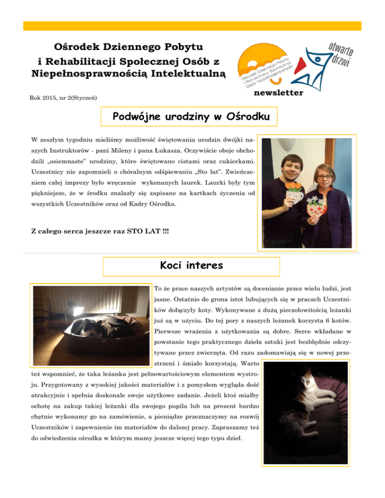Ośrodek Dziennego Pobytu i Rehabilitacji Społecznej Osób z Niepełnosprawnością Intelektualną newsletter Rok 2015, nr 2(Styczeń) Podwójne urodziny w Ośrodku W zeszłym tygodniu mieliśmy możliwość świętowania urodzin dwójki naszych Instruktorów - pani Mileny i pana Łukasza. Oczywiście oboje obchodzili „osiemnaste” urodziny, które świętowano cistami oraz cukierkami. Uczestnicy nie zapomnieli o chóralnym odśpiewaniu „Sto lat”. Zwieńczeniem całej imprezy było wręczenie wykonanych laurek. Laurki były tym piękniejsze, że w środku znalazły się zapisane na kartkach życzenia od wszystkich Uczestników oraz od Kadry Ośrodka. Z całego serca jeszcze raz STO LAT !!! Koci interes To że prace naszych artystów są docenianie przez wielu ludzi, jest jasne. Ostatnio do grona istot lubujących się w pracach Uczestników dołączyły koty. Wykonywane z dużą pieczołowitością leżanki już są w użyciu. Do tej pory z naszych leżanek korzysta 6 kotów. Pierwsze wrażenia z użytkowania są dobre. Serce wkładane w powstanie tego praktycznego dzieła sztuki jest bezbłędnie odczytywane przez zwierzęta. Od razu zadomawiają się w nowej przestrzeni i śmiało korzystają. Warto też wspomnieć, że taka leżanka jest pełnowartościowym elementem wystroju. Przygotowany z wysokiej jakości materiałów i z pomysłem wygląda dość atrakcyjnie i spełnia doskonale swoje użytkowe zadanie. Jeżeli ktoś miałby ochotę na zakup takiej leżanki dla swojego pupila lub na prezent bardzo chętnie wykonamy go na zamówienie, a pieniądze przeznaczymy na rozwój Uczestników i zapewnienie im materiałów do dalszej pracy. Zapraszamy też do odwiedzenia ośrodka w którym mamy jeszcze więcej tego typu dzieł. Wolontariat kwitnie — Helen wolontariuszka z Niemiec Niedawno mogliśmy gościć wolontariuszkę z Francji panią Lea Fürst, nie spodziewaliśmy się że za nieco ponad miesiąc do naszego Ośrodka przybędzie osoba z Niemiec. Helen Schmid jest 22 letnią wolontariuszką, która przez ostatnie 4 lata pracowała w ośrodku opieki stałej nad osobami niepełnosprawnymi w Niemczech. Uczyła się na kierunku pielęgniarskim na specjalności opiekuńczej. Bogate doświadczenie miała już okazje testować w trzech placówkach Stowarzyszenia Otwarte Drzwi. Jak sama mówi praca z ludźmi jest jej pasją, której poświęca dużo czasu. Innymi pasjami Helen są podróże i książki. Do Polski przyjechała prosto z dwumiesięcznej podróży po Hiszpanii i Portugali. W czasie swojej prezentacji opowiadała nam o swoich rodzinnych stronach jak i o podróżach. Dzięki fantastycznym opowieścią poczuliśmy niemal ciepło panujące na półwyspie iberyjskim. Po skończeniu pobytu w naszych ośrodka zaplanowała, że wraz z przyjaciółmi wyruszy zwiedzać Polskę. Serdecznie dziękujemy za wszystko i liczymy, że jeszcze kiedyś będziemy mieli możliwość spotkać się ponownie. Rosół jak u Mamy! Nasza pracownia kulinarna zawsze nas zaskakuje robiąc „coś z niczego”, ale dziś możemy powiedzieć, że stanęła na głowie, aby zadowolić pozostałych Uczestników. Daniem dnia był rosół, który każdy z czystym sercem mógł nazwać „rosołem mamy”, tudzież „babci” jeżeli talent kulinarny ominął jedno pokolenie. Dowodem na smak rosołu niech będzie to, że z wielkiego garnka (szacujemy że około 10 litrów) zostało nie więcej jak litr pożywnego bulionu. Pracownia kulinarna nie zawsze ma możliwość ugotowania czegoś dla wszystkich, ale tym razem postarała się o to, aby każdy z nas oczekiwał powtórki w najbliższym czasie. Tel.: 22 823 65 61 Ul. Białobrzeska 11, 02-379 Warszawa E-mail: [email protected] www.bialobrzeska.otwartedrzwi.pl Ośrodek finansowany przez: Dyżur pani Kierownik: Nasz Ośrodek 00 Wtorek 14 -16 00 Czwartek 1400-1600 tel.: (22) 823-65-61 e-mail: [email protected] kom.: 503-124-497 Marta Skrobacka - kierownik Agata Sobczak - psycholog Marta Chrzanowska - instruktor pracowni gospodarstwa domowego Milena Jaworska - instruktor pracowni plastycznej Sylwia Szostak-Błaszczak - instruktor pracowni rękodzielniczej Łukasz Ołówek - instruktor pracowni komputerowej Jakub Grotowski - asystent osoby niepełnosprawnej Pamiętajmy o wsparciu Organizacji Pożytku Publicznego! Każda przekazana kwota przyczyni się do aktywnego działania na rzecz osób wykluczonych. Bank Pekao SA 77 1240 6074 1111 0010 3072 2313