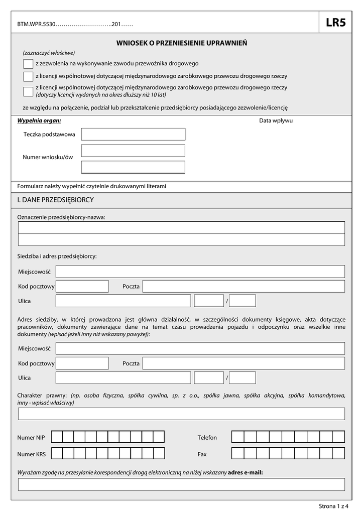 LR5 BTM.WPR.5530……………………….201…… WNIOSEK O PRZENIESIENIE UPRAWNIEŃ (zaznaczyć właściwe) z zezwolenia na wykonywanie zawodu przewoźnika drogowego z licencji wspólnotowej dotyczącej międzynarodowego zarobkowego przewozu drogowego rzeczy z licencji wspólnotowej dotyczącej międzynarodowego zarobkowego przewozu drogowego rzeczy (dotyczy licencji wydanych na okres dłuższy niż 10 lat) ze względu na połączenie, podział lub przekształcenie przedsiębiorcy posiadającego zezwolenie/licencję Wypełnia organ: Data wpływu Teczka podstawowa Numer wniosku/ów Formularz należy wypełnić czytelnie drukowanymi literami I. DANE PRZEDSIĘBIORCY Oznaczenie przedsiębiorcy-nazwa: Siedziba i adres przedsiębiorcy: Miejscowość Kod pocztowy Poczta / Ulica Adres siedziby, w której prowadzona jest główna działalność, w szczególności dokumenty księgowe, akta dotyczące pracowników, dokumenty zawierające dane na temat czasu prowadzenia pojazdu i odpoczynku oraz wszelkie inne dokumenty (wpisać jeżeli inny niż wskazany powyżej): Miejscowość Kod pocztowy Poczta / Ulica Charakter prawny: (np. osoba fizyczna, spółka cywilna, sp. z o.o., spółka jawna, spółka akcyjna, spółka komandytowa, inny - wpisać właściwy) Numer NIP Telefon Numer KRS Fax Wyrażam zgodę na przesyłanie korespondencji drogą elektroniczną na niżej wskazany adres e-mail: Strona 1 z 4 II. TERMIN/LICZBA POJAZDÓW I WYPISÓW Wnioskuję o przeniesienie uprawnień wynikających z licencji wspólnotowej dotyczącej międzynarodowego zarobkowego przewozu drogowego rzeczy (wpisać odpowiednio: 5 lub 10 lat – w przypadku przeniesienia uprawnień z licencji wydanej na okres powyżej 10 lat, w przypadku licencji 5 lub 10 – letnich zachowywany jest ich okres ważności) na okres Do wykonywania transportu drogowego będą wykorzystywane: pojazdy/ów (wpisać liczbę pojazdów) wypisy/ów (wpisać liczbę wnioskowanych wypisów) III. ZARZĄDZAJĄCY TRANSPORTEM Imię Nazwisko Adres zamieszkania: Miejscowość Kod pocztowy Poczta / Ulica Numer Certyfikatu Kompetencji Zawodowych IV. ZAŁĄCZNIKI Aktualny odpis z Krajowego Rejestru Sądowego (KRS) Oświadczenie osoby zarządzającej transportem (druk OC – oświadczenie-zarządzający) Kopię certyfikatu kompetencji zawodowych Dokumenty potwierdzające posiadanie odpowiedniej zdolności finansowej (zgodnie z art. 7 rozporządzenia (WE) nr 1071/2009): roczne sprawozdanie finansowe gwarancja bankowa ubezpieczenie w tym ubezpieczenie odpowiedzialności zawodowej Oświadczenie dotyczące bazy eksploatacyjnej (druk OB – oświadczenie - baza) Oświadczenie dotyczące kierowców (druk OK – oświadczenie - kierowcy) Informacja z Krajowego Rejestru Karnego lub oświadczenie o niekaralności (druk ON – oświadczenie - niekaralność) przedsiębiorcy i osoby zarządzającej transportem Druk WPC – wykaz pojazdów - ciężarowy Wniosek o udzielenie zezwolenia na wykonywanie zawodu przewoźnika drogowego Dowód uiszczenia opłaty za wydanie zezwolenia, licencji, wypisu(ów) z licencji wspólnotowej W przypadku gdy zezwolenie wydał inny organ niż GITD: Dowód uiszczenia opłaty za wydanie licencji wspólnotowej i wypisu(ów) z licencji wspólnotowej Kopię zezwolenia na wykonywanie zawodu przewoźnika drogowego (licencji krajowej) Zaświadczenie wystawione przez organ, który wydał zezwolenie na wykonywanie zawodu przewoźnika drogowego, o liczbie pojazdów, dla których został udokumentowany wymóg zdolności finansowej, zgodnie z art. 7 rozporządzenia (WE) 1071/2009 Strona 2 z 4 V. FORMA ODBIORU DOKUMENTÓW (zaznaczyć właściwe) Osobiście Przesyłka kurierska – na koszt przedsiębiorcy wskazaną firmą kurierską (domyślnie GLS) Administratorem danych osobowych podanych na wniosku jest Główny Inspektor Transportu Drogowego, z siedzibą przy ul. Postępu 21, 02-676 Warszawa. Zebrane dane osobowe będą przetwarzane zgodnie z ustawą z dnia 29 sierpnia 1997 r. o ochronie danych osobowych (Dz. U. 2002 r. nr 101, poz. 926 ze zm.) w celu wydania zezwolenia/licencji/wypisów z licencji, zgodnie ze składanym_wnioskiem. Każdej osobie przysługuje prawo dostępu do treści swoich danych i ich poprawiania. Podanie danych jest obowiązkowe i wynika z Rozporządzenia Parlamentu Europejskiego i Rady (WE) nr 1071/2009 z dnia 21 października 2009 r. ustanawiającego wspólne zasady dotyczące warunków wykonywania zawodu przewoźnika drogowego i uchylające dyrektywę rady 96/26/WE, Rozporządzenia Parlamentu Europejskiego i Rady (WE) nr 1072/2009 z dnia 21 października 2009 r. dotyczącego wspólnych zasad dostępu do rynku międzynarodowych przewozów drogowych oraz ustawy z dnia 6 września 2001 r. o transporcie drogowym (Dz. U. z 2013r. poz.1414 z późn. zm). ............................................................ Data .................................................................................................. Czytelny podpis przedsiębiorcy* Wypełnia organ: .................................................................................................................................................................................................................................................................... Data i podpis pracownika rozpatrującego wniosek .................................................................................................................................................................................................................................................................... Data i podpis pracownika rozpatrującego wniosek VI. INFORMACJE Opłata za przeniesienie uprawnień wynikających z zezwolenia na wykonywanie zawodu przewoźnika drogowego wynosi 50 zł. Opłata za udzielenie zezwolenia na wykonywanie zawodu przewoźnika drogowego wynosi 1000 zł. Opłata za przeniesienie uprawnień wynikających z licencji dotyczącej międzynarodowego zarobkowego przewozu drogowego rzeczy na okr