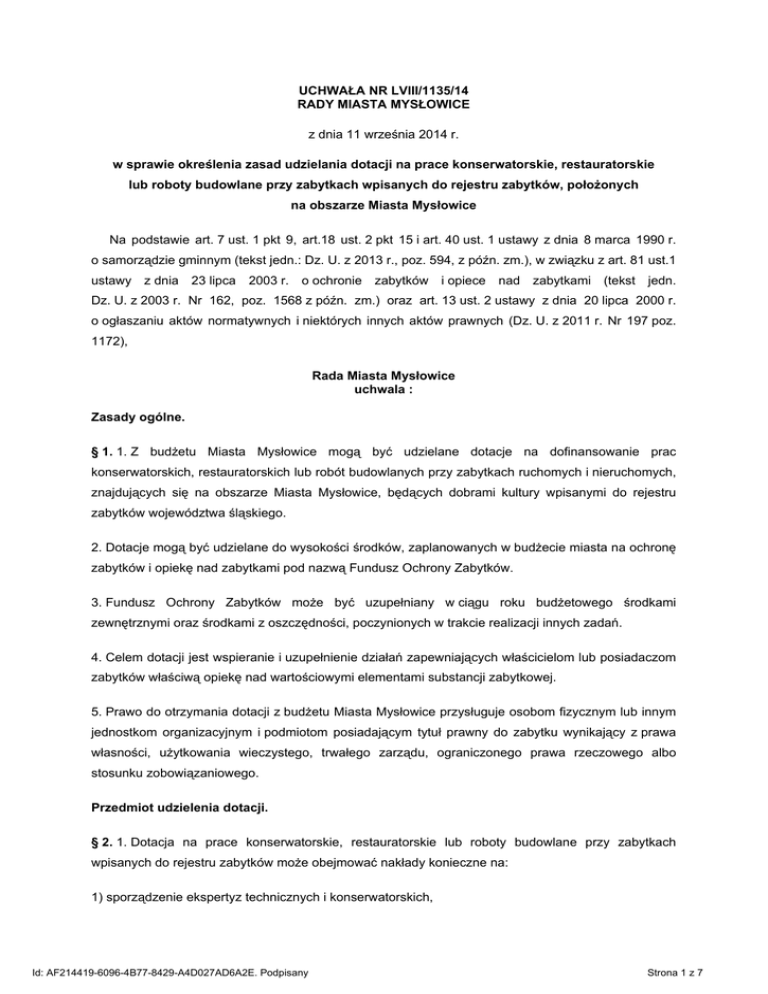UCHWAŁA NR LVIII/1135/14 RADY MIASTA MYSŁOWICE z dnia 11 września 2014 r. w sprawie określenia zasad udzielania dotacji na prace konserwatorskie, restauratorskie lub roboty budowlane przy zabytkach wpisanych do rejestru zabytków, położonych na obszarze Miasta Mysłowice Na podstawie art. 7 ust. 1 pkt 9, art.18 ust. 2 pkt 15 i art. 40 ust. 1 ustawy z dnia 8 marca 1990 r. o samorządzie gminnym (tekst jedn.: Dz. U. z 2013 r., poz. 594, z późn. zm.), w związku z art. 81 ust.1 ustawy z dnia 23 lipca 2003 r. o ochronie zabytków i opiece nad zabytkami (tekst jedn. Dz. U. z 2003 r. Nr 162, poz. 1568 z późn. zm.) oraz art. 13 ust. 2 ustawy z dnia 20 lipca 2000 r. o ogłaszaniu aktów normatywnych i niektórych innych aktów prawnych (Dz. U. z 2011 r. Nr 197 poz. 1172), Rada Miasta Mysłowice uchwala : Zasady ogólne. § 1. 1. Z budżetu Miasta Mysłowice mogą być udzielane dotacje na dofinansowanie prac konserwatorskich, restauratorskich lub robót budowlanych przy zabytkach ruchomych i nieruchomych, znajdujących się na obszarze Miasta Mysłowice, będących dobrami kultury wpisanymi do rejestru zabytków województwa śląskiego. 2. Dotacje mogą być udzielane do wysokości środków, zaplanowanych w budżecie miasta na ochronę zabytków i opiekę nad zabytkami pod nazwą Fundusz Ochrony Zabytków. 3. Fundusz Ochrony Zabytków może być uzupełniany w ciągu roku budżetowego środkami zewnętrznymi oraz środkami z oszczędności, poczynionych w trakcie realizacji innych zadań. 4. Celem dotacji jest wspieranie i uzupełnienie działań zapewniających właścicielom lub posiadaczom zabytków właściwą opiekę nad wartościowymi elementami substancji zabytkowej. 5. Prawo do otrzymania dotacji z budżetu Miasta Mysłowice przysługuje osobom fizycznym lub innym jednostkom organizacyjnym i podmiotom posiadającym tytuł prawny do zabytku wynikający z prawa własności, użytkowania wieczystego, trwałego zarządu, ograniczonego prawa rzeczowego albo stosunku zobowiązaniowego. Przedmiot udzielenia dotacji. § 2. 1. Dotacja na prace konserwatorskie, restauratorskie lub roboty budowlane przy zabytkach wpisanych do rejestru zabytków może obejmować nakłady konieczne na: 1) sporządzenie ekspertyz technicznych i konserwatorskich, Id: AF214419-6096-4B77-8429-A4D027AD6A2E. Podpisany Strona 1 z 7 2) przeprowadzenie badań konserwatorskich lub architektonicznych, 3) wykonanie dokumentacji konserwatorskiej, 4) opracowanie programu prac konserwatorskich i restauratorskich, 5) wykonanie projektu budowlanego zgodnie z przepisami Prawa budowlanego, 6) sporządzenie projektu odtworzenia kompozycji wnętrz, 7) zabezpieczenie, zachowanie i utrwalenie substancji zabytku, 8) stabilizację konstrukcyjną części składowych zabytku lub ich odtworzenie w zakresie niezbędnym dla zachowania tego zabytku, 9) odnowienie lub uzupełnienie tynków i okładzin architektonicznych elewacji, albo ich całkowite odtworzenie, z uwzględnieniem charakterystycznej dla tego zabytku kolorystyki, 10) odtworzenie zniszczonej przynależności zabytku, jeżeli odtworzenie to nie przekracza 50% oryginalnej substancji tej przynależności, 11) odnowienie lub całkowite odtworzenie okien, w tym ościeżnic i okiennic, zewnętrznych odrzwi i drzwi, więźby dachowej, pokrycia dachowego, rynien i rur spustowych, 12) modernizację instalacji elektrycznej w zabytkach drewnianych lub zabytkach, które posiadają oryginalne, wykonane z drewna części składowe i przynależności, 13) wykonanie izolacji przeciwwilgociowej, 14) uzupełnianie narysów ziemnych dzieł architektury obronnej oraz zabytków archeologicznych nieruchomych o własnych formach krajobrazowych, 15) działania zmierzające do wyeksponowania istniejących, oryginalnych elementów zabytkowego układu parku lub ogrodu, 16) zakup materiałów konserwatorskich i budowlanych, niezbędnych do wykonania prac i robót przy zabytku wpisanym do rejestru, o których mowa w pkt. 7 – 15, 17) zakup i montaż instalacji przeciwwłamaniowej oraz przeciwpożarowej i odgromowej. 2. Dotacja z budżetu Miasta Mysłowice może być udzielona w wysokości do 50% nakładów koniecznych, o których mowa w § 2 ust. 1, na wykonanie prac konserwatorskich, restauratorskich lub robót budowlanych przy zabytku wpisanym do rejestru zabytków, ustalonych na podstawie kosztorysu inwestorskiego. Id: AF214419-6096-4B77-8429-A4D027AD6A2E. Podpisany Strona 2 z 7 3. Jeżeli zabytek posiada wyjątkową wartość historyczną, artystyczną lub naukową albo wymaga przeprowadzenia złożonych pod względem technologicznym prac konserwatorskich, restauratorskich lub robót budowlanych, dotacja z budżetu Miasta Mysłowice może być udzielona w wysokości do 100% nakładów koniecznych na wykonanie tych prac lub robót, o których mowa w § 2 ust. 1. 4. Łączna wysokość dotacji udzielonych z budżetu Miasta Mysłowice oraz z innych źródeł sektora finansów publicznych nie może przekraczać 100% nakładów koniecznych na wykonanie przez Wnioskodawcę zadania. 5. Dotacja na prace konserwatorskie, restauratorskie lub roboty budowlane przy zabytkach wpisanych do rejestru zabytków w przypadku Wnioskodawcy prowadzącego działalność gospodarczą, bez względu na formę organizacyjno – prawną, stanowi pomoc de minimis, której udzielenie następuje zgodnie z rozporządzeniem Komisji (UE) nr 1407/2013 z dnia 18 grudnia 2013 r. w sprawie stosowania art. 107 i 108 Traktatu o funkcjonowaniu Unii Europejskiej do pomocy de minimis (Dz. Urz. UE L Nr 352 z 24 grudnia 2013 r.). Tryb postępowania o udzielenie dotacji. § 3. 1. W celu zapewnienia jawności gospodarowania środkami publicznymi, Prezydent Miasta Mysłowice informował będzie w formie zawiadomień na tablicy ogłoszeń oraz stronie internetowej Miasta Mysłowice o fakcie przyjmowania wniosków, terminach ich składania, jak również o przyznanych kwotach dotacji. 2. Podmioty ubiegające się o uzyskanie dotacji na prace lu