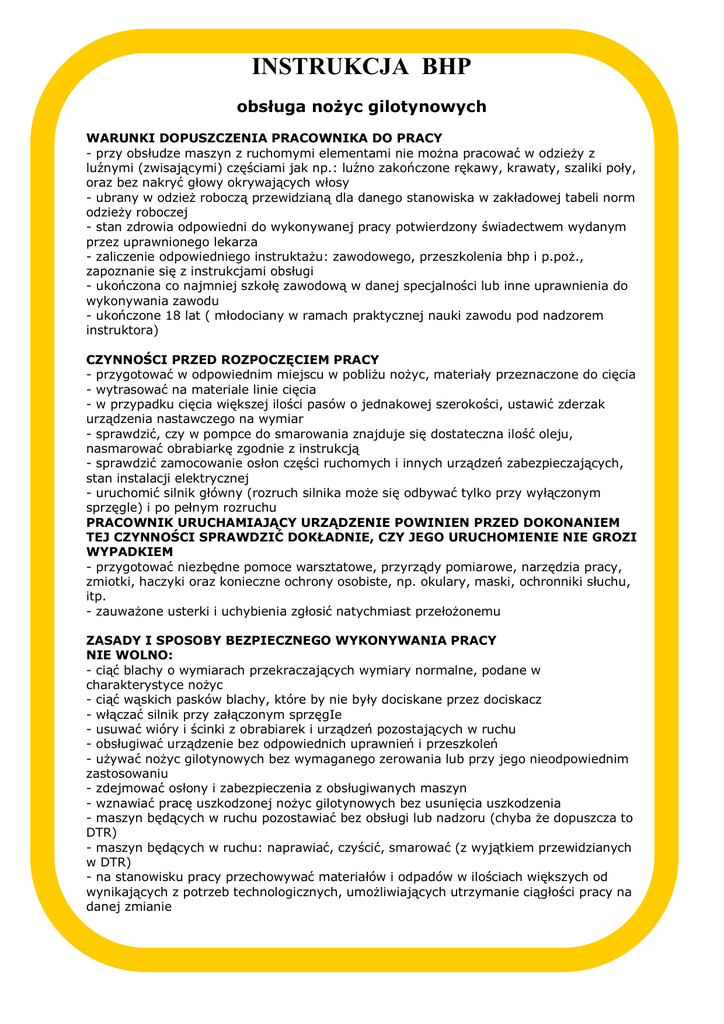 INSTRUKCJA BHP obsługa nożyc gilotynowych WARUNKI DOPUSZCZENIA PRACOWNIKA DO PRACY - przy obsłudze maszyn z ruchomymi elementami nie można pracować w odzieży z luźnymi (zwisającymi) częściami jak np.: luźno zakończone rękawy, krawaty, szaliki poły, oraz bez nakryć głowy okrywających włosy - ubrany w odzież roboczą przewidzianą dla danego stanowiska w zakładowej tabeli norm odzieży roboczej - stan zdrowia odpowiedni do wykonywanej pracy potwierdzony świadectwem wydanym przez uprawnionego lekarza - zaliczenie odpowiedniego instruktażu: zawodowego, przeszkolenia bhp i p.poż., zapoznanie się z instrukcjami obsługi - ukończona co najmniej szkołę zawodową w danej specjalności lub inne uprawnienia do wykonywania zawodu - ukończone 18 lat ( młodociany w ramach praktycznej nauki zawodu pod nadzorem instruktora) CZYNNOŚCI PRZED ROZPOCZĘCIEM PRACY - przygotować w odpowiednim miejscu w pobliżu nożyc, materiały przeznaczone do cięcia - wytrasować na materiale linie cięcia - w przypadku cięcia większej ilości pasów o jednakowej szerokości, ustawić zderzak urządzenia nastawczego na wymiar - sprawdzić, czy w pompce do smarowania znajduje się dostateczna ilość oleju, nasmarować obrabiarkę zgodnie z instrukcją - sprawdzić zamocowanie osłon części ruchomych i innych urządzeń zabezpieczających, stan instalacji elektrycznej - uruchomić silnik główny (rozruch silnika może się odbywać tylko przy wyłączonym sprzęgle) i po pełnym rozruchu PRACOWNIK URUCHAMIAJĄCY URZĄDZENIE POWINIEN PRZED DOKONANIEM TEJ CZYNNOŚCI SPRAWDZIĆ DOKŁADNIE, CZY JEGO URUCHOMIENIE NIE GROZI WYPADKIEM - przygotować niezbędne pomoce warsztatowe, przyrządy pomiarowe, narzędzia pracy, zmiotki, haczyki oraz konieczne ochrony osobiste, np. okulary, maski, ochronniki słuchu, itp. - zauważone usterki i uchybienia zgłosić natychmiast przełożonemu ZASADY I SPOSOBY BEZPIECZNEGO WYKONYWANIA PRACY NIE WOLNO: - ciąć blachy o wymiarach przekraczających wymiary normalne, podane w charakterystyce nożyc - ciąć wąskich pasków blachy, które by nie były dociskane przez dociskacz - włączać silnik przy załączonym sprzęgIe - usuwać wióry i ścinki z obrabiarek i urządzeń pozostających w ruchu - obsługiwać urządzenie bez odpowiednich uprawnień i przeszkoleń - używać nożyc gilotynowych bez wymaganego zerowania lub przy jego nieodpowiednim zastosowaniu - zdejmować osłony i zabezpieczenia z obsługiwanych maszyn - wznawiać pracę uszkodzonej nożyc gilotynowych bez usunięcia uszkodzenia - maszyn będących w ruchu pozostawiać bez obsługi lub nadzoru (chyba że dopuszcza to DTR) - maszyn będących w ruchu: naprawiać, czyścić, smarować (z wyjątkiem przewidzianych w DTR) - na stanowisku pracy przechowywać materiałów i odpadów w ilościach większych od wynikających z potrzeb technologicznych, umożliwiających utrzymanie ciągłości pracy na danej zmianie NAKAZUJE SIĘ: - przesuwać blachę przy operacji cięcia, gdy nóż jest w górnym położeniu - sprawdzić, przed uruchomieniem czy nikogo nie ma w pobliżu ruchomych części. - używać rękawice robocze - zachowywać prawidłową pozycję ciała przy wykonywaniu pracy - podczas wykonywania pracy zwracać uwagę tylko na wykonywane czynności, uwzględniając warunki bezpiecznej pracy dla siebie i otoczenia - przy obróbce materiału o znacznej długości stosować odpowiednie podstawki - utrzymywać posadzkę w czystości i suchą - utrzymywać w porządku miejsce pracy, nie rozrzucać narzędzi i przedmiotów przeznaczonych do obróbki lub obrobionych - napinać, naprawiać łączyć, skracać i smarowane pasy pędne, liny i taśmy pędne po unieruchomieniu nożyc gilotynowych - przyłączać nożyc gilotynowych do źródła energii tak, aby nie stanowiło zagrożenia dla obsługi - sukcesywnie usuwać odpady CZYNNOŚCI PO ZAKOŃCZENIU PRACY - wyłączyć nożyce gilotynowe wyłącznikiem (głównym) - oczyścić stół z pozostałych odpadów i ścinków blachy, usunąć odpady i ścinki spod stołu obrabiarki - zakonserwować stół obrabiarki (nasmarować olejem). - pocięte elementy ułożyć na wyznaczonym miejscu. uporządkować stanowisko pracy oraz narzędzia i sprzęt ochronny ZASADY POSTĘPOWANIA W SYTUACJACH AWARYJNYCH - w razie potrzeby - użyć wyłącznika awaryjnego koloru czerwonego - o wadach i / lub uszkodzeniach nożyc gilotynowych należy niezwłocznie zawiadomić przełożonego - nożyce gilotynowe, których uszkodzenie stwierdzono w czasie pracy, powinny być niezwłocznie zatrzymane, odłączone od zasilania i odpowiednio oznakowane - bezwzględnie udzielić pierwszej pomocy poszkodowanym - w razie awarii nożyc gilotynowych stwarzającej zagrożenie dla otoczenia należy zastosować zrozumiałą i dostrzegalną sygnalizację ostrzegawczą i alarmową - każdy zaistniały wypadek przy pracy zgłaszać swojemu przełożonemu, a stanowisko pracy pozostawić w takim stanie, w jakim nastąpił wypadek UWAGI - urządzenia o napędzie mechanicznym podlegają okresowym przeglądom i badaniom na skuteczność zerowania - należy sprawdzać okresowo stan mechanizmów roboczych, w szczególności układ sprzęgło-hamulec i nóż Na podstawie art. 210 K.P. pracownik ma prawo - w razie gdy warunki pracy nie odpowiadają przepisom bhp i stwarzają bezpośrednie zagrożenie dla zdrowia lub życia pracownika lub gdy wykonywana przez niego praca grozi takim niebezpieczeństwem innym osobom - powstrzymać się od wykonywanej pracy, zawiadamiając o tym niezwłocznie przełożonego. ............................................................... ZATWIERDZIŁ