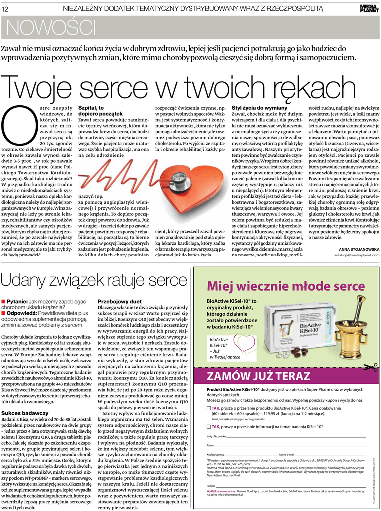 12 NIEZALEŻNY DODATEK TEMATYCZNY DYSTRYBUOWANY WRAZ Z RZECZPOSPOLITĄ nowości Zawał nie musi oznaczać końca życia w dobrym zdrowiu, lepiej jeśli pacjenci potraktują go jako bodziec do wprowadzenia pozytywnych zmian, które mimo choroby pozwolą cieszyć się dobrą formą i samopoczuciem. Twoje serce w twoich rękach Szpital, to dopiero początek Zawał serca powoduje zamknięcie tętnicy wieńcowej, która doprowadza krew do serca, dochodzi do martwicy części mięśnia sercowego. Życie pacjenta może uratować szybka hospitalizacja, ma ona na celu udrożnienie naczyń (np. za pomocą angioplastyki wieńcowej) i przywrócenie normalnego krążenia. To dopiero początek drogi powrotu do zdrowia. Już w drugiej - trzeciej dobie po zawale pacjent powinien rozpocząć rehabilitację, na początku są to bierne ćwiczenia w pozycji leżącej,których zadaniem jest pobudzenie krążenia. Po kilku dniach chory powinien rozpocząć ćwiczenia czynne, np. w postaci wolnych spacerów. Ważna jest systematyczność i kontynuacja aktywności, która nie tylko pomaga obniżać ciśnienie, ale również podwyższa poziom dobrego cholesterolu. Po wyjściu ze szpitala i okresie rehabilitacji każdy pa- cjent, który przeszedł zawał powinien znajdować się pod stałą opieką lekarza kardiologa, który zadba o farmakoterapię, towarzyszącą pacjentowi już do końca życia. Udany związek ratuje serce ■■Pytanie: Jak możemy zapobiegać chorobom układu krążenia? ■■Odpowiedź: Prawidłowa dieta plus odpowiednia suplementacja pomogą zminimalizować problemy z sercem. Choroby układu krążenia to jedna z cywilizacyjnych plag. Kardiolodzy od lat szukają skutecznych metod zapobiegania schorzeniom serca. W Europie Zachodniej lekarze wciąż odnotowują wysoki odsetek osób, zwłaszcza w podeszłym wieku, umierających z powodu chorób krążeniowych. Tegoroczne badanie szwedzkich naukowców,o akronimie KiSel-10, przeprowadzona na grupie 443 mieszkańców Kisa w Szwecji być może okaże się przełomem w dotychczasowym leczeniu i prewencji chorób układu krwionośnego. Sukces badawczy Badani z Kisa, w wieku od 70 do 88 lat, zostali podzieleni przez naukowców na dwie grupy – jedna przez 4 lata otrzymywała stałą dawkę selenu i koenzymu Q10, a druga tabletki placebo. Jak się okazało po zakończeniu eksperymentu, w grupie przyjmującej selen i koenzym Q10, ryzyko śmierci z powodu chorób serca było aż o 54% mniejsze. Osoby, którym regularnie podawana była dawka tych dwóch, naturalnych składników, miały również niższy poziom NT-proBNP – markera sercowego, który wskazuje na kondycję serca.Okazało się też, że suplementowana grupa lepiej wypadła w badaniach echokardiograficznych,które potwierdziły lepszą pracę mięśnia sercowego wśród tych osób. Przebojowy duet Dlaczego właśnie te dwa związki przyniosły sukces terapii w Kisa? Warto przyjrzeć się im bliżej. Koenzym Q10 jest obecny w większości komórek ludzkiego ciała i uczestniczy w wytwarzaniu energii do ich pracy. Największe stężenie tego związku występuje w sercu, wątrobie i nerkach. Zostało dowiedzione, że związek ten wspomaga pracę serca i reguluje ciśnienie krwi. Badania wykazały, iż stan zdrowia pacjentów cierpiących na zaburzenia krążenia, ulegał poprawie przy regularnym przyjmowaniu koenzymu Q10. Za koniecznością suplementacji koenzymu Q1O przemawia fakt, że już po 20-tym roku życia organizm zaczyna produkować go coraz mniej. W podeszłym wieku ilość koenzymu Q10 spada do połowy pierwotnej wartości. Istotny wpływ na funkcjonowanie ludzkiego organizmu ma też selen. Wzmacnia system odpornościowy, chroni nasze ciało przed negatywnym działaniem wolnych rodników, a także reguluje pracę tarczycy i wpływa na płodność. Badania wykazały, że im większy niedobór selenu, tym większe ryzyko zachorowania na choroby układu krążenia. W Polsce średnie spożycie tego pierwiastka jest jednym z najniższych w Europie, co może tłumaczyć częste występowanie problemów kardiologicznych w naszym kraju. Jeżeli nie dostarczamy organizmowi wystarczającej ilości selenu wraz z pożywieniem, warto rozważyć zastosowanie preparatów zawierających ten cenny pierwiastek. Styl życia do wymiany Zawał, chociaż może być dużym wstrząsem i dla ciała i dla psychiki nie musi oznaczać wykluczenia z normalnego życia czy ograniczenia naszej sprawności, o ile zadbamy o właściwą wtórną profilaktykę antyzawałową. Naszym priorytetem powinno być zwalczanie czynników ryzyka.Wrogiem dobrej kondycji naszego serca jest tytoń, chory po zawale powinien bezwzględnie rzucić palenie (zawał kilkakrotnie częściej występuje u palaczy niż u niepalących). Istotnym elementem profilaktyki jest też dieta – lekkostrawna i bogatoresztkowa, zawierająca wielonienasycone kwasy tłuszczowe, warzywa i owoce. Jej celem powinna być redukcja masy ciała i zapobieganie hipercholesterolemii. Kluczową rolę odgrywa kontynuacja aktywności fizycznej, wystarczy pół godziny umiarkowanego wysiłku dziennie,marsz,jazda na rowerze, nordic walking, możli- wości ruchu, najlepiej na świeżym powietrzu jest wiele, a jeśli mamy wątpliwości, co do ich intensywności zawsze można skonsultować je z lekarzem. Warto pamiętać o pilnowaniu obwodu pasa, ponieważ otyłość brzuszna (trzewna, wiscelarna) jest najgroźniejszym rodzajem otyłości. Pacjenci po zawale powinni również unikać alkoholu, który powoduje zmiany zwyrodnieniowe włókien mięśnia sercowego. Powinni tez pamiętać o zwalczaniu stresu i napięć emocjonalnych, które m.in. podnoszą ciśnienie krwi. Jak w przypadku każdej przewlekłej choroby ogromną rolę odgrywają badania okresowe – poziomu glukozy i cholesterolu we krwi, jak również ciśnienia krwi.Kontrolując i utrzymując te parametry na właściwym poziomie będziemy spokojni o nasze zdrowie. Anna Stojanowska [email protected] Miej wie