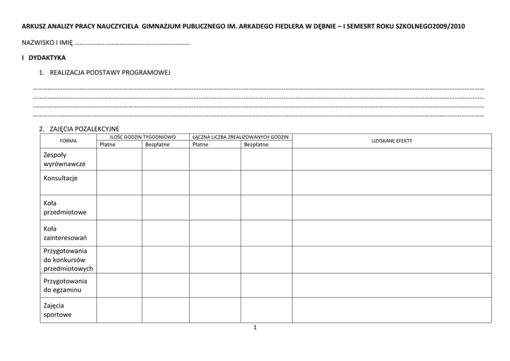 ARKUSZ ANALIZY PRACY NAUCZYCIELA GIMNAZJUM PUBLICZNEGO IM. ARKADEGO FIEDLERA W DĘBNIE – I SEMESRT ROKU SZKOLNEGO2009/2010 NAZWISKO I IMIĘ …………………………………………………………… I DYDAKTYKA 1. REALIZACJA PODSTAWY PROGRAMOWEJ ……………………………………………………………………………………………………………………………………………………………………………………………………………………………………………… ……………………………………………………………………………………………………………………………………………………………………………………………………………………………………………… ……………………………………………………………………………………………………………………………………………………………………………………………………………………………………………… ……………………………………………………………………………………………………………………………………………………………………………………………………………………………………………… 2. ZAJĘCIA POZALEKCYJNE FORMA ILOŚC GODZIN TYGODNIOWO Płatne Bezpłatne ŁĄCZNA LICZBA ZREALIZOWANYCH GODZIN Płatne Bezpłatne Zespoły wyrównawcze Konsultacje Koła przedmiotowe Koła zainteresowao Przygotowania do konkursów przedmiotowych Przygotowania do egzaminu Zajęcia sportowe 1 UZYSKANE EFEKTY 3. ORGANIZACJA I UDZIAŁ W KONKURSACH, ZAWODACH I FESTIWALACH LP. NAZWA KONKURSU ORGANIZATOR ( tak , nie) WSPÓŁORGANIZATOR ( tak, nie) ILOŚD UCZNIÓW, KTÓRA WZIĘŁA UDZIAŁ SUKCESY 1. 2. 3. 4. 4. INNE FORMY PRACY Z UCZNIEM SŁABYM LUB ZDOLNYM (NP. REALIZACJA PROJEKTÓW EDUKACYJNYCH) ……………………………………………………………………………………………………………………………………………………………………………………………………………………………………… ……………………………………………………………………………………………………………………………………………………………………………………………………………………………………… ……………………………………………………………………………………………………………………………………………………………………………………………………………………………………… 5. INNE FORMY DZIAŁALNOŚCI W ZAKRESIE PODNIESIENIA POZIOMU DYDAKTYCZNEGO SZKOŁY (Np. opracowanie testów do diagnozy, sprawdzianów wewnętrznych, ocena testów, analiza wyniku egzaminu, opracowanie raportu, udział w pracach zespołu przedmiotowego, konkretne działania podjęte w celu podniesienia uzyskanych wyników z diagnozy wstępnej uczniów kl. 1, konkretne działania na rzecz wykorzystania wyników egzaminów zewnętrznych i diagnoz, rozpoznanie przypadku dydaktycznego) Lp. NAZWA DZIAŁANIA 1. 2. 3. 2 II INNE DZIAŁANIA NA RZECZ SZKOŁY I ŚRODOWISKA 1. IMPREZY SZKOLNE a) Których organizatorem był nauczyciel…………………………………………………………………………………………………………………………………............................... ………………………………………………………………………………………………………………………………………………………………………………………………………………………………… ……………………………………………………………………………………………………………………………………………………………………………………………………………………………….. b) Których współorganizatorem był nauczyciel …………………………………………………………………………………………………………………………………………………….. ………………………………………………………………………………………………………………………………………………………………………………………………………………………………… ……………………………………………………………………………………………………………………………………………………………………………………………………………………………….. c) W których nauczyciel brał udział ………………………………………………………………………………………………………………………………………………………………………. ………………………………………………………………………………………………………………………………………………………………………………………………………………………………… ………………………………………………………………………………………………………………………………………………………………………………………………………………………………… 2. IMPREZY ŚRODOWISKOWE a) Których organizatorem był nauczyciel…………………………………………………………………………………………………………………………………............................... ………………………………………………………………………………………………………………………………………………………………………………………………………………