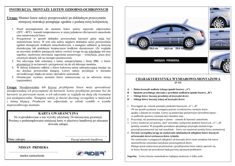 INSTRUKCJA MONTAŻU LISTEW OZDOBNO-OCHRONNYCH Uwaga: Montaż listew należy przeprowadzić po dokładnym przeczytaniu niniejszej instrukcji postępując zgodnie z podaną niżej kolejnością . 1. Przed przystąpieniem do montażu listew należy zapewnić odpowiednie (20oC - 40oC) warunki temperaturowe w miarę jednakowe dla karoserii samochodu oraz montowanych listew. 2. Przygotować w sposób dokładny powierzchnię karoserii gdzie mają być zamontowane listwy. W tym celu należy najpierw dokładnie umyć powierzchnię ogólnie dostępnymi środkami samochodowymi, a następnie odtłuścić ją benzyną ekstrakcyjną lub podobnym bezpiecznym środkiem chemicznym. (Ze względu na używanie środków parujących należy zwrócić uwagę na nie wdychanie ich oraz zapobiec możliwości powstania zagrożenia pożarowego – wentylacja, praca przy otwartych oknach, lub na zewnątrz pomieszczeń). 3. Nie odrywając folii ochronnej z taśmy samoprzylepnej ( firmy 3M) z listew przymierzyć je na karoserii i przygotować się do ich dalszego montażu. 4. W dalszej kolejności odkleić z listew kolorową taśmę zabezpieczającą starając się nie dotykać powierzchni klejącej. Listwy należy przyklejać w kierunku od środkowego słupka do strony zderzaków samochodu. 5. Orientacyjne wymiary montażu listew zamieszczone są na odwrocie strony (opcjonalnie). Uwaga: Nieodpowiednie lub krzywe przyklejenie listew może spowodować nieodpowiednią ich przyczepność do karoserii. Listwy przyklejone powinny być do karoserii za pierwszym razem, a ich odrywanie ze względu na dużą siłę trzymania jest niedopuszczalne. Następnie należy je mocno docisnąć szczególnie w miejscach z taśmą klejącą. Producent nie odpowiada za szkody wynikłe w wyniku nieprawidłowego montażu. KARTA GWARANCYJNA Na wyprodukowane u nas wyroby udzielamy 24-miesięcznej gwarancji. Prosimy o podstemplowanie niniejszej karty w placówce handlowej po okazaniu dowodu zakupu. ……………………………….. Data zakupu....................…...... NISSAN PRIMERA …………………………………….. . marka samochodu Pieczęć placówki handlowej CHARAKTERYSTYKA WYMIAROWO-MONTAŻOWA (F-15) A B C D - Dolna krawędź nadkola tylnego (punkt bazowy „A”) Spojenie przedniego zderzaka z przednim nadkolem (punkt bazowy „B”) Odstęp listwy bocznej przedniej od krawędzi drzwi Odstęp listwy bocznej tylnej od krawędzi drzwi 1. Przeciągnąć np. sznurek pomiędzy punktami bazowymi „A” i „B”. (W ten sposób uzyskamy wymagany poziom wysokościowy montażu listew, zgodny z danymi na rysunku. Listwy są montowane pod pewnym niewielkim kątem – co podkreśla sportowy (dynamiczny) charakter auta. 2. Przycisnąć, nie przemieszczając w pionie – sznurek do karoserii samochodu. 3. Listwy montować tuż poniżej „linii” powstałej z połączenia punktów bazowych „A” i „B” (poniżej sznurka). W przypadku posiadania specjalnego przyrządu montażowego – przyrząd przymocować tuż nad sznurkiem – listwy zaś montować poniżej listwy montażowej. 4. Zwrócić szczególną uwagę na zachowanie minimalnych odległości listew bocznych od krawędzi drzwi (zwłaszcza listew tylnich). Nie zachowanie wymaganych odległości od krawędzi drzwi może utrudniać lub nawet uniemożliwiać otwieranie/zamykanie poszczególnych drzwi. Dlatego przed ostatecznym przyłożeniem i przyklejeniem listew należy upewnić się, że listwy boczne nie powodować będą powyżej opisanych problemów. Sugestia: Listwy boczne samochodowe najlepiej montować w kilka osób.