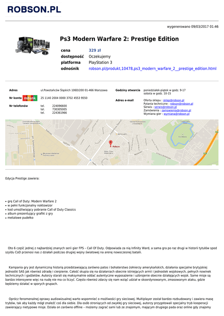 wygenerowano 09/03/2017 01:46 Ps3 Modern Warfare 2: Prestige Edition cena 329 zł dostępność Oczekujemy platforma PlayStation 3 odnośnik robson.pl/produkt,10478,ps3_modern_warfare_2__prestige_edition.html Adres ul.Powstańców Śląskich 106D/200 01-466 Warszawa Nr konta 25 1140 2004 0000 3702 4553 9550 Nr telefonów tel. 224096600 tel. 730305005 tel. 224361966 Godziny otwarcia poniedziałek-piątek w godz. 9-17 sobota w godz. 10-15 Adres e-mail Oferta sklepu : [email protected] Pytania techniczne : [email protected] Serwis : [email protected] Zamówienia : [email protected] Wymiana gier : [email protected] Edycja Prestige zawiera: ● ● ● ● ● grę Call of Duty: Modern Warfare 2 w pełni funkcjonalny noktowizor kod umożliwiający pobranie Call of Duty Classics album prezentujący grafiki z gry metalowe pudełko Oto 6 część jednej z najbardziej znanych serii gier FPS – Call Of Duty. Odpowiada za nią Infinity Ward, a sama gra po raz drugi w historii tytułów spod szyldu CoD przenosi nas z działań podczas drugiej wojny światowej na arenę nowoczesnej batalii. Kampania gry jest dynamiczną historią przedstawiającą zarówno patos i bohaterstwo żołnierzy amerykańskich, działania specjalne brytyjskiej jednostki SAS jak również zdradę i cierpienie. Całość skupia się na działaniach obecnie istniejących armii i jednostek wojskowych, pełnych nowinek technicznych i gadżetów. Autorzy starali się maksymalnie oddać autentyczne wyposażenie i uzbrojenie obecnie działających wojsk. Same misje są bardzo intensywne więc na nudę nie ma co liczyć. Często również zdarzy się nam wziąć udział w skoordynowanym, zmasowanym ataku, gdzie będziemy działać w sporych grupach. Oprócz fenomenalnej oprawy audiowizualnej warto wspomnieć o możliwości gry sieciowej. Multiplayer został bardzo rozbudowany i zawiera masę trybów, tak aby każdy mógł znaleźć coś dla siebie. Dla osób stroniących od zwykłej gry sieciowej, autorzy przygotowali specjalny tryb kooperacji zawierający nietypowe misje. Działa on zarówno offline – możemy zagrać sami lub ze znajomym, mającym drugiego pada oraz online gdy znajomy zawiedzie. Producenci przygotowali bardzo urozmaicone 23 misje opatrzone nazwą Special Ops.