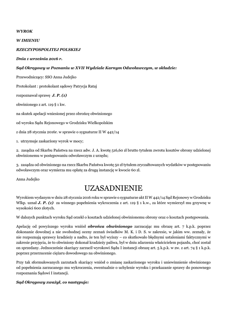 WYROK W IMIENIU RZECZYPOSPOLITEJ POLSKIEJ Dnia 1 września 2016 r. Sąd Okręgowy w Poznaniu w XVII Wydziale Karnym Odwoławczym, w składzie: Przewodniczący: SSO Anna Judejko Protokolant : protokolant sądowy Patrycja Rataj rozpoznawał sprawę J. P. (1) obwinionego z art. 119 § 1 kw. na skutek apelacji wniesionej przez obrońcę obwinionego od wyroku Sądu Rejonowego w Grodzisku Wielkopolskim z dnia 28 stycznia 2016r. w sprawie o sygnaturze II W 442/14 1. utrzymuje zaskarżony wyrok w mocy; 2. zasądza od Skarbu Państwa na rzecz adw. J. A. kwotę 516,60 zł brutto tytułem zwrotu kosztów obrony udzielonej obwinionemu w postępowaniu odwoławczym z urzędu; 3. zasądza od obwinionego na rzecz Skarbu Państwa kwotę 50 zł tytułem zryczałtowanych wydatków w postępowaniu odwoławczym oraz wymierza mu opłatę za drugą instancję w kwocie 60 zł. Anna Judejko UZASADNIENIE Wyrokiem wydanym w dniu 28 stycznia 2016 roku w sprawie o sygnaturze akt II W 442/14 Sąd Rejonowy w Grodzisku Wlkp. uznał J. P. (1) za winnego popełnienia wykroczenia z art. 119 § 1 k.w., za które wymierzył mu grzywnę w wysokości 600 złotych. W dalszych punktach wyroku Sąd orzekł o kosztach udzielonej obwinionemu obrony oraz o kosztach postępowania. Apelację od powyższego wyroku wniósł obrońca obwinionego zarzucając mu obrazę art. 7 k.p.k. poprzez dokonanie dowolnej a nie swobodnej oceny zeznań świadków M. K. i D. S. w zakresie, w jakim ww. zeznały, że nie rozpoznają sprawcy kradzieży a nadto, że ten był wyższy – co skutkowało błędnymi ustaleniami faktycznymi w zakresie przyjęcia, że to obwiniony dokonał kradzieży paliwa, był w dniu zdarzenia właścicielem pojazdu, choć został on sprzedany. Jednocześnie skarżący zarzucił wyrokowi Sądu I instancji obrazę art. 5 k.p.k. w zw. z art. 74 § 1 k.p.k. poprzez przerzucenie ciężaru dowodowego na obwinionego. Przy tak sformułowanych zarzutach skarżący wniósł o zmianę zaskarżonego wyroku i uniewinnienie obwinionego od popełnienia zarzucanego mu wykroczenia, ewentualnie o uchylenie wyroku i przekazanie sprawy do ponownego rozpoznania Sądowi I instancji. Sąd Okręgowy zważył, co następuje: Apelacja wniesiona przez obrońcę obwinionego okazała się bezzasadna, zawarte zaś w niej argumenty stanowią jedynie pozbawioną podstaw polemikę z prawidłowymi ustaleniami warunkującymi przypisanie J. P. (1) zarówno sprawstwa jak i winy w odniesieniu do zarzucanego mu czynu. Skarżący we wniesionej apelacji sformułował bowiem pod adresem wyroku Sądu I instancji zarzut poczynienia przez tenże Sąd błędnych ustaleń faktycznych przy niewłaściwej, noszącej znamiona dowolnej ocenie dowodów. Zarzut ten okazał się jednak całkowicie chybiony. Zarzut błędu w ustaleniach faktycznych przyjętych za podstawę wyroku tylko wtedy jest bowiem słuszny, gdy zasadność ocen i wniosków wyprowadzonych przez Sąd orzekający z okoliczności ujawnionych w toku przewodu sądowego nie odpowiada prawidłowości logicznego rozumowania. Zarzut ten nie może zaś ograniczać się do samej polemiki z ustaleniami Sądu (por. m. in. OSN PG 1975, 9, 84). Musi wynikać bądź to z niepełności postępowania dowodowego, bądź też z przekroczenia granic swobodnej oceny dowodów. O takim przekroczeniu można zaś mówić jedynie wówczas, gdy przekonanie Sądu o wiarygodności jednych dowodów i niewiarygodności innych nie jest poprzedzone ujawnieniem w toku rozprawy całokształtu okoliczności i to w sposób podyktowany obowiązkiem dochodzenia prawdy, nie stanowi efektu rozważenia wszystkich okoliczności – zarówno korzystnych, jak i niekorzystnych dla obwinionego, nie jest logicznie ani wyczerpująco uargumentowane w uzasadnieniu wyroku, bądź też narusza wskazania wiedzy i doświadczenia życiowego (por. m. in. OSN KW (...), 6, 67; OSN KW (...), 7-9, 41). Tymczasem Sąd pierwszej instancji dokonał w sposób precyzyjny analizy dowodów a następnie dokładnie wyjaśnił w jakim zakresie i dlaczego uwzględnił bądź zdyskwalifikował wartość poszczególnych z nich. Na podstawie analizy materiału dowodowego sprawy Sąd odwoławczy wyraża zatem całkowitą aprobatę toku rozumowania i ustaleń Sądu pierwszej instancji, w którym nie ma żadnych błędów natury faktycznej czy logicznej. W sprawie nie pozostały zarazem żadne wątpliwości, które – wobec niemożności ich usunięcia – wymagałyby rozstrzygnięcia na korzyść obwinionego. Efektem prawidłowo przeprowadzonego postępowania dowodowego i właściwej oceny dowodów był przy tym należycie ustalony stan faktyczny. Odnosząc się zaś szczegółowo do podnoszonych przez obrońcę obwinionego zarzutów dotyczących prawidłowości oceny wiarygodności materiału dowodowego zgromadzonego w sprawie należy stwierdzić, iż skarżący w żaden sposób nie wykazał, by Sąd Rejonowy dając wiarę jednym dowodom a odmawiając jej innym naruszył dyspozycję przepisu art. 7 k.p.k. Skarżący przedstawił we wniesionym środku odwoławczym własną interpretację materiału dowodowego – w szczególności zaś treści wyjaśnień obwinionego oraz zeznań świadka K. W. – która nie mogła jednak ostać się w świetle zasad logiki i doświadczenia życiowego. Należy w tym miejscu z całą mocą podkreślić, iż wbrew twierdzeniom autora apelacji procedując w przedmiotowej sprawie Sąd Rejonowy nie dopuścił się obrazy art. 5 i art. 74 k.p.k. przerzucając na J. P. (2) ciężar udowodnienia, że nie popełnił on zarzucanego mu czynu. Oczywistym jest, iż to na oskarżycielu spoczywał obowiązek wykazania sprawstwa i winy obwinionego, sam zaś obwiniony mógł podjąć się obrony bądź też mógł tego nie czynić. Nie mniej jednak przedstawiając określoną wersję wydarzeń czy też swego rodzaju alibi J. P. (1) winien liczyć się z tym, że poddane one zostaną weryfikacji przez Sąd orzekający w sprawie. W niniejszym zaś postępowaniu weryf
