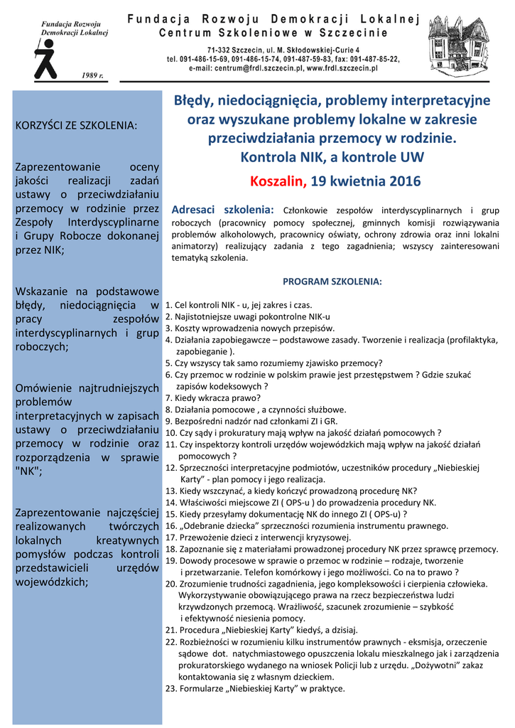 KORZYŚCI ZE SZKOLENIA: Zaprezentowanie oceny jakości realizacji zadań ustawy o przeciwdziałaniu przemocy w rodzinie przez Zespoły Interdyscyplinarne i Grupy Robocze dokonanej przez NIK; Wskazanie na podstawowe błędy, niedociągnięcia w pracy zespołów interdyscyplinarnych i grup roboczych; Omówienie najtrudniejszych problemów interpretacyjnych w zapisach ustawy o przeciwdziałaniu przemocy w rodzinie oraz rozporządzenia w sprawie "NK"; Zaprezentowanie najczęściej realizowanych twórczych lokalnych kreatywnych pomysłów podczas kontroli przedstawicieli urzędów wojewódzkich; Błędy, niedociągnięcia, problemy interpretacyjne oraz wyszukane problemy lokalne w zakresie przeciwdziałania przemocy w rodzinie. Kontrola NIK, a kontrole UW Koszalin, 19 kwietnia 2016 Adresaci szkolenia: Członkowie zespołów interdyscyplinarnych i grup roboczych (pracownicy pomocy społecznej, gminnych komisji rozwiązywania problemów alkoholowych, pracownicy oświaty, ochrony zdrowia oraz inni lokalni animatorzy) realizujący zadania z tego zagadnienia; wszyscy zainteresowani tematyką szkolenia. PROGRAM SZKOLENIA: 1. Cel kontroli NIK - u, jej zakres i czas. 2. Najistotniejsze uwagi pokontrolne NIK-u 3. Koszty wprowadzenia nowych przepisów. 4. Działania zapobiegawcze – podstawowe zasady. Tworzenie i realizacja (profilaktyka, zapobieganie ). 5. Czy wszyscy tak samo rozumiemy zjawisko przemocy? 6. Czy przemoc w rodzinie w polskim prawie jest przestępstwem ? Gdzie szukać zapisów kodeksowych ? 7. Kiedy wkracza prawo? 8. Działania pomocowe , a czynności służbowe. 9. Bezpośredni nadzór nad członkami ZI i GR. 10. Czy sądy i prokuratury mają wpływ na jakość działań pomocowych ? 11. Czy inspektorzy kontroli urzędów wojewódzkich mają wpływ na jakość działań pomocowych ? 12. Sprzeczności interpretacyjne podmiotów, uczestników procedury „Niebieskiej Karty” - plan pomocy i jego realizacja. 13. Kiedy wszczynać, a kiedy kończyć prowadzoną procedurę NK? 14. Właściwości miejscowe ZI ( OPS-u ) do prowadzenia procedury NK. 15. Kiedy przesyłamy dokumentację NK do innego ZI ( OPS-u) ? 16. „Odebranie dziecka” sprzeczności rozumienia instrumentu prawnego. 17. Przewożenie dzieci z interwencji kryzysowej. 18. Zapoznanie się z materiałami prowadzonej procedury NK przez sprawcę przemocy. 19. Dowody procesowe w sprawie o przemoc w rodzinie – rodzaje, tworzenie i przetwarzanie. Telefon komórkowy i jego możliwości. Co na to prawo ? 20. Zrozumienie trudności zagadnienia, jego kompleksowości i cierpienia człowieka. Wykorzystywanie obowiązującego prawa na rzecz bezpieczeństwa ludzi krzywdzonych przemocą. Wrażliwość, szacunek zrozumienie – szybkość i efektywność niesienia pomocy. 21. Procedura „Niebieskiej Karty” kiedyś, a dzisiaj. 22. Rozbieżności w rozumieniu kilku instrumentów prawnych - eksmisja, orzeczenie sądowe dot. natychmiastowego opuszczenia lokalu mieszkalnego jak i zarządzenia prokuratorskiego wydanego na wniosek Policji lub z urzędu. „Dożywotni” zakaz kontaktowania się z własnym dzieckiem. 23. Formularze „Niebieskiej Karty” w praktyce. Prowadzący: DANE DO KONTAKTU: Centrum Szkoleniowe FRDL 71-332 Szczecin ul. M. Skłodowskiej-Curie 4 tel. 91 486 15 69, fax 91 487 85 22 e-mail: [email protected] w w w. frd l. sz cz e cin .p l Z wykształcenia prawnik i administratywista – ukończone studia podyplomowe z Prawa Karnego, psychologii społecznej, komunikacji społecznej, zarządzania i organizacji, Członek stowarzyszenia „Niebieska Linia”, współpracował przy tworzeniu „Niebieskiej Karty”, pomysłodawca „Niebieskich Pokoi”. W ramach pracy w policji współpracował z instytucjami pomocy społecznej. Aktualnie trener, posiadający doświadczenie w realizacji szkoleń dla grup interdyscyplinarnych (OPS, PUP, PCPR, NGO). Miejsce: Koszalin, Środkowopomorska rada NOT-u ul. Jana z Kolna 38 Czas trwania: godz. 10.00-15.00 Cena: 320 zł netto/os. przy zgłoszeniu do 4 kwietnia . 350 zł netto/os przy zgłoszeniu po 4 kwietnia. Zwolnione z VAT w przypadku szkoleń podnoszących kwalifikacje pracowników JST oraz ich jednostek organizacyjnych oraz finansowania szkolenia w co najmniej 70% ze środków publicznych. W cenie: materiały szkoleniowe, zaświadczenie o ukończeniu szkolenia, lunch i serwis kawowy. RABAT 10% dla każdej kolejnej osoby zgłoszonej z tej samej instytucji Zgłoszenia: należy dokonywać najpóźniej do dnia 11.04.2016r. drogą elektroniczną poprzez stronę www.frdl.szczecin.pl, faksem (091 4878522) bądź listownie.