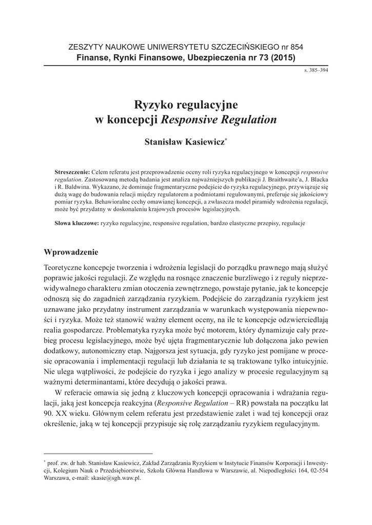 ZESZYTY NAUKOWE UNIWERSYTETU SZCZECIŃSKIEGO nr 854 Finanse, Rynki Finansowe, Ubezpieczenia nr 73 (2015) s. 385–394 Ryzyko regulacyjne w koncepcji Responsive Regulation Stanisław Kasiewicz* Streszczenie: Celem referatu jest przeprowadzenie oceny roli ryzyka regulacyjnego w koncepcji responsive regulation. Zastosowaną metodą badania jest analiza najważniejszych publikacji J. Braithwaite’a, J. Blacka i R. Baldwina. Wykazano, że dominuje fragmentaryczne podejście do ryzyka regulacyjnego, przywiązuje się dużą wagę do budowania relacji między regulatorem a podmiotami regulowanymi, preferuje się jakościowy pomiar ryzyka. Behawioralne cechy omawianej koncepcji, a zwłaszcza model piramidy wdrożenia regulacji, może być przydatny w doskonaleniu krajowych procesów legislacyjnych. Słowa kluczowe: ryzyko regulacyjne, responsive regulation, bardzo elastyczne przepisy, regulacje Wprowadzenie Teoretyczne koncepcje tworzenia i wdrożenia legislacji do porządku prawnego mają służyć poprawie jakości regulacji. Ze względu na rosnące znaczenie burzliwego i z reguły nieprzewidywalnego charakteru zmian otoczenia zewnętrznego, powstaje pytanie, jak te koncepcje odnoszą się do zagadnień zarządzania ryzykiem. Podejście do zarządzania ryzykiem jest uznawane jako przydatny instrument zarządzania w warunkach występowania niepewności i ryzyka. Może też stanowić ważny element oceny, na ile te koncepcje odzwierciedlają realia gospodarcze. Problematyka ryzyka może być motorem, który dynamizuje cały przebieg procesu legislacyjnego, może być ujęta fragmentarycznie lub dołączona jako pewien dodatkowy, autonomiczny etap. Najgorsza jest sytuacja, gdy ryzyko jest pomijane w procesie opracowania i implementacji regulacji lub działania te są traktowane tylko intuicyjnie. Nie ulega wątpliwości, że podejście do ryzyka i jego analizy w procesie regulacyjnym są ważnymi determinantami, które decydują o jakości prawa. W referacie omawia się jedną z kluczowych koncepcji opracowania i wdrażania regulacji, jaką jest koncepcja reakcyjna (Responsive Regulation – RR) powstała na początku lat 90. XX wieku. Głównym celem referatu jest przedstawienie zalet i wad tej koncepcji oraz określenie, jaką w tej koncepcji przypisuje się rolę zarządzaniu ryzykiem regulacyjnym. * prof. zw. dr hab. Stanisław Kasiewicz, Zakład Zarządzania Ryzykiem w Instytucie Finansów Korporacji i Inwestycji, Kolegium Nauk o Przedsiębiorstwie, Szkoła Główna Handlowa w Warszawie, al. Niepodległości 164, 02-554 Warszawa, e-mail: [email protected]. 386 Stanisław Kasiewicz 1. Założenia koncepcji i jej znaczenie w teorii i praktyce legislacyjnej W opinii Johna Braithwaite’a koncepcja ta narodziła się w 1992 roku (Braithwaite 2011: 477) w trakcie przygotowania publikacji wraz z Ianem Ayresem (Ayres, Braithwaite 1992). Istota jej polega na integracji dwóch przeciwstawnych strategii wdrażania legislacji, z których jedna opierała się na wykorzystaniu w szerokim zakresie kar w stosunku do regulowanych podmiotów , natomiast druga odwoływała się do stosowania różnego rodzaju promocji, zachęt i narzędzi motywacyjnych. Jest to zatem koncepcja „kija i marchewki”, wykorzystująca z jednej strony mechanizmy pobudzania podmiotów, aby ukazać im korzyści wynikające z implementacji danej regulacji, zaś z drugiej – stosująca odczuwalne kary dla tych, którzy świadomie nie przestrzegają wprowadzanych zasad regulacyjnych. Tę koncepcję regulacyjną wspiera model opracowany przez Ayresa i Braithwaite’a nazwany „piramidą wdrożenia” (rys. 1). Licencje Zawieszenie Li licencji Sankcje karne Sankcje cywilne (grzywny, zawieszenie na krótki okres) Inspekcje i badania Negocjacje i ustalenia Zachęty, porady, edukacja i pomoc we wdrożeniu Rysunek 1. Piramida wdrożenia regulacji Źródło: Ayres, Braithwaite (1992), za: Weers de (2011): 14. Myśl, jaka przyświeca temu modelowi jest taka, aby proces wdrożenia legislacji rozpocząć od zastosowania miękkich instrumentów zachęcających do jej przyjęcia. Zaleca się stopniowe przechodzenie do zachęt lub kar kierując się ich kosztem i poziomem trudności zarządczych. Przykładowy układ zachęt i kar przedstawiony jest na rysunku 1 i może być adaptowany elastycznie w zależności od rozpoznania podmiotów legislacji, ich zachowań, czy wynikać z prowadzonych konsultacji z zainteresowanymi interesariuszami legislacji. Ryzyko regulacyjne w koncepcji Responsive Regulation 387 Model ten wskazuje, że nie można w dowolnej kolejności stosować tych instrumentów, lecz musi być zachowana siła skuteczności i wrażliwości podmiotów regulowanych na przyjęte narzędzia stymulowania. Na przykład dla banków najwyższą karą jest utrata licencji prowadzenia usług bankowych. Dla ułatwienia prac związanych z ustalaniem hierarchii narzędzi stymulacyjnych i starając się uprościć złożoność tej koncepcji, J. Braithwaite proponuje stosowanie dziewięciu zasad (heurystyk) (Braithwaite 2011: 476). Zasada 1. Regulator powinien uwzględniać szerszy kontekst regulacji nie przyjmując z góry żadnej teoretycznej koncepcji. Przyjmowanie nieadekwatnej koncepcji teoretycznej prowadzi do opracowania nieskutecznej i nieefektywnej regulacji. Polega to na bezkrytycznym przyjmowaniu założenia, że tylko mechanizm rynkowy jest skuteczny. Przykłady General Motors czy banków w okresie kryzysu finansowego w latach 2008–2009 przeczą tej opinii. Braithwaite podkreśla tym samym, że w gospodarce jest miejsce dla wielu firm o strukturze prywatno-państwowej i że finansowanie publiczne programów naprawczych daje prawo do dokonywania restrukturyzacji według intencji finansujących (konflikt z prezesem General Motors – Richardem Wagonerem). Akcentuje też potrzebę myślenia zgodnego z duchem czasu i uznania znaczenia historii w procesie opracowania regulacji. Jego zdaniem historycy postępują jak dziennikarze i zadaj