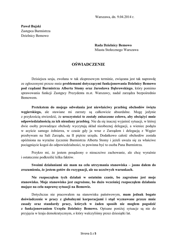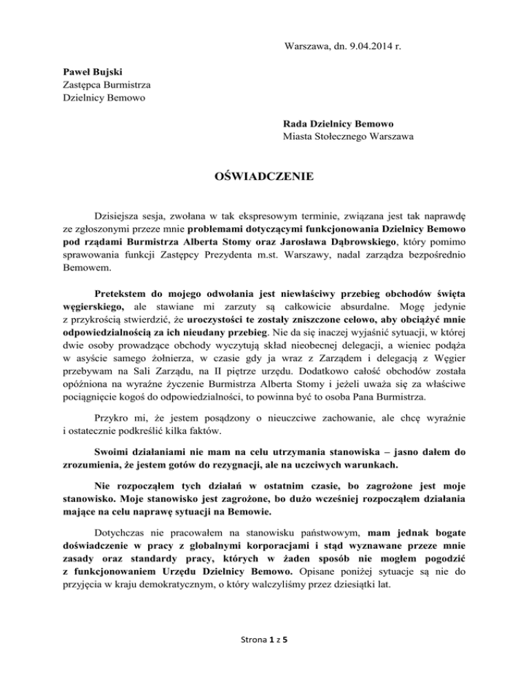 Warszawa, dn. 9.04.2014 r. Paweł Bujski Zastępca Burmistrza Dzielnicy Bemowo Rada Dzielnicy Bemowo Miasta Stołecznego Warszawa OŚWIADCZENIE Dzisiejsza sesja, zwołana w tak ekspresowym terminie, związana jest tak naprawdę ze zgłoszonymi przeze mnie problemami dotyczącymi funkcjonowania Dzielnicy Bemowo pod rządami Burmistrza Alberta Stomy oraz Jarosława Dąbrowskiego, który pomimo sprawowania funkcji Zastępcy Prezydenta m.st. Warszawy, nadal zarządza bezpośrednio Bemowem. Pretekstem do mojego odwołania jest niewłaściwy przebieg obchodów święta węgierskiego, ale stawiane mi zarzuty są całkowicie absurdalne. Mogę jedynie z przykrością stwierdzić, że uroczystości te zostały zniszczone celowo, aby obciążyć mnie odpowiedzialnością za ich nieudany przebieg. Nie da się inaczej wyjaśnić sytuacji, w której dwie osoby prowadzące obchody wyczytują skład nieobecnej delegacji, a wieniec podąża w asyście samego żołnierza, w czasie gdy ja wraz z Zarządem i delegacją z Węgier przebywam na Sali Zarządu, na II piętrze urzędu. Dodatkowo całość obchodów została opóźniona na wyraźne życzenie Burmistrza Alberta Stomy i jeżeli uważa się za właściwe pociągnięcie kogoś do odpowiedzialności, to powinna być to osoba Pana Burmistrza. Przykro mi, że jestem posądzony o nieuczciwe zachowanie, ale chcę wyraźnie i ostatecznie podkreślić kilka faktów. Swoimi działaniami nie mam na celu utrzymania stanowiska – jasno dałem do zrozumienia, że jestem gotów do rezygnacji, ale na uczciwych warunkach. Nie rozpocząłem tych działań w ostatnim czasie, bo zagrożone jest moje stanowisko. Moje stanowisko jest zagrożone, bo dużo wcześniej rozpocząłem działania mające na celu naprawę sytuacji na Bemowie. Dotychczas nie pracowałem na stanowisku państwowym, mam jednak bogate doświadczenie w pracy z globalnymi korporacjami i stąd wyznawane przeze mnie zasady oraz standardy pracy, których w żaden sposób nie mogłem pogodzić z funkcjonowaniem Urzędu Dzielnicy Bemowo. Opisane poniżej sytuacje są nie do przyjęcia w kraju demokratycznym, o który walczyliśmy przez dziesiątki lat. Strona 1 z 5 Sytuacja jest wysoce alarmująca i wymaga natychmiastowej interwencji ze strony Radnych Dzielnicy Bemowo. O przedstawionych w poniższym piśmie problemach, poinformowałem osobiście w rozmowie w dniu 7.04.2014 Panią Prezydent Hannę Gronkiewicz-Waltz, która zadeklarowała, że przeprowadzi staranne kontrole opisywanych nieprawidłowości. Niestety grupa radnych Platformy Obywatelskiej pod przywództwem Jarosława Dąbrowskiego podejmuje nieustające próby usunięcia mnie z życia publicznego Bemowa, prawdopodobnie w odwecie za zgłoszenie nieprawidłowości oraz w celu uniemożliwienia przeprowadzenia rzetelnej kontroli zgłaszanych nieprawidłowości. Sposób traktowania mojej osoby, począwszy od zastraszania, zniesławiania, nastawiania negatywnie do mnie pracowników i radnych, tworzeniu atmosfery zagrożenia, a kończąc na zmuszaniu do rezygnacji z funkcji Zastępcy Burmistrza z absurdalnych powodów można uznać za przejawy mobbingu, manipulacji oraz nadużywania stanowiska ze strony Burmistrza Dzielnicy Bemowo, Alberta Stomy oraz Zastępcy Prezydenta m.st. Warszawy, Jarosława Dąbrowskiego. Niestety doświadczam tych przykrych zachowań od dłuższego czasu. Pragnę poinformować, że w związku z poważną kontuzją kolana i czekającymi mnie w związku z tym badaniami oraz planowaną operacją, od 18 marca br. przebywam na zwolnieniu lekarskim. Apeluję do Wysokiej Rady o wstrzymanie się od głosowania, które w związku z moją sytuacją zdrowotną w tym momencie niewłaściwe z czysto ludzkiego punktu widzenia, ale stanowi również naruszenia obowiązującego Kodeksu Pracy i ustawy o pracownikach samorządowych. Dla Bemowa poświęciłem ostatnie dziewięć lat mojego życia; przez cztery lata zmieniałem Bemowo jako Radny, a przez ostatnie trzy i pół roku jako Zastępca Burmistrza. Dotychczas otrzymywałem wyłącznie pozytywne opinie wykonywanych przeze mnie obowiązków, uważam też, że wniosłem ogromny wkład w rozwój kulturalny Bemowa. Z dzielnicą związany jestem od ponad trzydziestu lat, a moja rodzina mieszka na terenie Bemowa od końca XIX wieku. Niepokojące sygnały o licznych nieprawidłowościach w funkcjonowaniu Urzędu Dzielnicy Bemowo docierały do mnie wcześniej i w związku z powyższym zdecydowałem się zareagować po raz pierwszy na początku 2013 roku. Podległe mi instytucje, Bemowskie Centrum Kultury oraz Centrum Zdrowia i Edukacji Ekologicznej, okazały się być niezależnymi tworami, podległymi bezpośrednio do dnia dzisiejszego Jarosławowi Dąbrowskiemu. Odebrano mi możliwość ingerencji w pracę wyżej wspomnianych ośrodków, zatrudnienia osób i wyciągania konsekwencji w przypadku niedopełniania obowiązków przez pracowników, a także zawieranych umów, których część w mojej opinii uznać można za fikcyjne. Pierwszy raz zareagowałem w sprawie dotyczącej Naczelnika Wydziału Kultury, w mojej opinii, jak i podległych jej maltretowanych pracowników, psychicznie Pani Urszuli Białas. Jej działania godziły w podległych jej pracowników, a także w sprawne Strona 2 z 5 funkcjonowanie i reputację Wydziału. Potwierdzone to było licznymi skargami o mobbing napływającymi od pracowników, ale również od osób z zewnątrz. Dochodziło do kuriozalnych sytuacji zrywania współpracy przez szanowane fundacje kultury ze względu na brak porozumienia z Panią Białas. Byłem nieustępliwy i wobec apelu wszystkich pracowników Wydziału, zgłosiłem sprawę do będącego jeszcze wtedy burmistrzem Jarosława Dąbrowskiego, który odmówił przyjęcia oficjalnej skargi i obiecał sytuację naprawić. Zakończyło się przeniesieniem pokrzywdzonych pracowników do różnych wydziałów, a ja usłyszałem przykre słowa reprymendy. Pani Urszula Białas sprawuje nieudolnie swoją fu