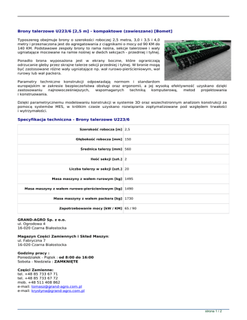 Brony talerzowe U223/6 [2,5 m] - kompaktowe (zawieszane) [Bomet] Typoszereg obejmuje brony o szerokości roboczej 2,5 metra, 3,0 i 3,5 i 4,0 metry i przeznaczona jest do agregatowania z ciągnikami o mocy od 90 KM do 140 KM. Podstawowe zespoły brony to rama nośna, sekcje talerzowe i wały ugniatające mocowane na ramie nośnej w dwóch sekcjach - przedniej i tylnej. Ponadto brona wyposażona jest w ekrany boczne, które ograniczają odrzucanie gleby przez skrajne talerze sekcji przedniej i tylnej. W bronie mogą być zastosowane różne wały ugniatające np. wał rurowo-pierścieniowym, wał rurowy lub wał packera. Parametry techniczne konstrukcji odpowiadają normom i standardom europejskim w zakresie bezpieczeństwa obsługi oraz ergonomii, a jej wysoką efektywność uzyskano dzięki zastosowaniu najnowocześniejszych, wspomaganych techniką komputerową, metod projektowania i konstruowania. Dzięki parametrycznemu modelowaniu konstrukcji w systemie 3D oraz wszechstronnym analizom konstrukcji za pomocą systemów MES, w krótkim czasie uzyskano rozwiązania zoptymalizowane pod względem trwałości i wytrzymałości. Specyfikacja techniczna - Brony talerzowe U223/6 Szerokość robocza [m] 2,5 Głębokość robocza [mm] 150 Średnica talerzy [mm] 560 Ilość sekcji [szt.] 2 Liczba talerzy w sekcji [szt.] 20 Masa maszyny z wałem rurowym [kg] 1495 Masa maszyny z wałem rurowo-pierścieniowym [kg] 1490 Masa maszyny z wałem packera [kg] 1730 Zapotrzebowanie mocy [kW / KM] 65 / 90 GRAND-AGRO Sp. z o.o. ul. Ogrodowa 4 16-020 Czarna Białostocka Magazyn Części Zamiennych i Skład Maszyn: ul. Fabryczna 7 16-020 Czarna Białostocka Godziny pracy : Poniedziałek - Piątek : od 8:00 do 16:00 Sobota - Niedziela : ZAMKNIĘTE Części Zamienne: tel. +48 85 733 67 71 tel. +48 85 733 67 72 mob. +48 511 408 862 e-mail: [email protected] e-mail: [email protected] strona 1 / 2 Ciągniki i Maszyny: tel. +48 85 733 67 74 mob. +48 518 315 555 mob. +48 511 408 404 e-mail: [email protected] Księgowość: tel. +48 85 733 67 73 fax. +48 85 733 67 75 e-mail: [email protected] NIP: 9662088642, REGON: 200787519 KRS: 0000464552 w Sądzie Rejonowym w Białymstoku XII Wydział Gospodarczy więcej informacji: http://www.grand-agro.com.pl/brony-talerzowe-u223-6-2-5-m-kompaktowe-zawieszane.html strona 2 / 2 Powered by TCPDF (www.tcpdf.org)