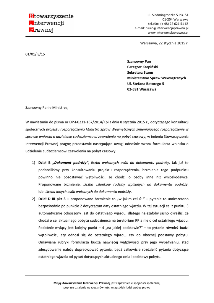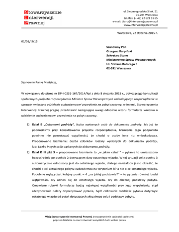 ul. Siedmiogrodzka 5 lok. 51 01-204 Warszawa tel./fax. (+ 48) 22 621 51 65 e-mail: [email protected] www.interwencjaprawna.pl Warszawa, 22 stycznia 2015 r. 01/01/IS/15 Szanowny Pan Grzegorz Karpiński Sekretarz Stanu Ministerstwo Spraw Wewnętrznych Ul. Stefana Batorego 5 02-591 Warszawa Szanowny Panie Ministrze, W nawiązaniu do pisma nr DP-I-0231-167/2014/Kpi z dnia 8 stycznia 2015 r., dotyczącego konsultacji społecznych projektu rozporządzenia Ministra Spraw Wewnętrznych zmieniającego rozporządzenie w sprawie wniosku o udzielenie cudzoziemcowi zezwolenia na pobyt czasowy, w imieniu Stowarzyszenia Interwencji Prawnej pragnę przedstawić następujące uwagi odnośnie wzoru formularza wniosku o udzielenie cudzoziemcowi zezwolenia na pobyt czasowy. 1) Dział B „Dokument podróży“, liczba wpisanych osób do dokumentu podróży. Jak już to podnosiliśmy przy konsultowaniu projektu rozporządzenia, brzmienie tego podpunktu powinno nie pozostawać wątpliwości, że chodzi o osoby inne niż wnioskodawca. Proponowane brzmienie: Liczba członków rodziny wpisanych do dokumentu podróży, lub: Liczba innych osób wpisanych do dokumentu podróży. 2) Dział D III pkt 3 – proponowane brzmienie to „w jakim celu? “ – pytanie to umieszczono bezpośrednio po punkcie 2 dotyczącym daty ostatniego wjazdu. W tej sytuacji cel z punktu 3 automatycznie odnoszony jest do ostatniego wjazdu, dlatego należałoby jasno określić, że chodzi o cel aktualnego pobytu cudzoziemca na terytorium RP a nie o cel ostatniego wjazdu. Podobnie mylący jest kolejny punkt – 4 „na jakiej podstawie?“ – to pytanie również budzi wątpliwości, czy odnosi się do ostatniego wjazdu, czy do obecnej podstawy pobytu. Omawiane rubryki formularza budzą najwięcej wątpliwości przy jego wypełnianiu, stąd zdecydowanie należy doprecyzować pytania, bądź całkowicie rozdzielić pytania dotyczące ostatniego wjazdu od pytań dotyczących aktualnego celu i podstawy pobytu. Misją Stowarzyszenia Interwencji Prawnej jest zapewnienie spójności społecznej poprzez działanie na rzecz równości wszystkich ludzi wobec prawa ul. Siedmiogrodzka 5 lok. 51 01-204 Warszawa tel./fax. (+ 48) 22 621 51 65 e-mail: [email protected] www.interwencjaprawna.pl 3) Dział E I pkt 3, E II pkt 3: Podstawa prawna działalności (nazwa rejestru i numer wpisu w rejestrze). Jest to sformułowanie bardzo urzędowe. Dlatego zamiast wykropkowanego miejsca pod spodem warto zamieścić miejsce dla wpisania numeru KRS lub CEIDG lub danych o dokumencie tożsamości. 4) Dział E III pkt 3. Podstawa prawna wykonywania pracy przez cudzoziemca Jest to sformułowanie prawne, warto je zatem wyjaśnić poprzez przykłady, wymieniając przykładowo podstawy: np. umowa o pracę, umowa zlecenie, umowa o dzieło. Niezależnie od powyższego, pozytywnie należałoby ocenić umieszczenie przed niektórymi z działów formularza, objaśnień, ze wskazaniem w jakich przypadkach dalsze części formularza nie są wypełniane. Formularz został usystematyzowany i jest bardziej przejrzysty. Jednocześnie, wyrażamy nadzieję, że powyższe uwagi będą pomocne przy wypracowaniu formularza łatwiejszego w wypełnianiu dla cudzoziemców. Łączę wyrazy szacunku dr Witold Klaus Prezes Zarządu Stowarzyszenia Interwencji Prawnej 2 Misją Stowarzyszenia Interwencji Prawnej jest zapewnienie spójności społecznej poprzez działanie na rzecz równości wszystkich ludzi wobec prawa