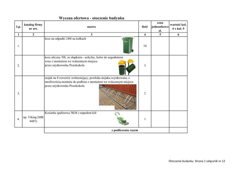 Wycena ofertowa - otoczenie budynku Lp. katalog firmy nr art. 1 2 nazwa ilość 3 4 cena wartość kol. jednostkowa 4 x kol. 5 zł. 5 6 kosz na odpadki 240l na kołkach 1. 10 kosz uliczny 50L ze słupkiem - uchylny, kolor do uzgodnienia wraz z montażem we wskazanym miejscu przez użytkownika Przedszkola 2. 3 stojak na 8 rowerów wolnostojący, powłoka stojaka ocynkowana, z możliwością montażu do podłoża z montażem we wskazanym miejscu przez użytkownika Przedszkola 3. 2 Kosiarka spalinowa 5KM z napedem kół 4. np. Viking (MB 448T) 1 z podliczenia razem Otoczenie budynku Strona 1 załącznik nr 12
