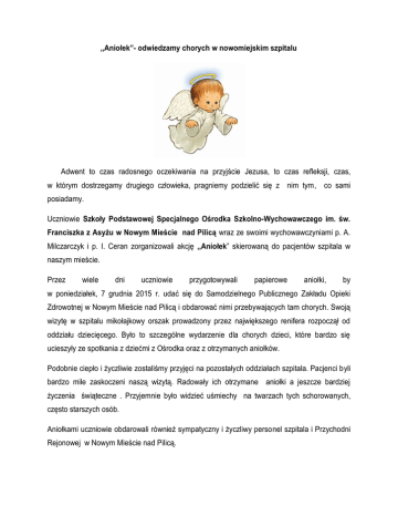 ,,Aniołek”- odwiedzamy chorych w nowomiejskim szpitalu Adwent to czas radosnego oczekiwania na przyjście Jezusa, to czas refleksji, czas, w którym dostrzegamy drugiego człowieka, pragniemy podzielić się z nim tym, co sami posiadamy. Uczniowie Szkoły Podstawowej Specjalnego Ośrodka Szkolno-Wychowawczego im. św. Franciszka z Asyżu w Nowym Mieście nad Pilicą wraz ze swoimi wychowawczyniami p. A. Milczarczyk i p. I. Ceran zorganizowali akcję ,,Aniołek” skierowaną do pacjentów szpitala w naszym mieście. Przez wiele dni uczniowie przygotowywali papierowe aniołki, by w poniedziałek, 7 grudnia 2015 r. udać się do Samodzielnego Publicznego Zakładu Opieki Zdrowotnej w Nowym Mieście nad Pilicą i obdarować nimi przebywających tam chorych. Swoją wizytę w szpitalu mikołajkowy orszak prowadzony przez największego renifera rozpoczął od oddziału dziecięcego. Było to szczególne wydarzenie dla chorych dzieci, które bardzo się ucieszyły ze spotkania z dziećmi z Ośrodka oraz z otrzymanych aniołków. Podobnie ciepło i życzliwie zostaliśmy przyjęci na pozostałych oddziałach szpitala. Pacjenci byli bardzo mile zaskoczeni naszą wizytą. Radowały ich otrzymane aniołki a jeszcze bardziej życzenia świąteczne . Przyjemnie było widzieć uśmiechy na twarzach tych schorowanych, często starszych osób. Aniołkami uczniowie obdarowali również sympatyczny i życzliwy personel szpitala i Przychodni Rejonowej w Nowym Mieście nad Pilicą. Szczególne życzenia przekazaliśmy Dyrekcji Szpitala, które przyjęła naczelna pielęgniarka p.H.Firlej. Nasza Mikołajkowa ekipa także została obdarowana słodkościami, za które serdecznie dziękujemy. Prezenty, prezenty… któż ich nie lubi! Choć niewielkie, mówią o naszej pamięci i życzliwości. mgr Agnieszka Milczarczyk