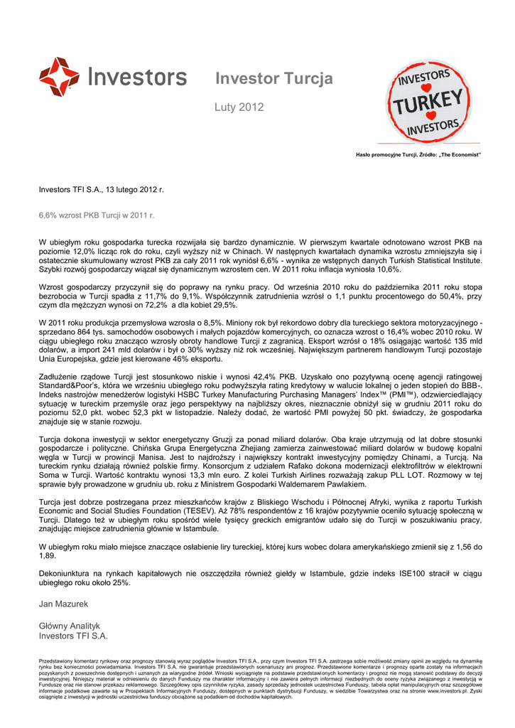 Investor Turcja Luty 2012 Hasło promocyjne Turcji, Źródło: „The Economist” Investors TFI S.A., 13 lutego 2012 r. 6,6% wzrost PKB Turcji w 2011 r. W ubiegłym roku gospodarka turecka rozwijała się bardzo dynamicznie. W pierwszym kwartale odnotowano wzrost PKB na poziomie 12,0% licząc rok do roku, czyli wyższy niż w Chinach. W następnych kwartałach dynamika wzrostu zmniejszyła się i ostatecznie skumulowany wzrost PKB za cały 2011 rok wyniósł 6,6% - wynika ze wstępnych danych Turkish Statistical Institute. Szybki rozwój gospodarczy wiązał się dynamicznym wzrostem cen. W 2011 roku inflacja wyniosła 10,6%. Wzrost gospodarczy przyczynił się do poprawy na rynku pracy. Od września 2010 roku do października 2011 roku stopa bezrobocia w Turcji spadła z 11,7% do 9,1%. Współczynnik zatrudnienia wzrósł o 1,1 punktu procentowego do 50,4%, przy czym dla mężczyzn wynosi on 72,2% a dla kobiet 29,5%. W 2011 roku produkcja przemysłowa wzrosła o 8,5%. Miniony rok był rekordowo dobry dla tureckiego sektora motoryzacyjnego sprzedano 864 tys. samochodów osobowych i małych pojazdów komercyjnych, co oznacza wzrost o 16,4% wobec 2010 roku. W ciągu ubiegłego roku znacząco wzrosły obroty handlowe Turcji z zagranicą. Eksport wzrósł o 18% osiągając wartość 135 mld dolarów, a import 241 mld dolarów i był o 30% wyższy niż rok wcześniej. Największym partnerem handlowym Turcji pozostaje Unia Europejska, gdzie jest kierowane 46% eksportu. Zadłużenie rządowe Turcji jest stosunkowo niskie i wynosi 42,4% PKB. Uzyskało ono pozytywną ocenę agencji ratingowej Standard&Poor’s, która we wrześniu ubiegłego roku podwyższyła rating kredytowy w walucie lokalnej o jeden stopień do BBB-. Indeks nastrojów menedżerów logistyki HSBC Turkey Manufacturing Purchasing Managers’ Index™ (PMI™), odzwierciedlający sytuację w tureckim przemyśle oraz jego perspektywy na najbliższy okres, nieznacznie obniżył się w grudniu 2011 roku do poziomu 52,0 pkt. wobec 52,3 pkt w listopadzie. Należy dodać, że wartość PMI powyżej 50 pkt. świadczy, że gospodarka znajduje się w stanie rozwoju. Turcja dokona inwestycji w sektor energetyczny Gruzji za ponad miliard dolarów. Oba kraje utrzymują od lat dobre stosunki gospodarcze i polityczne. Chińska Grupa Energetyczna Zhejiang zamierza zainwestować miliard dolarów w budowę kopalni węgla w Turcji w prowincji Manisa. Jest to najdroższy i największy kontrakt inwestycyjny pomiędzy Chinami, a Turcją. Na tureckim rynku działają również polskie firmy. Konsorcjum z udziałem Rafako dokona modernizacji elektrofiltrów w elektrowni Soma w Turcji. Wartość kontraktu wynosi 13,3 mln euro. Z kolei Turkish Airlines rozważają zakup PLL LOT. Rozmowy w tej sprawie były prowadzone w grudniu ub. roku z Ministrem Gospodarki Waldemarem Pawlakiem. Turcja jest dobrze postrzegana przez mieszkańców krajów z Bliskiego Wschodu i Północnej Afryki, wynika z raportu Turkish Economic and Social Studies Foundation (TESEV). Aż 78% respondentów z 16 krajów pozytywnie oceniło sytuację społeczną w Turcji. Dlatego też w ubiegłym roku spośród wiele tysięcy greckich emigrantów udało się do Turcji w poszukiwaniu pracy, znajdując miejsce zatrudnienia głównie w Istambule. W ubiegłym roku miało miejsce znaczące osłabienie liry tureckiej, której kurs wobec dolara amerykańskiego zmienił się z 1,56 do 1,89. Dekoniunktura na rynkach kapitałowych nie oszczędziła również giełdy w Istambule, gdzie indeks ISE100 stracił w ciągu ubiegłego roku około 25%. Jan Mazurek Główny Analityk Investors TFI S.A. Przedstawiony komentarz rynkowy oraz prognozy stanowią wyraz poglądów Investors TFI S.A., przy czym Investors TFI S.A. zastrzega sobie możliwość zmiany opinii ze względu na dynamikę rynku bez konieczności powiadamiania. Investors TFI S.A. nie gwarantuje przedstawionych scenariuszy ani prognoz. Przedstawione komentarze i prognozy oparte zostały na informacjach pozyskanych z powszechnie dostępnych i uznanych za wiarygodne źródeł. Wnioski wyciągnięte na podstawie przedstawionych komentarzy i prognoz nie mogą stanowić podstawy do decyzji inwestycyjnej. Niniejszy materiał w odniesieniu do danych Funduszy ma charakter informacyjny i nie zawiera pełnych informacji niezbędnych do oceny ryzyka związanego z inwestycją w Fundusze oraz nie stanowi przekazu reklamowego. Szczegółowy opis czynników ryzyka, zasady sprzedaży jednostek uczestnictwa Funduszy, tabela opłat manipulacyjnych oraz szczegółowe informacje podatkowe zawarte są w Prospektach Informacyjnych Funduszy, dostępnych w punktach dystrybucji Funduszy, w siedzibie Towarzystwa oraz na stronie www.investors.pl. Zyski osiągnięte z inwestycji w jednostki uczestnictwa funduszy obciążone są podatkiem od dochodów kapitałowych.