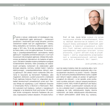 Jacek Golak Teoria układów kilku nukleonów P ytanie o naturę i właściwości sił działających między składnikami jąder atomowych – nukleonami (protonami i neutronami) jest wciąż aktualne, pomimo wieloletnich badań nad tym zagadnieniem i wiedzy, którą zdobyliśmy od momentu odkrycia jądra atomowego w 1911 roku. To te siły są odpowiedzialne za to, że mamy takie, a nie inne jądra atomowe. To one decydują o prawdopodobieństwach zachodzenia reakcji jądrowych i rozpadów promieniotwórczych, w tym tych kluczowych dla energetyki jądrowej. Układy kilkunukleonowe są idealnym laboratorium do badania sił jądrowych. Dla takich układów możemy dokładnie rozwiązać fundamentalne równania, które prowadzą od oddziaływań pomiędzy nukleonami do właściwości jąder (energia wiązania, rozmiary, rozkład materii i ładunku elektrycznego) i prawdopodobieństwa różnych reakcji jądrowych. Dla układu trzech nukleonów (3N) równania te nazywane są równaniami Faddeeva. Jako magistrant, doktorant, a potem pracownik w Zakładzie Fizyki Jądrowej Instytutu Fizyki UJ, włączyłem się do badań teoretycznych prowadzonych przez prof. Henryka Witałę we współpracy z prof. Walterem Gloeckle z Uniwersytetu Ruhry w Bochum w Niemczech. Wielkim sukcesem tych badaczy, i jednym z największych osiągnięć w tej dziedzinie fizyki pod koniec XX wieku, było ścisłe rozwiązanie równania Faddeeva dla procesu rozpraszania nukleon-deuteron. W stanie końco- Prof. dr hab. Jacek Golak zajmuje się opisem teoretycznym układów kilkunukleonowych, które są idealnym laboratorium do badania sił działających między podstawowymi składnikami jąder atomowych. W badaniach prowadzonych w Zakładzie Fizyki Jądrowej wykorzystuje najszybsze superkomputery zawierające dziesiątki tysięcy procesorów, a wyniki obliczeń służą do projektowania i analizy eksperymentów przeprowadzanych w najnowocześniejszych centrach badawczych, m.in. w Niemczech, USA i Japonii. [email protected] wym tej reakcji możemy mieć do czynienia albo z tymi samymi cząstkami (rozpraszanie sprężyste), albo z rozszczepieniem deuteronu na proton i neutron. Okazało się, że wyliczone prawdopodobieństwa wylotu cząstek pod różnymi kątami zależą od postaci sił jądrowych przyjętych do obliczeń, i w ten sposób, przez porównanie wyników obliczeń z danymi eksperymentalnymi, możemy ocenić, który model sił jądrowych jest lepszy. Badania, w których uczestniczyłem wykazały też jasno, że w układzie trzech i o większej liczbie nukleonów występują nie tylko oddziaływania między dwoma nukleonami, ale także oddziaływanie trójnukleonowe, w którym jednocześnie udział biorą trzy nukleony. 91 Jacek Golak W moich badaniach wykorzystuję rozwiązania równań Faddeeva do opisu procesów, w których występują nie tylko trzy nukleony, ale także inne cząstki. Na rys. 1 przedstawiłem schematycznie rozpraszanie elektronów na jądrze 3He. Taki proces nie zachodzi bezpo- Rys. 1 średnio, ale przez wymianę wirtualnego fotonu (g) między elektronem i 3He. Nawet w najprostszej sytuacji, gdy znamy tylko parametry początkowego elektronu przyspieszonego przez akcelerator (A) i końcowego elektronu rejestrowanego w detektorze (D), musimy uwzględnić wiele możliwości oddziaływania g z 3He, np. rozpad 3He na proton i deuteron lub na dwa protony i neutron. Należy uwzględnić skomplikowany mechanizm wyłapania fotonu przez układ 3N: ten proces może zajść z udziałem jednego, dwóch lub 92 Rys. 2 nawet trzech nukleonów (rys. 2). Wreszcie wylatujące nukleony nie są cząstkami swobodnymi, ale oddziałują ze sobą, opuszczając obszar reakcji. Te oddziaływania w stanie końcowym są przedstawione na rys. 1 w postaci falistych linii. W podobny sposób możemy opisać reakcje, w których różne cząstki (fotony, piony, miony, neutrina itp.) oddziałują z układami 3N. Obecnie w naszej Grupie Teorii Układów Kilkunukleonowych, oprócz prof. Witały i mnie, pracują dr hab. Roman Skibiński oraz doktoranci, mgr Kacper Topolnicki i mgr Alaa E. Elmeshneb. W badaniach wykorzystujemy potężne superkomputery zawierające dziesiątki tysięcy procesorów. Nasze obliczenia służą do projektowania i analizy eksperymentów przeprowadzanych w najnowocześniejszych centrach badawczych, m.in. w Niemczech, USA i Japonii. Obecnie koncentrujemy się na wykorzystaniu najnowszych, tzw. chiralnych, sił jądrowych, wyprowadzonych z fundamentalnej teorii opisującej silne oddziaływania kwarków (QCD).