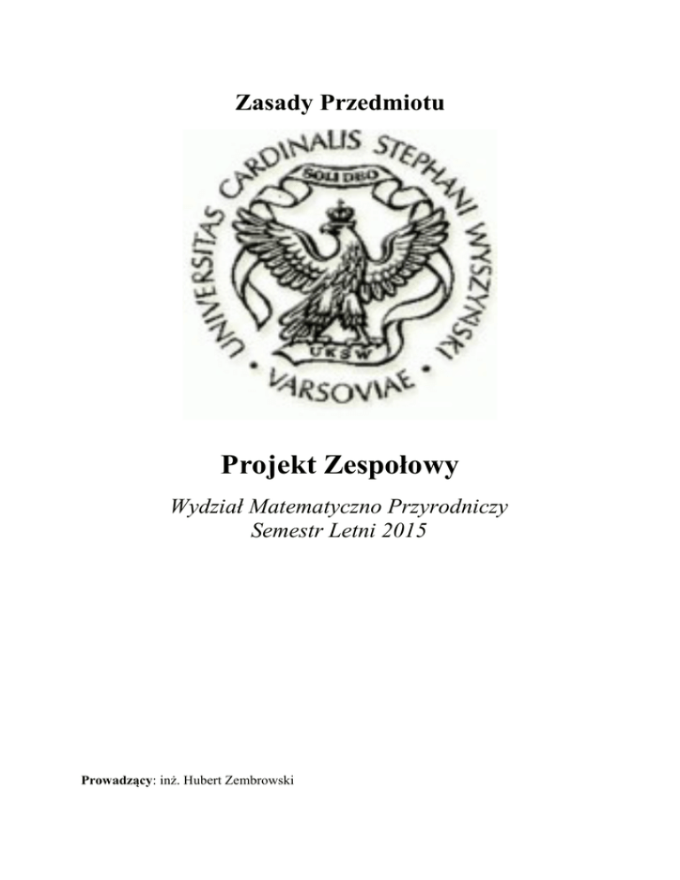 Zasady Przedmiotu Projekt Zespołowy Wydział Matematyczno Przyrodniczy Semestr Letni 2015 Prowadzący: inż. Hubert Zembrowski 2 1. Zasady Ogólne Zespoły minimum 2, maksymalnie 4 osobowe, chyba, że projekt posiada inny zakres osobowy. Podział ról i obowiązków leży w gestii zespołu projektowego. Każdy zespół posiada lidera. Tylko lider ma prawo komunikacji ze mną w każdej sprawie. Lider także ustala pólę procentową wkładu każdego członka zespołu. Ocena końcowa wynika z zrealizowanych punktów z Kryterium Akceptacji oraz terminowości ich wykonania. Kryterium Akceptacji zostanie przekazane na poszczególne zadanie do wykonania, zawierać będą informacje na ocenę 3 , 4 oraz 5. Spełnienie wymogów na ocenę 3 spowoduje ocenę maksymalnie 3. Nie ma możliwości zbudowania niepłnego mechanizmu na ocenę 3 i części na 4. Ocena wówczas jest 2. Do kolejnych kroków zespół powinien przejść po zrealizowaniu pełnych wymagań na daną ocenę. Ostatecznym terminem oddania projektu są przedostatnie i ostatnie zajęcia (po 2 grupy na zajęcia). Jeśli zespół będzie zawierał osoby z 2 grup o przynależności osób do grupy decyduje liczebność osób z danej gurpy. Przy równej liczebności decyduje prowadzący odczytując informacje z USOS z dnia 16.02.2015. Proszę dobierać grupy rozsądnie, nie ma możliwości modyfikowania składu zespołu – ale jest możliwość wykazania, że dana osoba pracowała na 0%. Nie obowiązuje jednak żadna taryfa ulgowa i osłabiony zespół musi wykonać wszystkie punkty z Kryterium Akceptacji. Do pokazywania postępów prac używać będziemy repozytorium SVN. 2. Tematyka prac 2.1. Projekt Sieciowy 2.1.1. Aplikacja – Sniffer (np. winpcap + java) (dla 2 osób) 2.1.2. Monitorowanie węzłów sieci na bazie róznych protokołów (Syslog, RMON, SNMP). 2.2. Projekt Wirtualizacyjny 2.2.1. P2V wirtualizacja rzeczywistego hosta oraz przeprowadzenie testów maszyny w dwóch wariantach (dla 2 osób) na kilku platformach (VirtualBOX, Vmware, Microsoft Hyper-V) 2.3. Programowanie MQL System automatycznego prowadzenia transakcji w języku MQL (tzw. Expert Advisor) (dla 2 osób) na platformę Meta Trader. 2.4. Systemy IVR System na bazie Voxeo System na bazie Asterisk 2.5. Projekty Developerskie 2.5.1. Aplikacje: CRM (Customer Relationship Management), Zarządzanie Relacjami z Klientami ERP (Enterprise Resource Planing), Aplikacja Magazynowa Aplikacja Bankowa miniZUS CMS (Content Management System), System Zarządzania Treścią E-Dziekanat Kurnik 2.5.2. Zakres 3 Wybór jednego języka programowania (np. PHP, C#, Java, JSP) Wybór Serwera Aplikacji (np. JBoss,Apache Tomcat,GlassFish) Opcjonalnie wybór Frameworka (np. Hibernate, Zend, Spring, Struts) Serwer aplikacji ani Fremowrk nie może być ani CMS (Content Management System) ani CMF (Content Management Framework) Wybór Systemu Zarządzania Bazą Danych (SZBD) przechowującej dane aplikacji (MS-SQL, PostgreSQL, Oracle SQL,MySQL)) Zbudowanie środowiska developerskiego (dwie maszyny wirtualne, jedna dla aplikacji, druga dla BD) Opracowanie dokumentacji projektowej Zrealizowanie Kryterium Akceptacji (wymagania funkcjonalne i nie funkcjonalne) Nie ma możliwości realizacji zadania w identycznej technologii przez więcej niż 1 zespół (należy wówczas wybrać inny serwer aplikacji i framework). Wymaganie naliczane jest odrębnie dla oby grup. Zatem maksymalnie 2 identyczne technologie na obie grupy. 3. Kalendarium 16.02.2015 Pierwsze zajęcia Omówienie Zasad. 23.02.2015 23.59 Mija termin zgłaszania własnych inicjatyw Własną inicjatywę zgłasza Lider zespołu podając jego skład oraz tematykę do realizacji wg klucza z punktu nr 2 (temat, technologia, opis funkcjonalny w paru zdaniach). Temat maila powinien zawierać słowo kluczowe PZ np. PZ wybór projektu Odpowiem na maila nie później niż do 01.03.2015 informując, czy ten temat jest możliwy do realizacji w takiej formie i z taką liczebnością zespołu. 02.03.2015 Wybór tematów do realizacji. W przypadku Projektu Developerskiego należy skonkretyzować już język, serwer aplikacji, oraz zastosowany mechanizm bazodanowy. W tym dniu 100% osób dostaje projekt i rozpoczyna pracę. 09.03.2015 Dostarczenie Kryterium Akceptacji dla poszczególnych projektów. Są to zadania szczegółowe dla każdej grupy do wykonania. Zawierać będą informacje co zrobić na ocenę 3, 4 oraz 5. Dostarczone one zostaną na pocztę lidera grupy. 30.03.2015 Termin Podsumowania pierwszego etapu prac Jest to termin obowiązkowy dla każdego członka zespołu, przewiduje rozmowę około 20 minut na grupę. 20.04.2015 Termin Podsumowania drugiego etapu prac Jest to termin obowiązkowy dla każdego członka zespołu, przewiduje rozmowę około 20 minut na grupę. 01.06.2015 dzień oddawnia projektów W tym dniu przypada termin oddania projektu. Przewiduję rozmowę około 40 minut na grupę. 4 08.06.2015 dzień oddawania projektów. W tym dniu przypada termin oddania projektu. Przewiduję rozmowę około 40 minut na grupę. 5