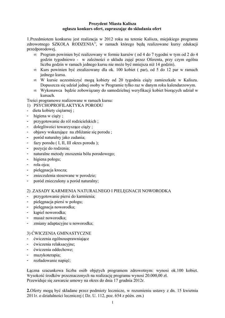 Prezydent Miasta Kalisza ogłasza konkurs ofert, zapraszając do składania ofert 1.Przedmiotem konkursu jest realizacja w 2012 roku na terenie Kalisza, miejskiego programu zdrowotnego SZKOŁA RODZENIA”, w ramach którego będą realizowane kursy edukacji przedporodowej. • Program powinien być realizowany w formie kursów ( od 4 do 7 tygodni w tym od 2 do 4 godzin tygodniowo - w zależności o układu zajęć przez Oferenta, przy czym ogólna liczba godzin w ramach jednego kursu nie może być mniejsza niż 14 godzin). • Kurs powinien być zrealizowany dla ok. 100 kobiet ( par), od 5 do 12 par w ramach jednego kursu. • W kursie uczestniczyć mogą kobiety od 20 tygodnia ciąży zamieszkałe w Kaliszu. Dopuszcza się udział jednej osoby w Programie tylko raz w danym roku kalendarzowym. • Wykonawca będzie zobowiązany do samodzielnej weryfikacji kobiet biorących udział w kursach. Treści programowe realizowane w ramach kursu: 1) PSYCHOPROFILAKTYKA PORODU - dieta kobiety ciężarnej ; - higiena w ciąży ; - przygotowanie do ról rodzicielskich ; - dolegliwości towarzyszące ciąży ; - objawy wskazujące na zbliżanie się porodu ; - poród naturalny jako zadania; - fazy porodu ( I, II, III okres porodu ); - pozycje do rodzenia; - naturalne metody znoszenia bólu porodowego; - higiena połogu; - rola ojca; - pielęgnacja krocza; - znieczulenia stosowane w porodzie; - poród znieczulony a poród naturalny; 2) .ZASADY KARMIENIA NATURALNEGO I PIELĘGNACJI NOWORODKA - przygotowanie piersi do karmienia; - pielęgnacja piersi w połogu; - pielęgnacja noworodka; - kąpiel noworodka; - masaż noworodka; - zmiany adaptacyjne u noworodka; 3) ĆWICZENIA GMINASTYCZNE - ćwiczenia ogólnousprawniające - ćwiczenia relaksacyjne; - ćwiczenia oddechowe; - muzykoterapia; - rozładowanie napięć; Łączna szacunkowa liczba osób objętych programem zdrowotnym: wynosi ok.100 kobiet. Wysokość środków przeznaczonych na realizację programu wynosi 20.000,00 zł. Przewiduje się zawarcie umowy na okres do dnia 17 grudnia 2012r. 2.Oferty mogą być składane przez podmioty lecznicze, w rozumieniu ustawy z dn. 15 kwietnia 2011r. o działalności leczniczej ( Dz. U. 112, poz. 654 z późn. zm.) 1 3. Oferenci zobowiązani są złożyć następujące dokumenty: 1) ofertę na przygotowanym przez organizatora formularzu ofertowym – formularz ofertowy dostępny na stronie internetowej Urzędu Miejskiego w Kaliszu: www.bip.kalisz.pl lub w Wydziale Spraw Społecznych i Mieszkaniowych Urzędu Miejskiego w Kaliszu, ul. Kościuszki 1a, pok. Nr 104 ( I piętro). Formularz ofertowy zawiera m.in. następujące informacje: - dane oferenta - kalkulację kosztów, w tym m.in. wyliczoną wysokość środków publicznych, którą może uzyskać dany podmiot wykonujący działalność leczniczą – zgodnie z art. 114 ust. 2-4 ustawy z dnia 15 kwietnia 2011r. o działalności leczniczej ( Dz. U. Nr 112, poz. 654. z późn. zm.) ze wskazaniem danych będących podstawą wyliczeń. - liczbę i kwalifikacje osób wykonujących badania w ramach programu - inne informacje, w tym m.in. warunki lokalowe, posiadane aparatura i sprzęt medyczny i inne dane. 2) aktualny wypis do rejestrów: sądowego, wojewody, właściwych izb lub inny dokument zezwalający na prowadzenie działalności 3) statut zakładu 4) zaświadczenie o numerze NIP, 5) decyzja o numerze identyfikacyjnym REGON, 6) kopia aktualnej polisy ubezpieczeniowej 7) udokumentowane informacje o kwalifikacjach osób realizujących badania w ramach programu, (dopuszcza się uwierzytelnienie dokumentów za zgodność z oryginałem przez osobę uprawnioną do reprezentowania oferenta ) 8) Oświadczenia: a) oświadczenie oferenta o zapoznaniu się z treścią ogłoszenia, warunkami konkursu i regulaminem organizowania konkursu b) oświadczenie, że sprzęt medyczny, używany do realizacji badań, spełnia wymogi, określone w ustawie z dnia 20.05.2010r. o wyrobach medycznych ( Dz. U. Nr 107, poz. 679 z późn. zm.) c) oświadczenia o wyrażeniu zgody na przetwarzania danych osobowych zgodnie z ustawą z dn.29.08.1997r. o ochronie danych osobowych ( Dz.U.2002, Nr 101, poz. 926 z późn.zm.) podpisane przez wszystkie osoby, które są wskazane w Rubryce III formularza ofertowego. 4. Zainteresowani mogą zapoznać się z Regulaminem organizowania konkursu dostępnym na oraz na stronie internetowej Urzędu Miejskiego w Kaliszu: www.bip.kalisz.pl lub w Wydziale Spraw Społecznych i Mieszkaniowych Urzędu Miejskiego w Kaliszu, ul. Kościuszki 1a, pok. Nr 104 ( I piętro). 5. Oferty należy składać w zaklejonych kopertach do Wydziału Spraw Społecznych i Mieszkaniowych Urzędu Miejskiego w Kaliszu przy ul. Kościuszki 1a, / I piętro, pok. nr 120 – sekretariat/, w terminie do 24 lutego 2012r. do godz.15.30. Koperta z ofertą powinna być oznakowana następująco: „Nazwa i adres podmiotu składającego ofertę”, opis oferty „Oferta na realizację w 2012r. miejskiego programu Szkoła Rodzenia”. Wszystkie koszty związane ze sporządzeniem i złożeniem oferty ponosi Oferent. Oferty złożone po terminie nie będą rozpatrywane i zostaną zwrócone Oferentom bez otwierania koperty, o ile była ona zamknięta i zaklejona. 6.Wyboru oferty dokona Prezydent Miasta Kalisza - na podstawie merytorycznej i finansowej oceny ofert przez Komisję Konkursową - do dnia 5 marca 2012 r. Wyniki konkursu zostaną podane oferentom na piśmie oraz przekazane do publicznej wiadomości w formie informacji zamieszczonej na tablicy ogłoszeń Urzędu Miejskiego w Kaliszu ul. Główny Rynek 20 oraz stronie internetowej: www.bip.kalisz.pl. 2 7. Komisja Konkursowa dokona oceny złożonych ofert wg następujących kryteriów: 1) W pierwszej części konkursu oferty będą oceniane pod względem formalnym ( komplet dokumentów). Oferty sporządzone wadliwie bądź niekompletne co do wymaganego zestawu dokumentów lub informacji nie będą rozpatrywane ze względów formalnych. 2) W dru
