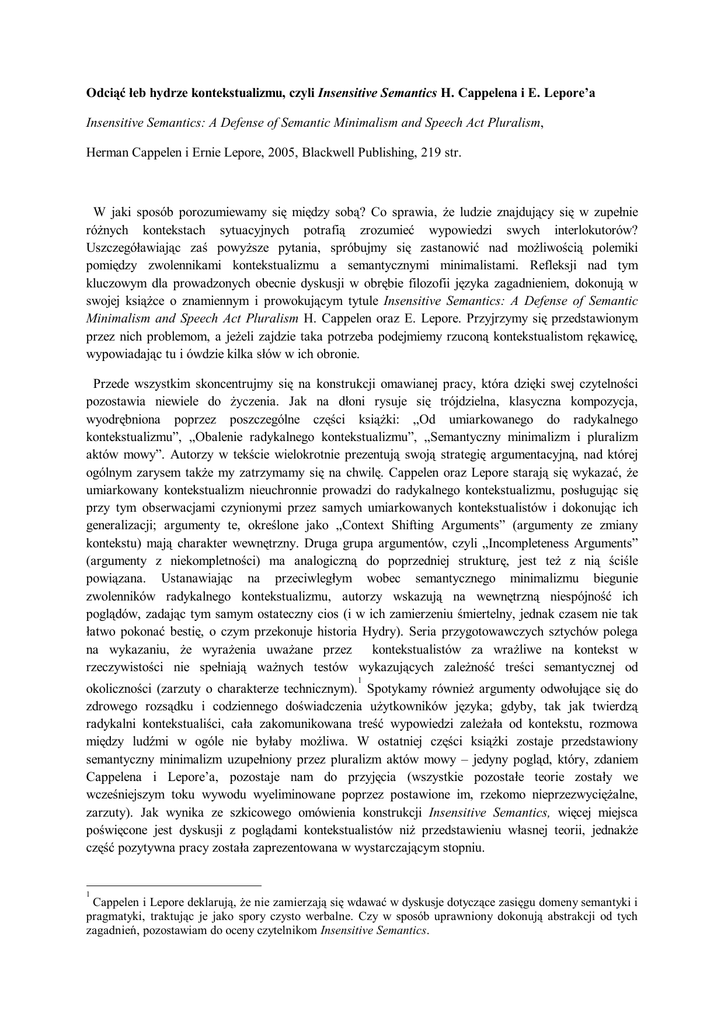 Odciąć łeb hydrze kontekstualizmu, czyli Insensitive Semantics H. Cappelena i E. Lepore’a Insensitive Semantics: A Defense of Semantic Minimalism and Speech Act Pluralism, Herman Cappelen i Ernie Lepore, 2005, Blackwell Publishing, 219 str. W jaki sposób porozumiewamy się między sobą? Co sprawia, że ludzie znajdujący się w zupełnie różnych kontekstach sytuacyjnych potrafią zrozumieć wypowiedzi swych interlokutorów? Uszczegóławiając zaś powyższe pytania, spróbujmy się zastanowić nad możliwością polemiki pomiędzy zwolennikami kontekstualizmu a semantycznymi minimalistami. Refleksji nad tym kluczowym dla prowadzonych obecnie dyskusji w obrębie filozofii języka zagadnieniem, dokonują w swojej książce o znamiennym i prowokującym tytule Insensitive Semantics: A Defense of Semantic Minimalism and Speech Act Pluralism H. Cappelen oraz E. Lepore. Przyjrzymy się przedstawionym przez nich problemom, a jeżeli zajdzie taka potrzeba podejmiemy rzuconą kontekstualistom rękawicę, wypowiadając tu i ówdzie kilka słów w ich obronie. Przede wszystkim skoncentrujmy się na konstrukcji omawianej pracy, która dzięki swej czytelności pozostawia niewiele do życzenia. Jak na dłoni rysuje się trójdzielna, klasyczna kompozycja, wyodrębniona poprzez poszczególne części książki: „Od umiarkowanego do radykalnego kontekstualizmu”, „Obalenie radykalnego kontekstualizmu”, „Semantyczny minimalizm i pluralizm aktów mowy”. Autorzy w tekście wielokrotnie prezentują swoją strategię argumentacyjną, nad której ogólnym zarysem także my zatrzymamy się na chwilę. Cappelen oraz Lepore starają się wykazać, że umiarkowany kontekstualizm nieuchronnie prowadzi do radykalnego kontekstualizmu, posługując się przy tym obserwacjami czynionymi przez samych umiarkowanych kontekstualistów i dokonując ich generalizacji; argumenty te, określone jako „Context Shifting Arguments” (argumenty ze zmiany kontekstu) mają charakter wewnętrzny. Druga grupa argumentów, czyli „Incompleteness Arguments” (argumenty z niekompletności) ma analogiczną do poprzedniej strukturę, jest też z nią ściśle powiązana. Ustanawiając na przeciwległym wobec semantycznego minimalizmu biegunie zwolenników radykalnego kontekstualizmu, autorzy wskazują na wewnętrzną niespójność ich poglądów, zadając tym samym ostateczny cios (i w ich zamierzeniu śmiertelny, jednak czasem nie tak łatwo pokonać bestię, o czym przekonuje historia Hydry). Seria przygotowawczych sztychów polega na wykazaniu, że wyrażenia uważane przez kontekstualistów za wrażliwe na kontekst w rzeczywistości nie spełniają ważnych testów wykazujących zależność treści semantycznej od 1 okoliczności (zarzuty o charakterze technicznym). Spotykamy również argumenty odwołujące się do zdrowego rozsądku i codziennego doświadczenia użytkowników języka; gdyby, tak jak twierdzą radykalni kontekstualiści, cała zakomunikowana treść wypowiedzi zależała od kontekstu, rozmowa między ludźmi w ogóle nie byłaby możliwa. W ostatniej części książki zostaje przedstawiony semantyczny minimalizm uzupełniony przez pluralizm aktów mowy – jedyny pogląd, który, zdaniem Cappelena i Lepore’a, pozostaje nam do przyjęcia (wszystkie pozostałe teorie zostały we wcześniejszym toku wywodu wyeliminowane poprzez postawione im, rzekomo nieprzezwyciężalne, zarzuty). Jak wynika ze szkicowego omówienia konstrukcji Insensitive Semantics, więcej miejsca poświęcone jest dyskusji z poglądami kontekstualistów niż przedstawieniu własnej teorii, jednakże część pozytywna pracy została zaprezentowana w wystarczającym stopniu. 1 Cappelen i Lepore deklarują, że nie zamierzają się wdawać w dyskusje dotyczące zasięgu domeny semantyki i pragmatyki, traktując je jako spory czysto werbalne. Czy w sposób uprawniony dokonują abstrakcji od tych zagadnień, pozostawiam do oceny czytelnikom Insensitive Semantics. Skoro mamy już pewne pojęcie o ogólnej strategii argumentacyjnej zastosowanej przez Cappelena i Lepore’a, rozwińmy nieco najważniejsze wątki wspomniane w poprzednim akapicie. Zanim to jednak uczynimy, kilka kwestii wymaga sprecyzowania. Po pierwsze, nasuwa się pytanie, czy semantyczny minimalizm odrzuca wrażliwość na kontekst wszystkich dosłownie wyrażeń. Odpowiedź jest przecząca, gdyż autorzy Insensitive Semantics uznają pewne słowa za prawdziwie zależne od kontekstu, podają też ich listę, opierając się na fundamentalnej pracy Kaplana. Do owej uprzywilejowanej grupy, zwanej zestawem podstawowym, należą (przedstawiam trochę okrojoną wersję): zaimki osobowe, zaimki wskazujące, przysłówki takie jak „tutaj”, „teraz”, „dzisiaj”, „wczoraj”, przymiotniki, np. „obecny”. W następnej kolejności wypada z kolei rozważyć następujące zagadnienie: w jaki sposób scharakteryzowany zostaje umiarkowany i radykalny kontekstualizm (powszechnie znaną prawdą jest przecież, że zwalczyć można tylko takiego wroga, którego oblicze się poznało). Umiarkowany kontekstualizm uznaje pewne wyrażenia spoza zestawu podstawowego za zależne od okoliczności dokonania wypowiedzi, a mówiąc nieco dokładniej zdanie Z, zawierające wrażliwe na kontekst wyrażenie w, bez uwzględnienia kontekstu nie wyraża pełnego sądu, czy też nie posiada możliwych do określenia warunków prawdziwości (oczywiście trzeba uważać, żeby 2 niekompletność ta nie była zależna od innych czynników, takich jak wieloznaczność lub nieostrość). Wyrażenia wskazywane przez umiarkowanych kontekstualistów jako podlegające kształtowaniu przez kontekst to m. in.: kwantyfikatory (w zdaniu „Wszystkie czereśnie są zerwane” zasięg kwantyfikatora zostaje ograniczony przez okoliczności np. do czereśni znajdujących się w konkretnym sadzie), przymiotniki porównawcze (zdanie „Jan jest wysoki” wymaga wskazania klasy przedmiotów, z któ