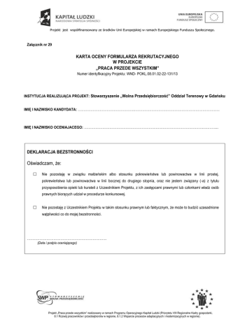 Projekt jest współfinansowany ze środków Unii Europejskiej w ramach Europejskiego Funduszu Społecznego. Załącznik nr 29 KARTA OCENY FORMULARZA REKRUTACYJNEGO W PROJEKCIE „PRACA PRZEDE WSZYSTKIM” Numer identyfikacyjny Projektu: WND- POKL.08.01.02-22-131/13 INSTYTUCJA REALIZUJĄCA PROJEKT: Stowarzyszenie „Wolna Przedsiębiorczość” Oddział Terenowy w Gdańsku IMIĘ I NAZWISKO KANDYDATA: ………………………………………….……………………………………………………………….. IMIĘ I NAZWISKO OCENIAJACEGO: …………………………………………………………………………………………..….……... DEKLARACJA BEZSTRONNOŚCI Oświadczam, że: Nie pozostaję w związku małżeńskim albo stosunku pokrewieństwa lub powinowactwa w linii prostej, pokrewieństwa lub powinowactwa w linii bocznej do drugiego stopnia, oraz nie jestem związany (-a) z tytułu przysposobienia opieki lub kurateli z Uczestnikiem Projektu, z ich zastępcami prawnymi lub członkami władz osób prawnych biorących udział w procedurze konkursowej. Nie pozostaję z Uczestnikiem Projektu w takim stosunku prawnym lub faktycznym, że może to budzić uzasadnione wątpliwości co do mojej bezstronności. …………………………………………………………… (Data i podpis oceniającego) Projekt „Praca przede wszystkim” realizowany w ramach Programu Operacyjnego Kapitał Ludzki (Priorytetu VIII Regionalne Kadry gospodarki, 8.1 Rozwój pracowników i przedsiębiorstw w regionie, 8.1.2 Wsparcie procesów adaptacyjnych i modernizacyjnych w regionie). Projekt jest współfinansowany ze środków Unii Europejskiej w ramach Europejskiego Funduszu Społecznego. I. OCENA FORMALNA A 1 Czy Formularz Rekrutacyjny wypełniony został na obowiązującym druku, jest kompletny i złożony został w wyznaczonym terminie? 2 Czy wszystkie rubryki Formularza Rekrutacyjnego wymagające wypełnienia zostały wypełnione? 3 Czy Formularz Rekrutacyjny jest podpisany we wszystkich miejscach do tego przeznaczonych? 4 Czy do Formularza Rekrutacyjnego dołączono wszystkie wymagane załączniki? 5 Czy osoba składająca Formularz Zgłoszenia złożyła wymagane oświadczenia dodatkowe? B 1 Czy Kandydat jest osobą pełnoletnią? 2 Czy Kandydat jest mieszkańcem województwa pomorskiego? 3 Czy Kandydat jest osobą bezrobotną, która utraciła pracę (w ramach stosunku pracy) z przyczyn dotyczących zakładu pracy w okresie nie dłuższym niż 6 miesięcy przed dniem przystąpienia do Projektu? 4 Czy Kandydat jest pracownikiem znajdującym się w okresie wypowiedzenia stosunku pracy lub stosunku służbowego z przyczyn dotyczących zakładu pracy? 5 6 7 Czy Kandydat oświadczył, iż nie ciążą na nim zajęcia komornicze z tytułu obowiązku alimentacyjnego? 9 Czy Kandydat planuje zarejestrowanie własnej działalności gospodarczej? 10 Czy Kandydat korzysta równolegle z innych środków publicznych, w tym zwłaszcza ze środków Funduszu Pracy, PFRON oraz środków oferowanych w ramach POKL na pokrycie tych samych wydatków związanych z podjęciem oraz prowadzeniem działalności gospodarczej? 11 Czy Kandydat posiadał zarejestrowaną działalność gospodarczą w okresie 12 miesięcy poprzedzających dzień przystąpienia do Projektu? 13 NIE NIE DOTYCZY UWAGI TAK NIE NIE DOTYCZY UWAGI Czy pracodawca, przez którego Kandydat do projektu był (jest) zatrudniona/-y, przechodził w czasie rozwiązywania z Kandydatem umowy o pracę procesy adaptacyjne, modernizacyjne lub restrukturyzacyjne? Czy pracodawca, przez którego Kandydat był (jest) zatrudniona/-y, posiada siedzibę, oddział, inną jednostkę organizacyjną, zakład produkcyjny lub inne miejsce stałego wykonywania pracy przez pracowników na terenie województwa pomorskiego? Czy Kandydat prowadzi działalność gospodarczą lub inną działalność zarobkową (w tym w szczególności na podstawie umowy cywilnoprawnej – o dzieło lub zlecenia)? 8 12 TAK Czy Kandydat złożył oświadczenie o niekaralności za przestępstwa skarbowe oraz o korzystaniu z pełni praw publicznych i posiadaniu pełnej zdolności do czynności prawnych? Czy Kandydat złożył oświadczenie o niepozostawaniu w stosunku do beneficjenta i/lub pracownika beneficjenta, partnera lub wykonawcy w związku mogącym naruszyć zasady bezstronności w procesie rekrutacji i oceny wniosków? Projekt „Praca przede wszystkim” realizowany w ramach Programu Operacyjnego Kapitał Ludzki (Priorytetu VIII Regionalne Kadry gospodarki, 8.1 Rozwój pracowników i przedsiębiorstw w regionie, 8.1.2 Wsparcie procesów adaptacyjnych i modernizacyjnych w regionie). Projekt jest współfinansowany ze środków Unii Europejskiej w ramach Europejskiego Funduszu Społecznego. 14 Czy Kandydat złożył oświadczenie o niekaralności karą zakazu dostępu do środków, o których mowa w art. 5 ust. 3 pkt 1 i 4 ustawy z dnia 27 sierpnia 2009 r. o finansach publicznych (Dz. U. Nr 157, poz. 1240, z późn. zm.). 15 Czy Kandydat posiada zdolność do samodzielnego sfinansowania działalności gospodarczej? DECYZJA W SPRAWIE POPRAWNOŚCI WNIOSKU NIE SPEŁNIA SPEŁNIA NIE DOTYCZY UWAGI Czy wniosek spełnia wszystkie ogólne kryteria formalne i może zostać przekazany do oceny merytorycznej? PRZYNALEŻNOŚĆ DO GRUP PREFEROWANYCH W PROJEKCIE - PRZYZNANE PUNKTY DODATKOWE Kandydat posiada wykształcenie co najwyżej średnie (tj. podstawowe, gimnazjalne 1 lub ponadgimnazjalne – zgodnie z klasyfikacją przedstawioną w Formularzu Rekrutacyjnym). 2 PRZYZNANA LICZBA PUNKTÓW MAKSYMALNA LICZBA PUNKTÓW UWAGI/ KOMENTARZE 3 Kandydat jest kobietą. 3 SUMA PUNKTÓW UZYSKANYCH ZE WZGLĘDU NA PRZYNALEŻNOŚĆ DO GRUP PREFEROWANYCH (maksymalna łączna wartość to 6 punktów) 6 II. OCENA MERYTORYCZNA Pytania z części C Formularza Rekrutacyjnego PRZYZNANA LICZBA PUNKTÓW MAKSYMALNA LICZBA PUNKTÓW 1 Wykształcenie i kwalifikacje oraz pozwolenia, licencje (oceniane 