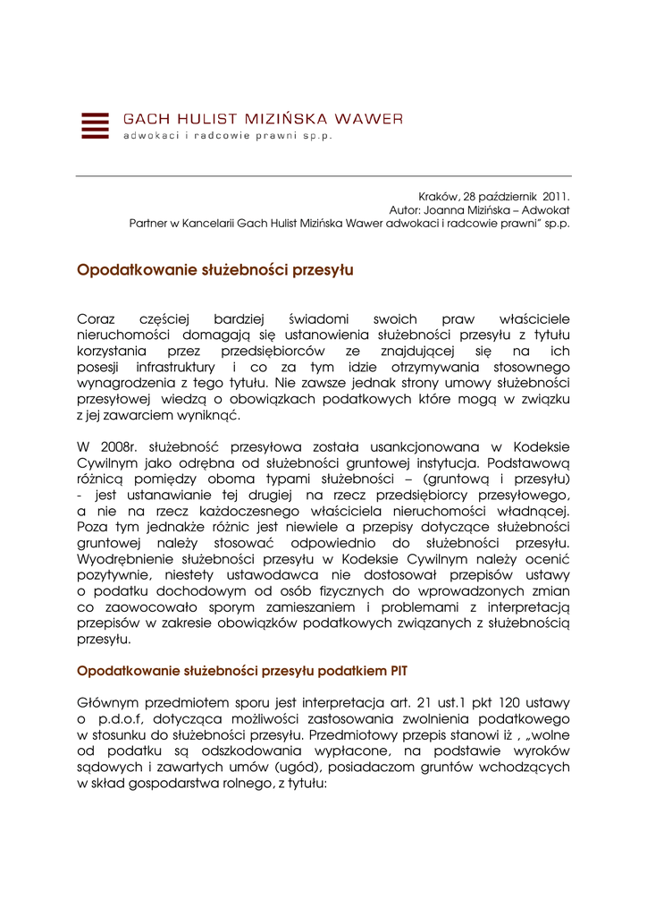 Kraków, 28 październik 2011. Autor: Joanna Mizińska – Adwokat Partner w Kancelarii Gach Hulist Mizińska Wawer adwokaci i radcowie prawni” sp.p. Opodatkowanie służebności przesyłu Coraz częściej bardziej świadomi swoich praw właściciele nieruchomości domagają się ustanowienia służebności przesyłu z tytułu korzystania przez przedsiębiorców ze znajdującej się na ich posesji infrastruktury i co za tym idzie otrzymywania stosownego wynagrodzenia z tego tytułu. Nie zawsze jednak strony umowy służebności przesyłowej wiedzą o obowiązkach podatkowych które mogą w związku z jej zawarciem wyniknąć. W 2008r. służebność przesyłowa została usankcjonowana w Kodeksie Cywilnym jako odrębna od służebności gruntowej instytucja. Podstawową różnicą pomiędzy oboma typami służebności – (gruntową i przesyłu) - jest ustanawianie tej drugiej na rzecz przedsiębiorcy przesyłowego, a nie na rzecz każdoczesnego właściciela nieruchomości władnącej. Poza tym jednakże różnic jest niewiele a przepisy dotyczące służebności gruntowej należy stosować odpowiednio do służebności przesyłu. Wyodrębnienie służebności przesyłu w Kodeksie Cywilnym należy ocenić pozytywnie, niestety ustawodawca nie dostosował przepisów ustawy o podatku dochodowym od osób fizycznych do wprowadzonych zmian co zaowocowało sporym zamieszaniem i problemami z interpretacją przepisów w zakresie obowiązków podatkowych związanych z służebnością przesyłu. Opodatkowanie służebności przesyłu podatkiem PIT Głównym przedmiotem sporu jest interpretacja art. 21 ust.1 pkt 120 ustawy o p.d.o.f, dotycząca możliwości zastosowania zwolnienia podatkowego w stosunku do służebności przesyłu. Przedmiotowy przepis stanowi iż , „wolne od podatku są odszkodowania wypłacone, na podstawie wyroków sądowych i zawartych umów (ugód), posiadaczom gruntów wchodzących w skład gospodarstwa rolnego, z tytułu: 1. służebności gruntowej, 2. rekultywacji gruntów, 3. szkód powstałych w uprawach rolnych i drzewostanie w wyniku prowadzenia na tych gruntach, przez podmioty uprawnione na podstawie odrębnych przepisów, inwestycji dotyczących budowy infrastruktury przesyłowej ropy naftowej i produktów rafinacji ropy naftowej oraz budowy urządzeń infrastruktury technicznej, o których mowa w art. 143 ust. 2 ustawy z dnia 21 sierpnia 1997 r. o gospodarce nieruchomościami”. - Do czasu wyodrębnienia instytucji służebności przesyłu opodatkowanie podatkiem dochodowym od osób fizycznych nie budziło wątpliwości, funkcja tej instytucji prawnej realizowana była w formie służebności gruntowej co pozwalało na stosowanie zwolnienia wynikającego z art.21 ust.1 pkt 120 ustawy o p.d.o.f. Problem pojawił się gdy ustawodawca wprowadzając służebność przesyłu do k.c „zapomniał” dokonać stosownego rozszerzenia hipotezy wyżej wymienionego przepisu ustawy o PIT - tłumaczy Joanna Mizińska Adwokat, Partner w Kancelarii „Gach Hulist Mizińska Wawer Adwokaci i Radcowie Prawni” sp.p. - Rozstrzygniecie kwestii możliwości stosowania przytoczonego przepisu do instytucji służebności przesyłowej jest bardzo istotne po pierwsze dla właścicieli nieruchomości którzy w razie braku zwolnienia muszą zapłacić podatek od otrzymanych kwot, a po drugie dla przedsiębiorców przesyłowych którzy nie są pewni czy ciąży na nich obowiązek sporządzania informacji o wysokości przychodów na druku PIT -8C. – dodaje mecenas Mizińska. Stanowisko organów podatkowych Stosowanie art.21 ust.1 pkt 120 ustawy o p.d.o.f do służebności przesyłu jest przedmiotem wielu sporów oraz interpretacji organów podatkowych, które twardo stoją na stanowisku braku możliwości skorzystania z przedmiotowego zwolnienia i konieczności stosowania wykładni literalnej przepisu, który obejmuje jedynie służebność gruntową. Takie stanowisko oznacza, iż odszkodowanie za ustanowienie służebności przesyłu stanowić będzie dla podatnika przychód z innych źródeł, o którym mowa w art. 10 ust. 1 pkt 9 w zw. z art. 20 ust. 1 ustawy o p.d.o.f co pociąga za sobą także określone skutki dla przedsiębiorców. Zgodnie z art. 42a ustawy o p.d.o.f są oni zobowiązani do sporządzenia informacji o wysokości przychodów i w terminie do końca lutego następnego roku podatkowego przekazania jej podatnikowi oraz urzędowi skarbowemu, którym kieruje naczelnik urzędu skarbowego właściwy według miejsca zamieszkania podatnika (druk PIT-8C). Wskazać jednakże należy, że odmienne stanowisko w tej sprawie zajmują sądy administracyjne. W niedawno zapadłym wyroku NSA stwierdził, że”przewidziana w art. 21 ust. 1 pkt 120 lit. a) u.p.d.o.f. ulga podatkowa z tytułu odszkodowania wypłaconego, na podstawie wyroków sądowych i zawartych umów (ugód), posiadaczom gruntów wchodzących w skład gospodarstwa rolnego, z tytułu ustanowienia służebności gruntowej, przysługuje także z tytułu ustanowienia służebności przesyłu jako odmiany służebności gruntowej” (wyrok NSA w Warszawie z dnia 29 września 2011 r sygn. II FSK 654/10). Z kolei w innym wyroku tj. wyroku z dnia 1 czerwca 2011 r. (sygn. II FSK 88/10) NSA uznał, że zwolnienie podatkowe z art. 21 ust.1 pkt. 120 ustawy o p.d.o.f ma zastosowanie do wszystkich świadczeń z tytułu ustanowienia służebności przesyłu – nie tylko nazwanych mianem odszkodowań lecz posiadających charakter rekompensaty (ekwiwalentu) za ograniczenie prawa własności w zakresie takich gruntów na rzecz przedsiębiorcy przesyłowego, a zatem także tych które w zawieranych umowach są określane jako wynagrodzenie. Analogicznie wypowiedział się w przedmiotowej sprawie także Wojewódzki Sąd Administracyjny w Szczecinie, który w wyroku z dnia 06 kwietnia 2011r. stwierdził, iż „…zastąpienie w sferze cywilistycznej służebności gruntowej służebnością przesyłu ustanawianych w związku z budową 